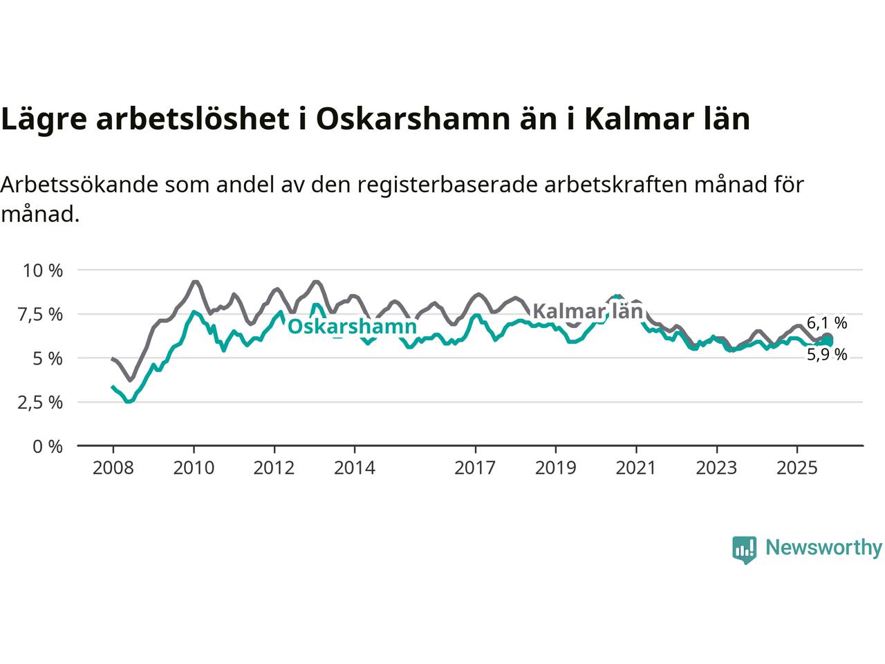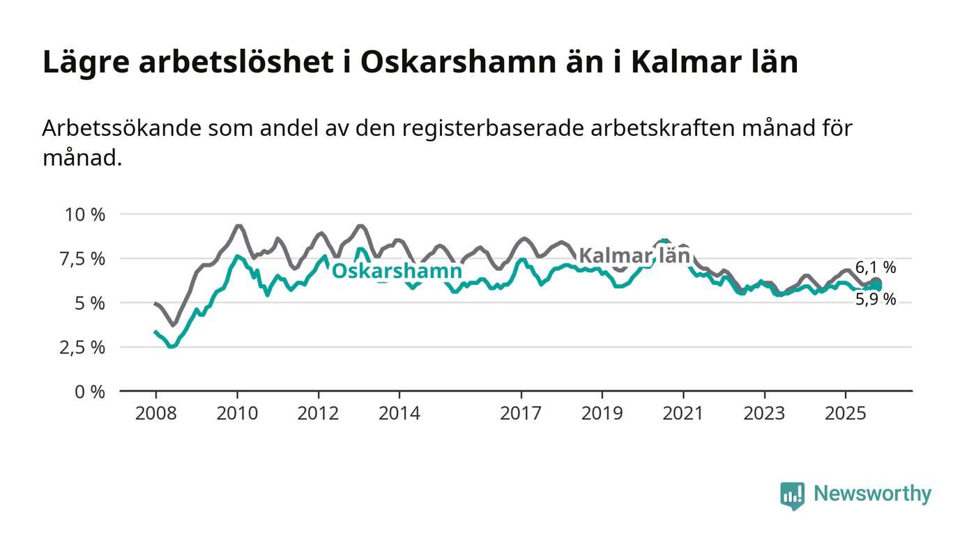 Även om arbetslösheten i Oskarshamn alltså ökar, så ligger den fortfarande under snittet i hela Kalmar län (5,9 procent i kommunen, jämfört med 6,1 procent i hela länet). Mörbylånga har den lägsta arbetslösheten i länet (3,6 procent), medan Högsby och Nybro har den högsta (7,8 procent). För att Oskarshamn skulle komma ner i samma arbetslöshetsnivå som Mörbylånga skulle 301 personer behöva sysselsättas.
