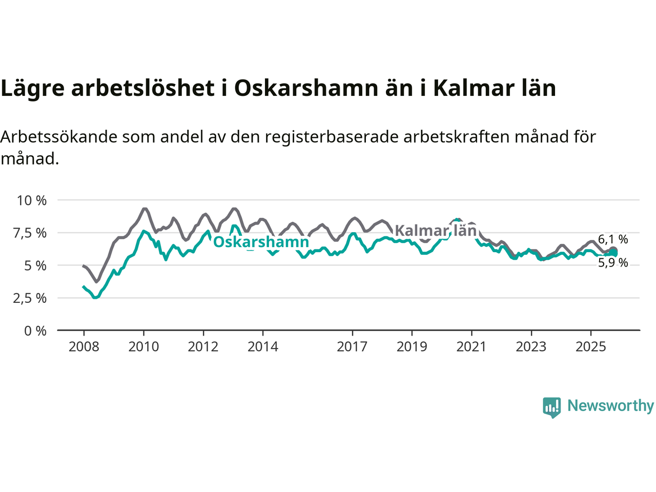 Under oktober månad rapporterade Oskarshamns kommun en total arbetslöshet på 5,9 procent. Det är en ökning jämfört med samma tidpunkt i fjol (+0,1 procentenheter). I Kalmar län däremot sjunker arbetslösheten .