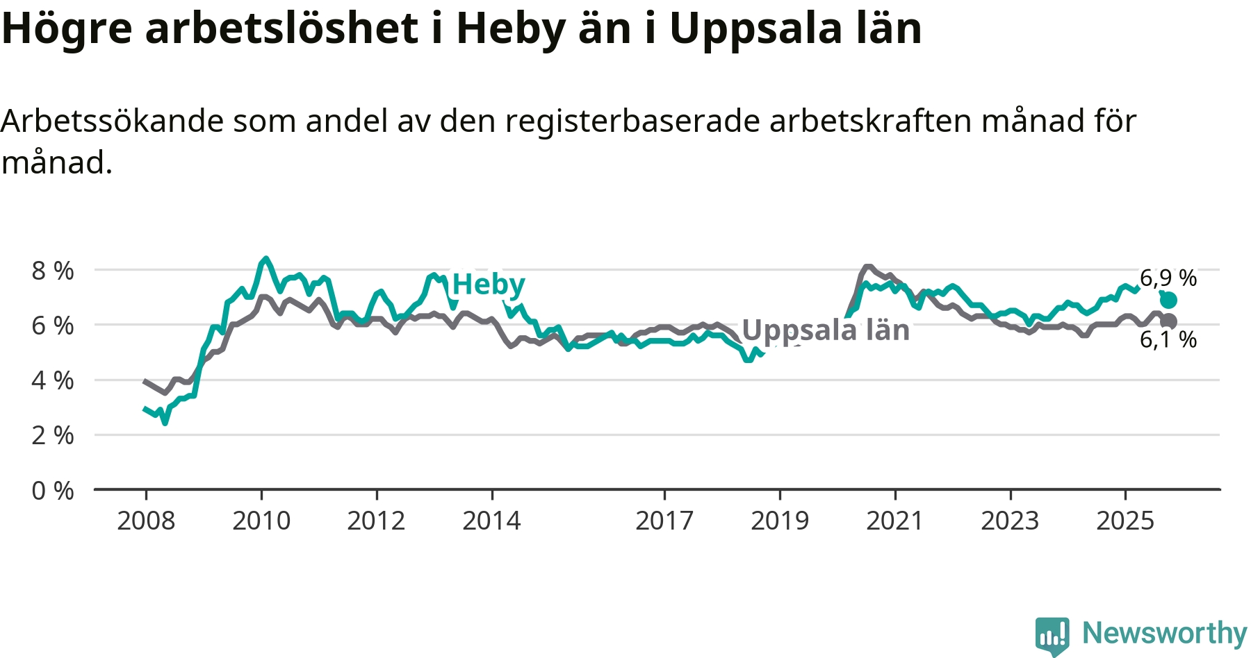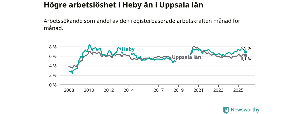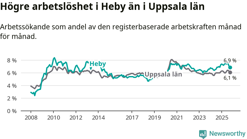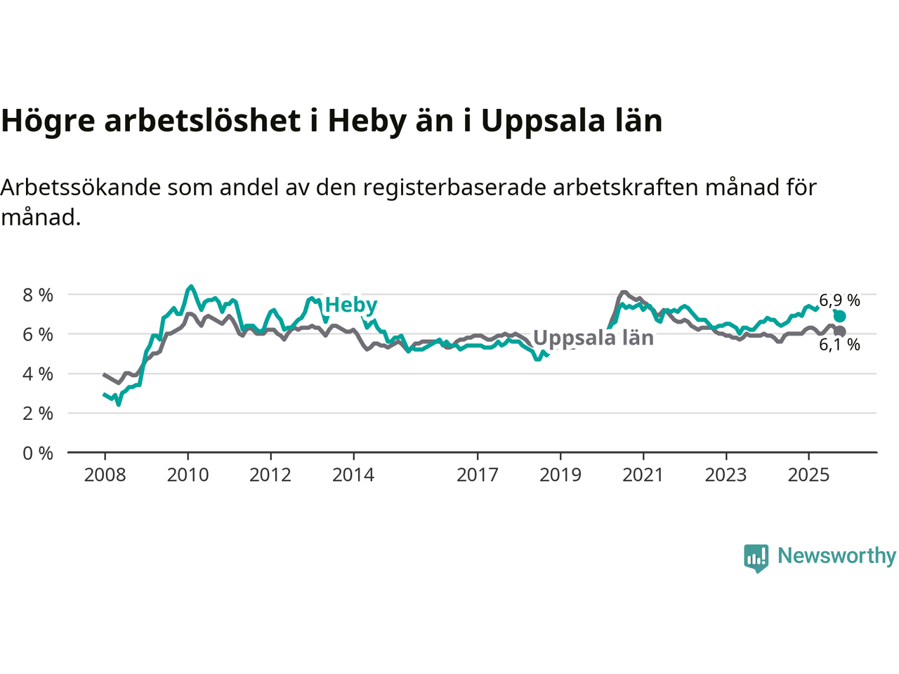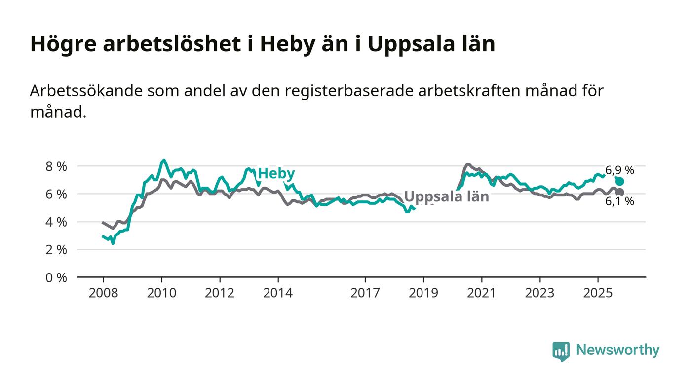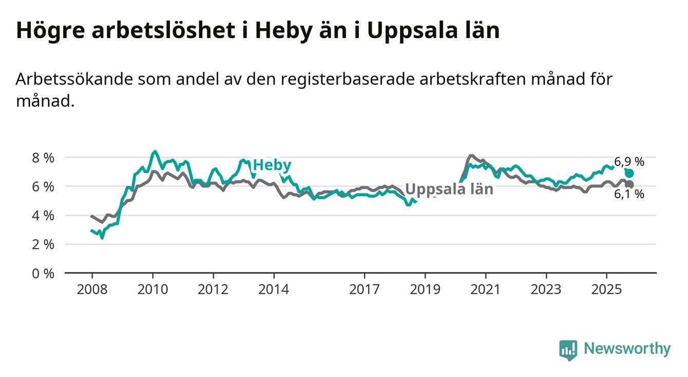 Under oktober månad rapporterade Heby kommun en total arbetslöshet på 6,9 procent. Det är en minskning jämfört med samma tidpunkt i fjol (−0,1 procentenheter). I Uppsala län däremot stiger arbetslösheten något.
