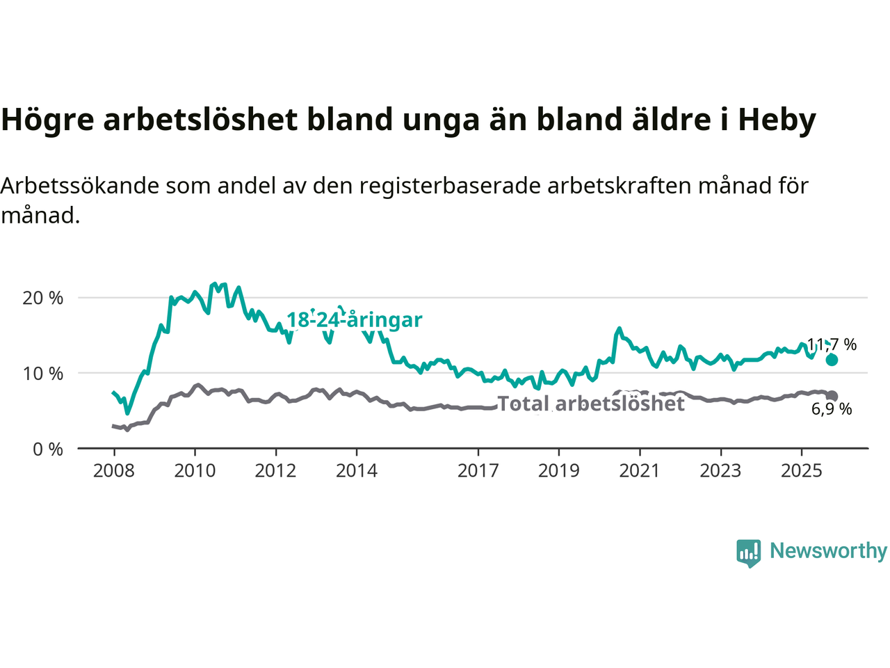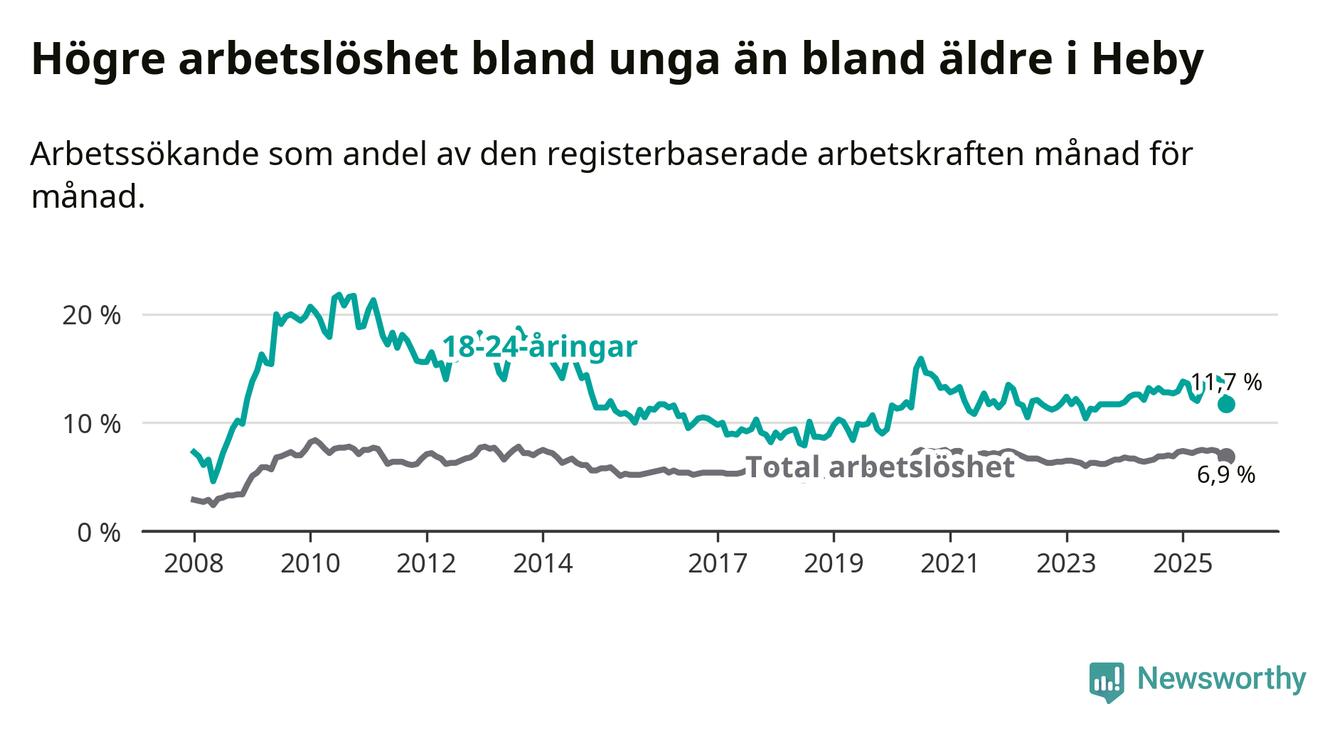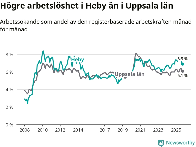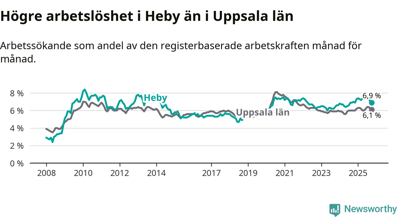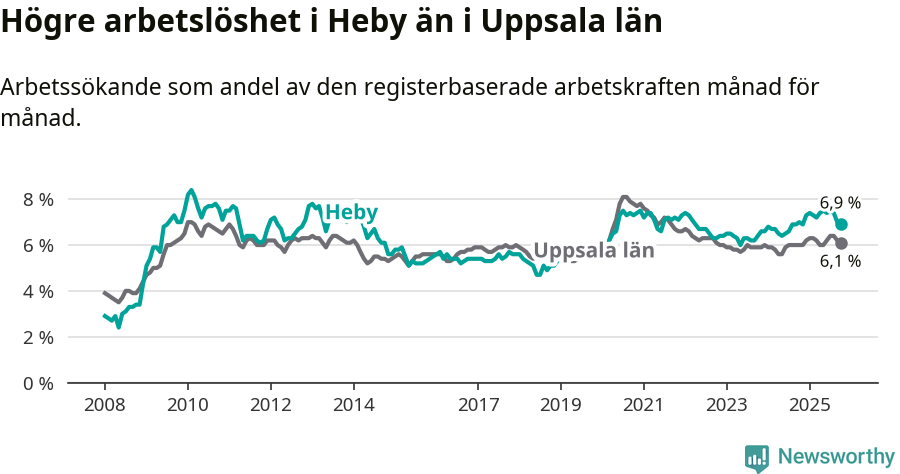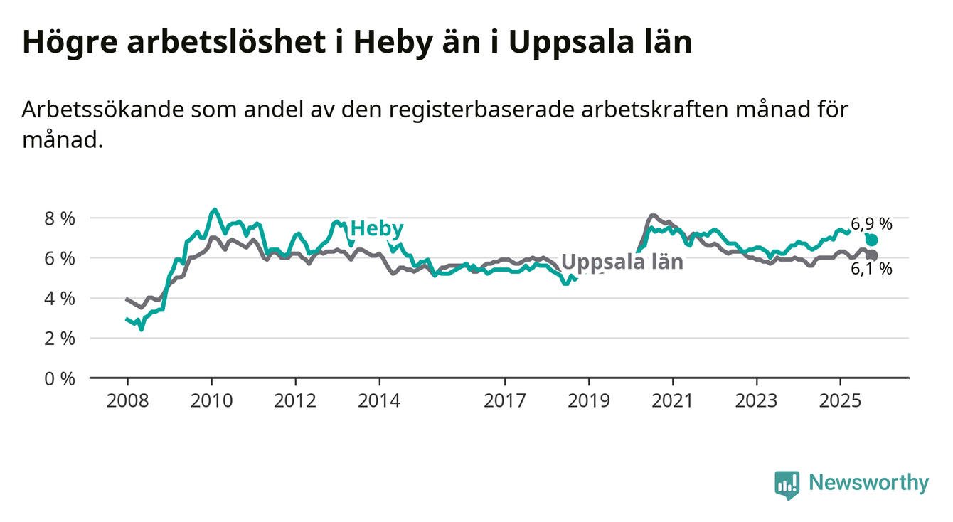 Under oktober månad rapporterade Heby kommun en total arbetslöshet på 6,9 procent. Det är en minskning jämfört med samma tidpunkt i fjol (−0,1 procentenheter). I Uppsala län däremot stiger arbetslösheten något.