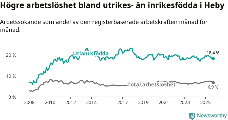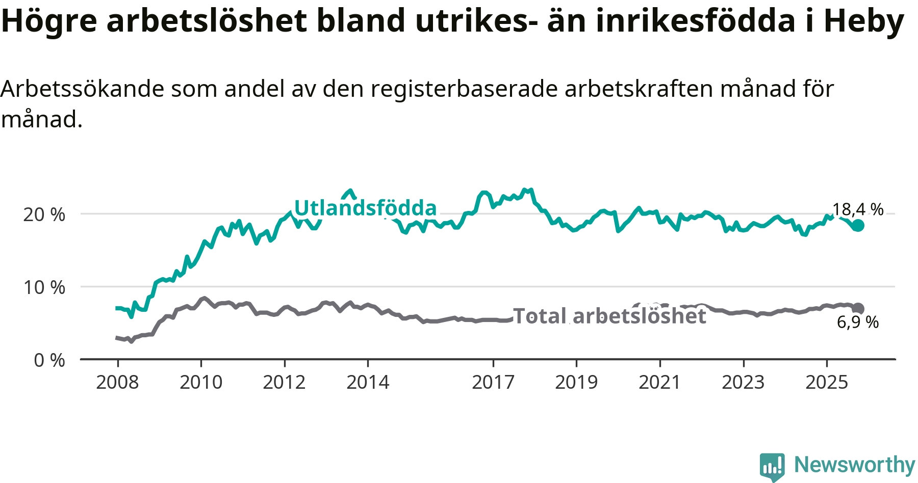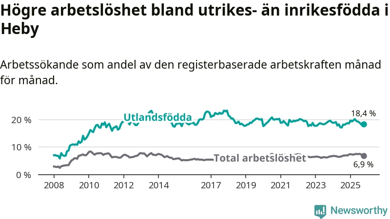Arbetslösheten bland utlandsfödda var 18,4 procent i Heby under oktober månad, motsvarande 195 av 1 060 personer. Det är 0,1 procentenheter färre än vid samma tidpunkt i fjol (−3 om man räknar personer).