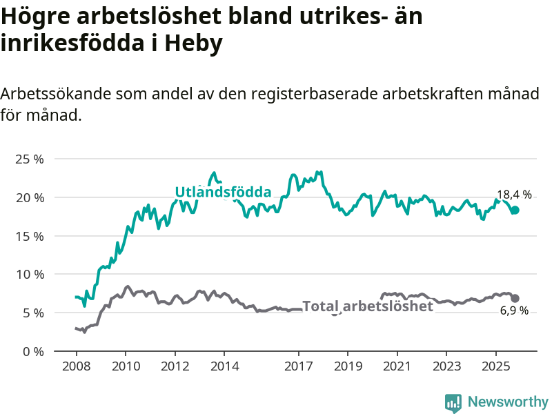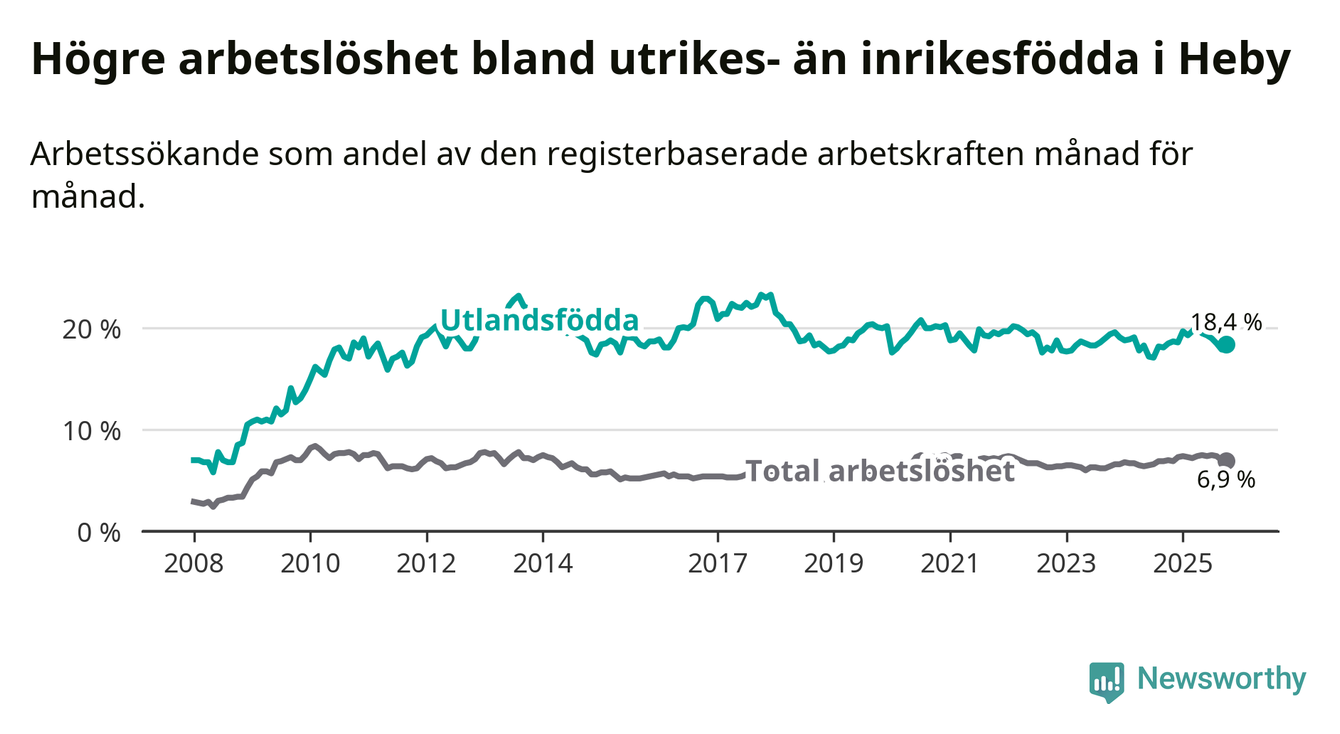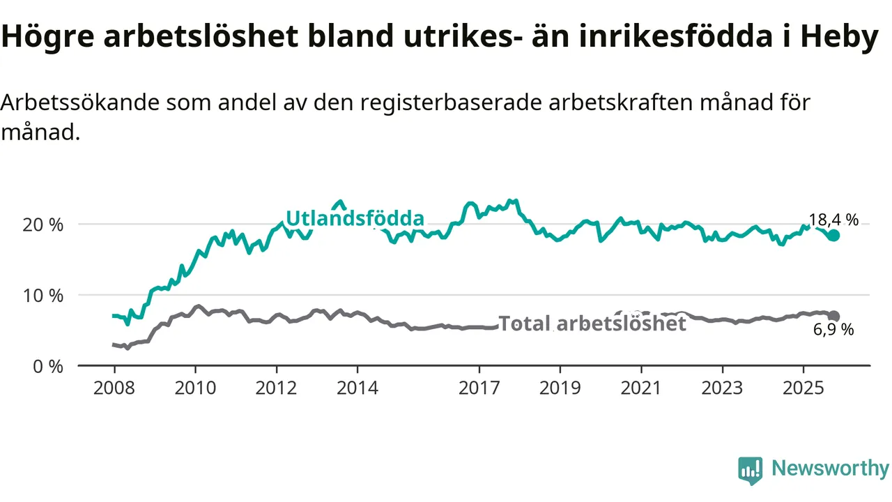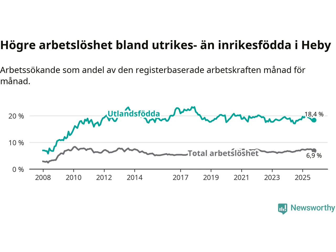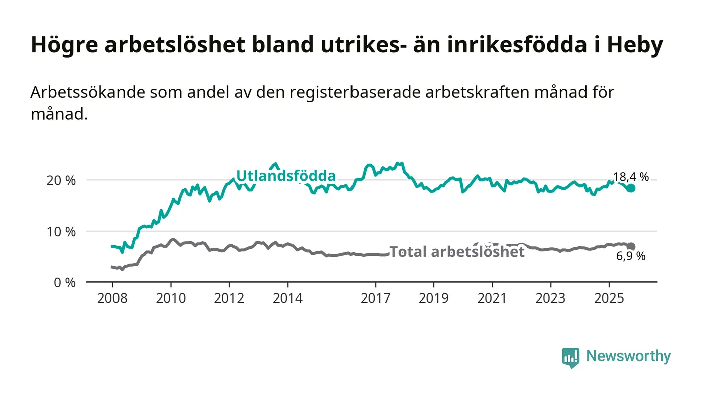 Skillnaden i arbetslöshet mellan utrikesfödda och hela befolkningen är 11,5 procentenheter i Heby. Det är ungefär samma skillnad som för ett år sedan.