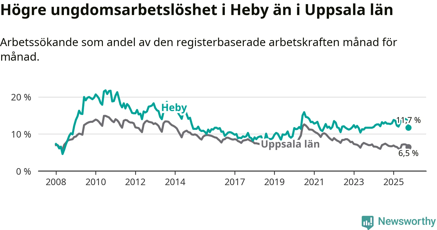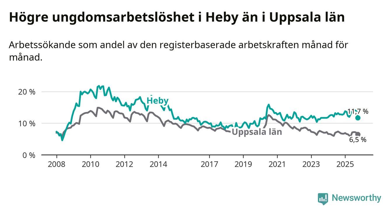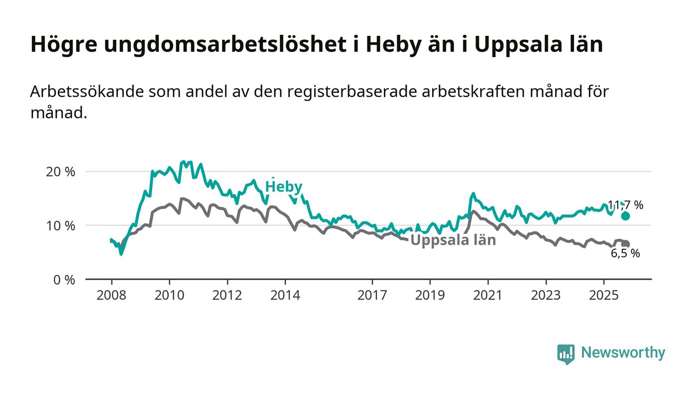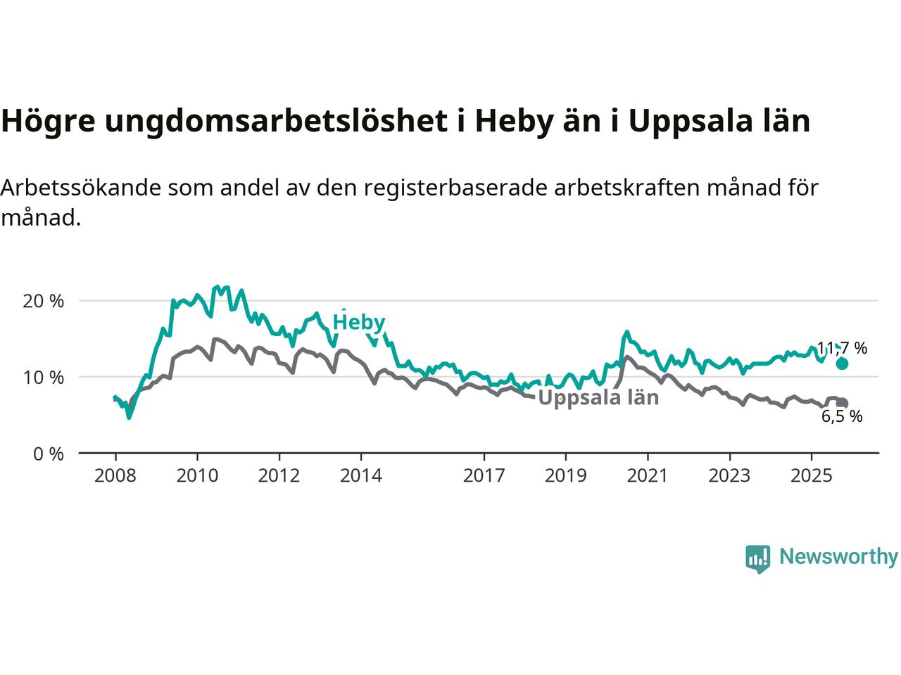 Precis som den totala arbetslösheten ligger ungdomsarbetslösheten i Heby högre än i Uppsala som helhet. Skillnaden mellan kommunen och länet är 5,2 procentenheter.