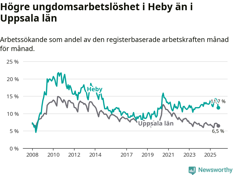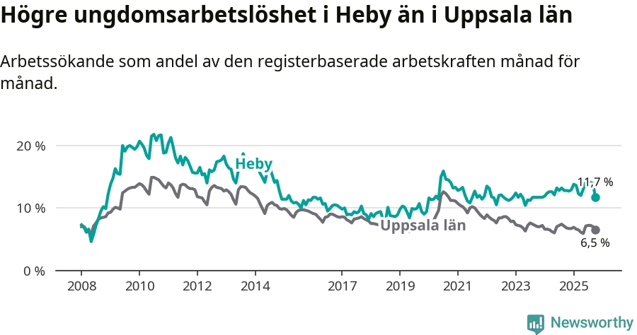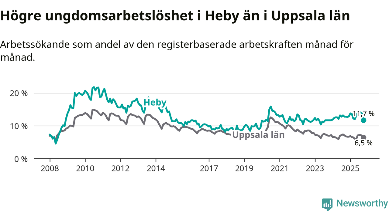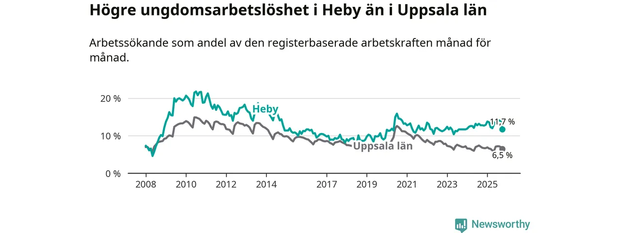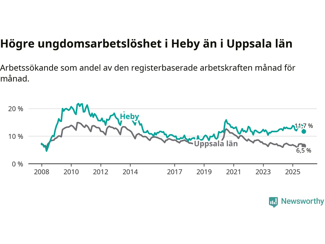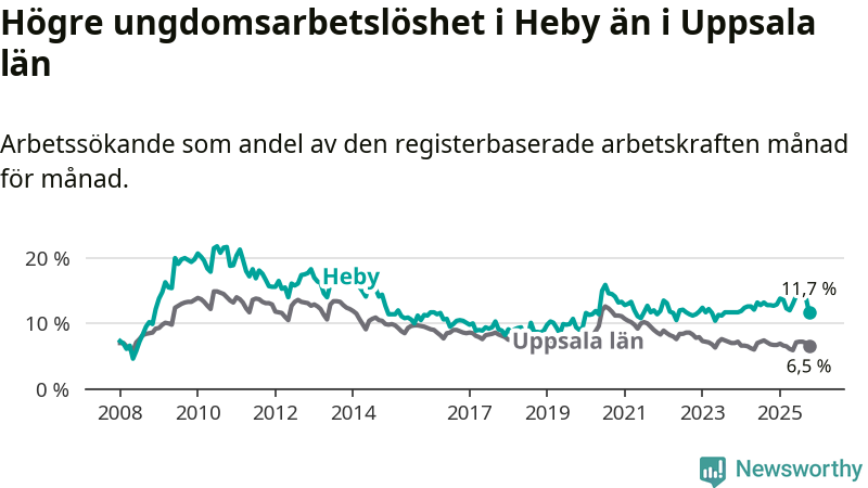 Precis som den totala arbetslösheten ligger ungdomsarbetslösheten i Heby högre än i Uppsala som helhet. Skillnaden mellan kommunen och länet är 5,2 procentenheter.