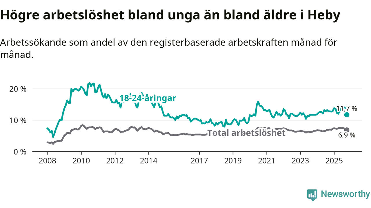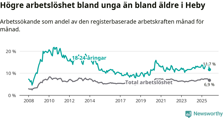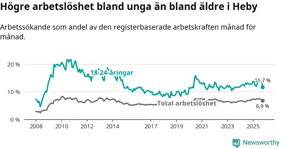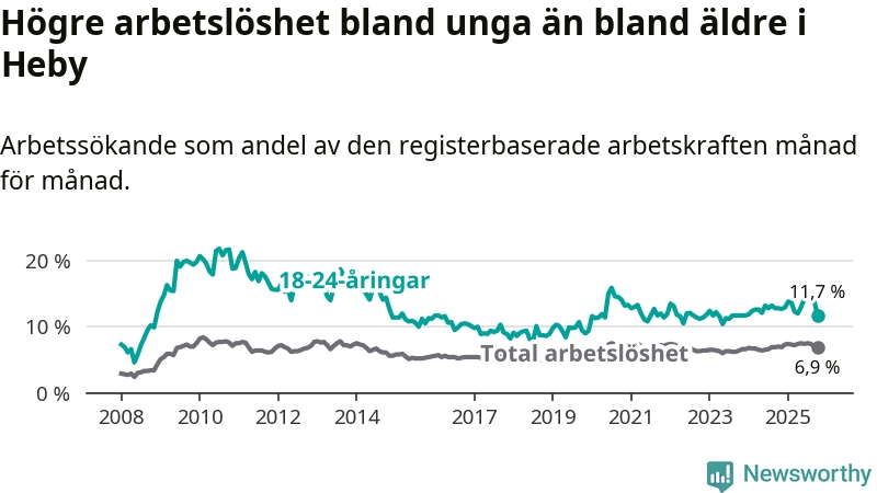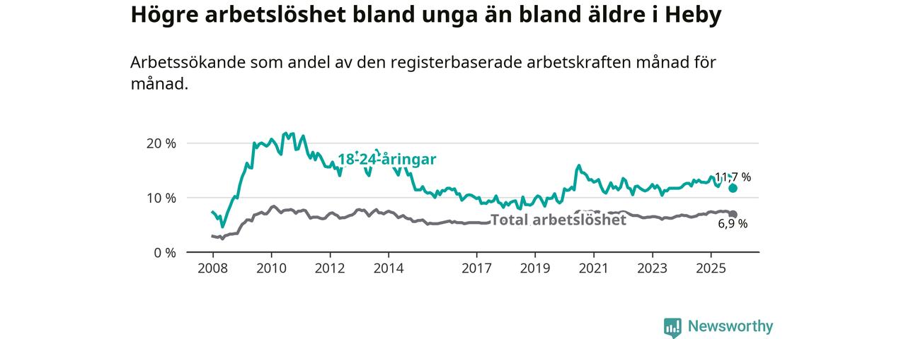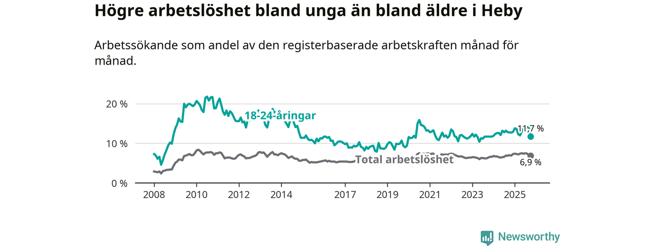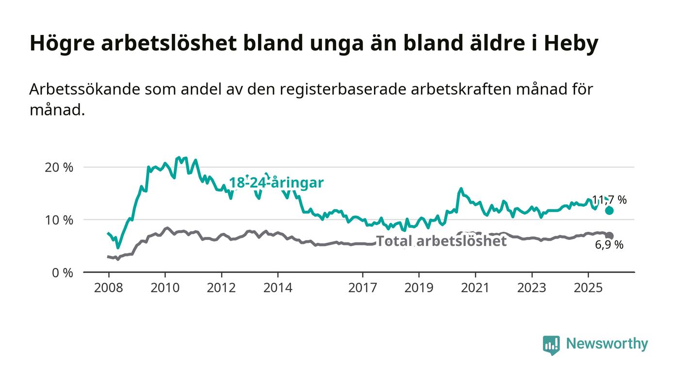 Precis som den totala arbetslösheten ligger ungdomsarbetslösheten i Heby högre än i Uppsala som helhet. Skillnaden mellan kommunen och länet är 5,2 procentenheter.