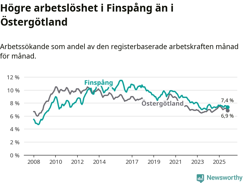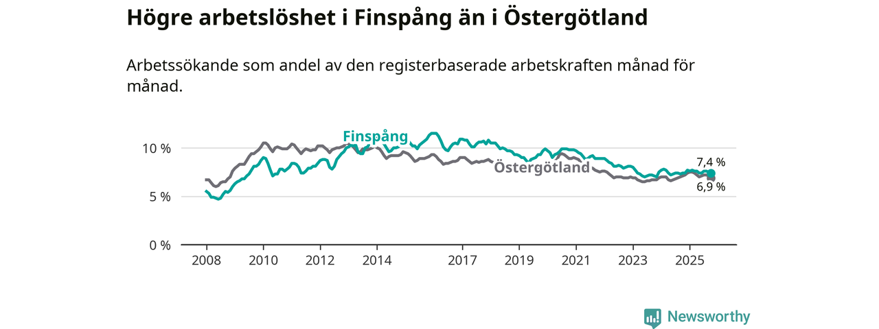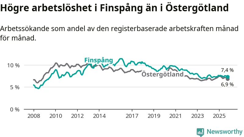 Under oktober månad rapporterade Finspångs kommun en total arbetslöshet på 7,4 procent. Det är i samma nivå som i oktober i fjol. I Östergötlands län däremot sjunker arbetslösheten något