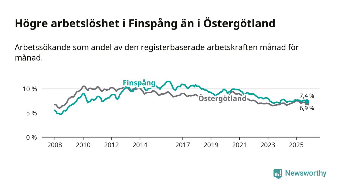 Arbetslösheten i Finspång ligger över nivån i hela Östergötlands län (7,4 procent i kommunen, jämfört med 6,9 procent i hela länet). Ydre har den lägsta arbetslösheten i länet (3,0 procent), medan Norrköping har den högsta (9,1 procent). För att Finspång skulle komma ner i samma arbetslöshetsnivå som Ydre skulle 450 personer behöva sysselsättas.