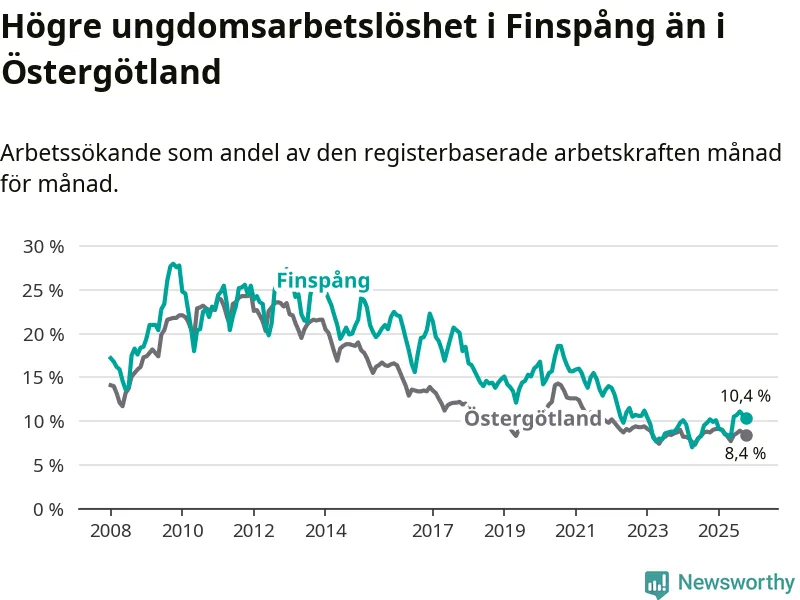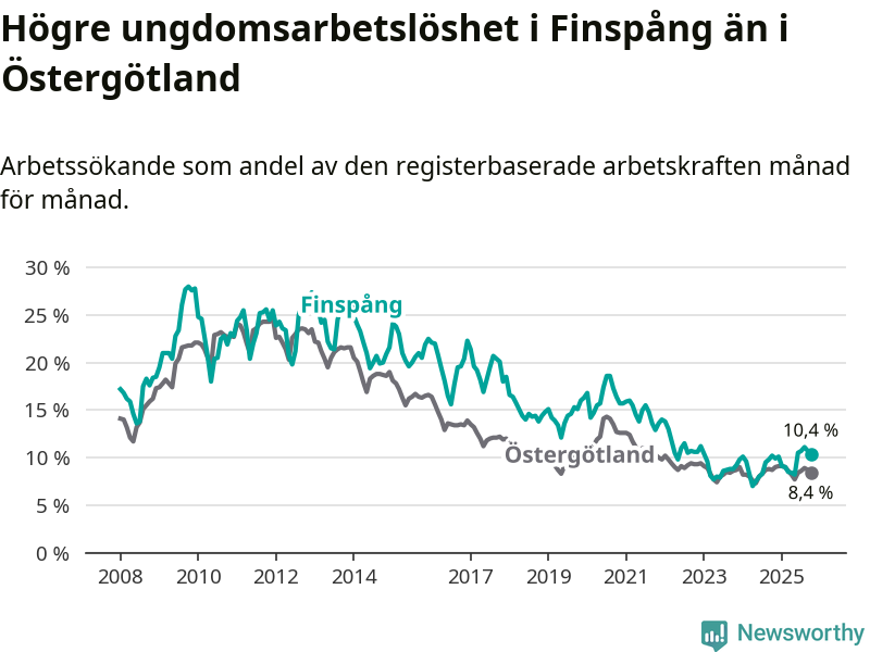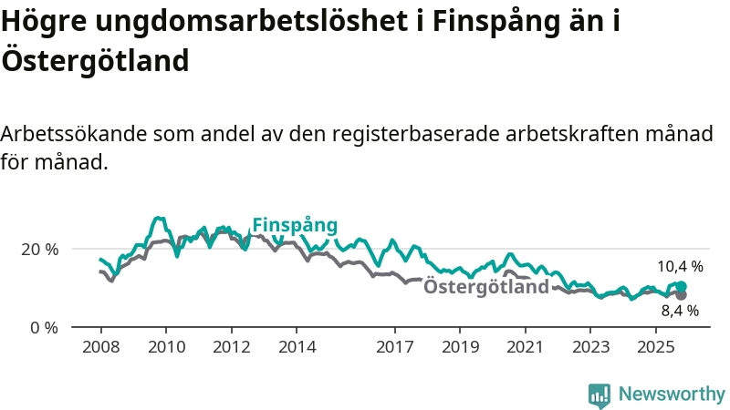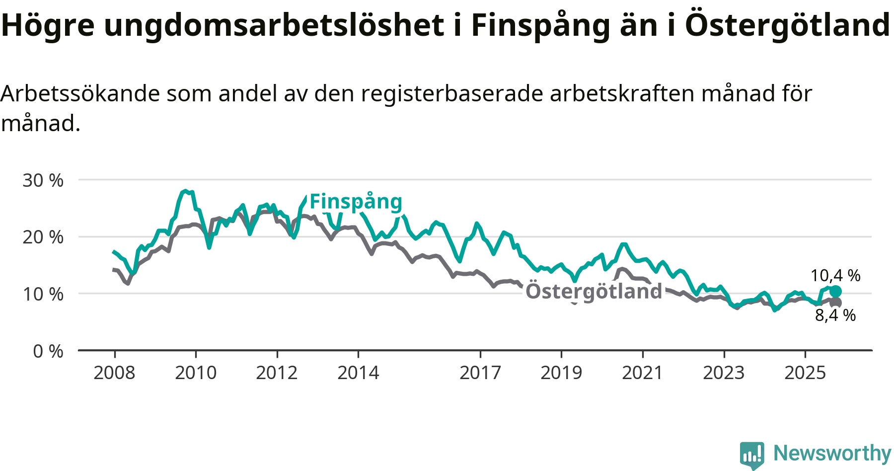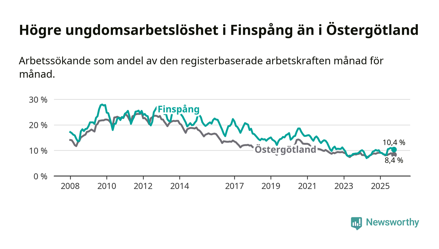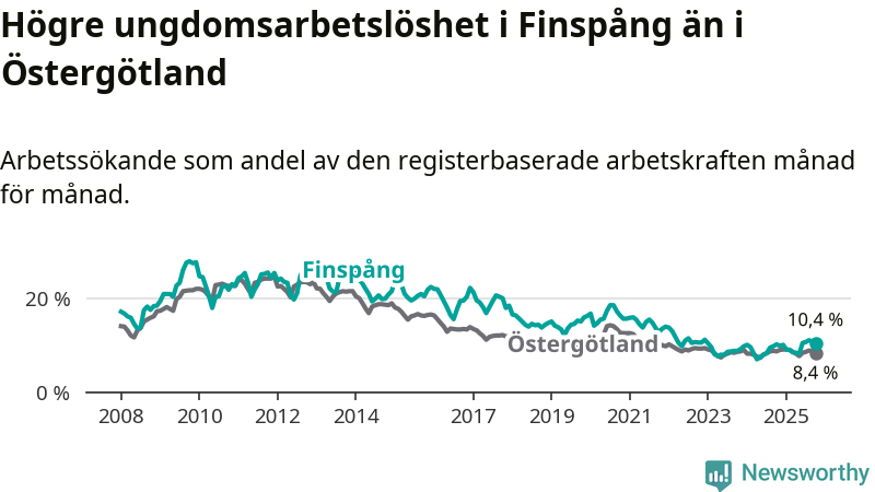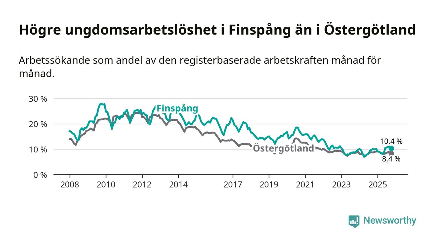 Precis som den totala arbetslösheten ligger ungdomsarbetslösheten i Finspång högre än i Östergötland som helhet. Skillnaden mellan kommunen och länet är 2,0 procentenheter.