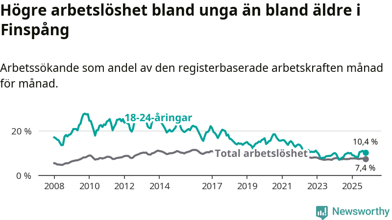Till skillnad från den totala arbetslösheten stiger arbetslösheten bland unga (+0,2 procentenheter). I oktober var 10,4 procent av 18–24-åringarna inskrivna som arbetssökande (motsvarande 95 personer). Mäter vi antalet inskrivna ser vi en minskning med fyra personer på ett års sikt.