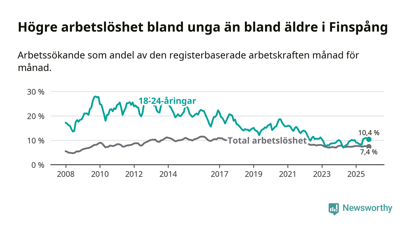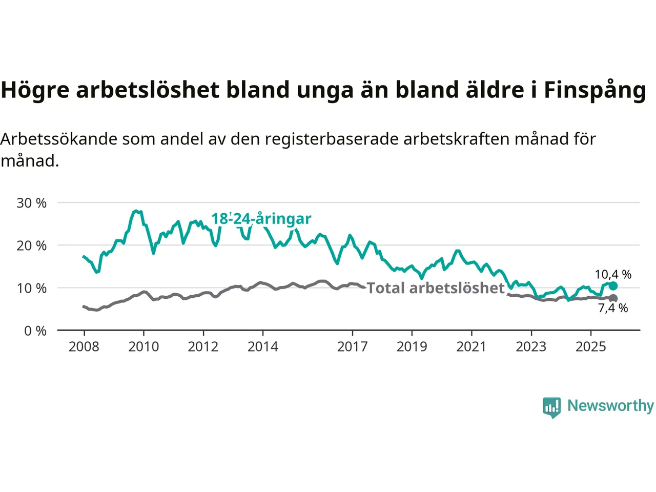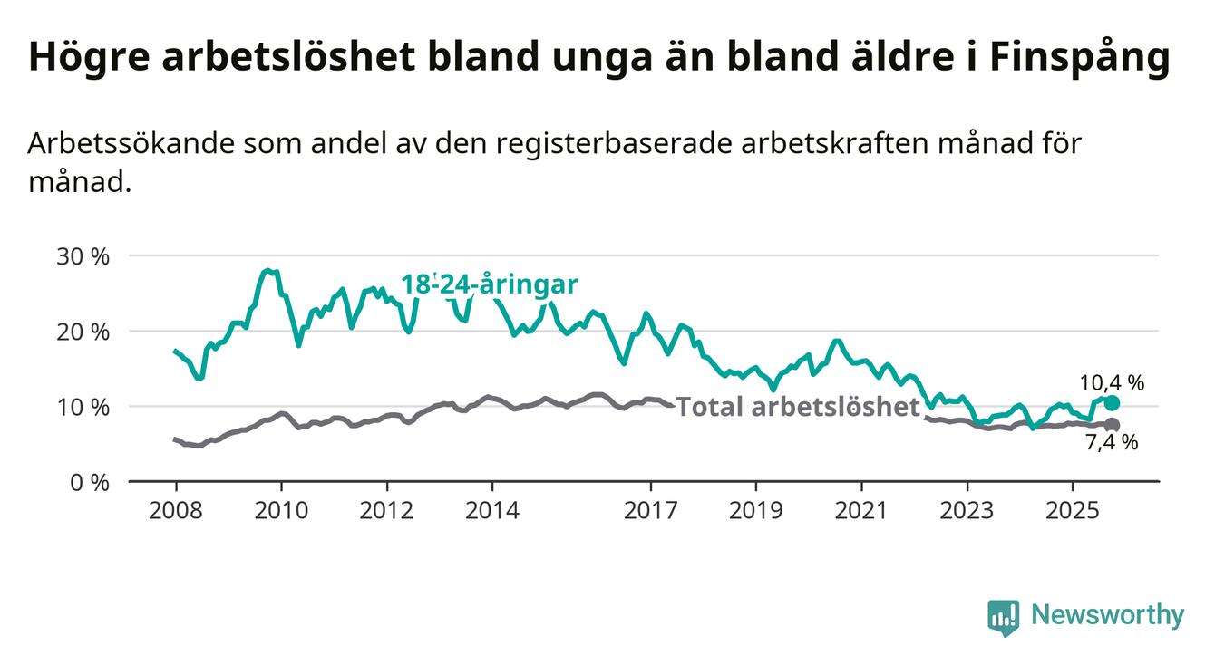I och med den senaste månadens uppgång har de ungas arbetslöshet i Finspång stigit åtta månader i följd (upp från 9,0 procent i februari till 10,4 procent nu).