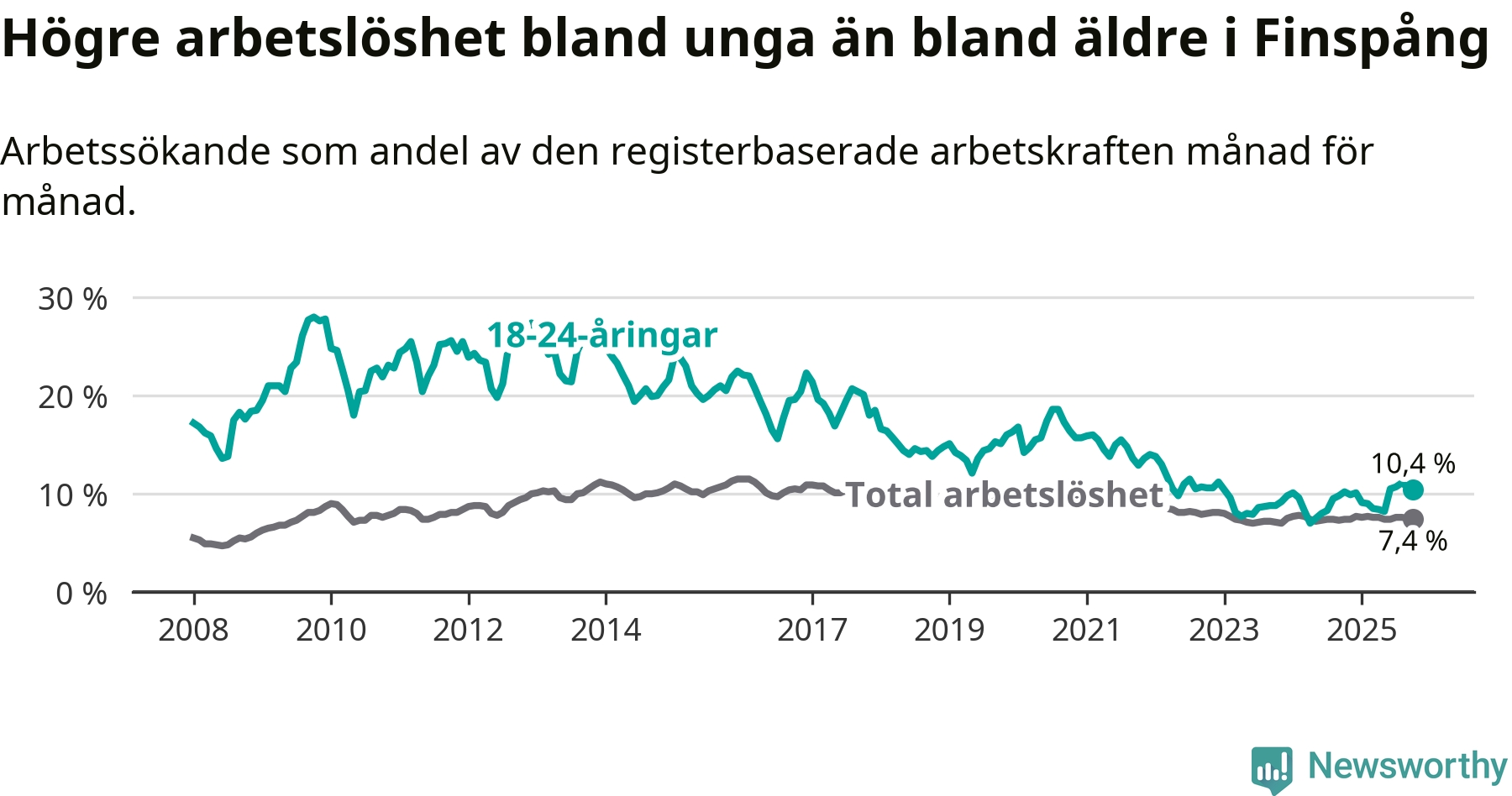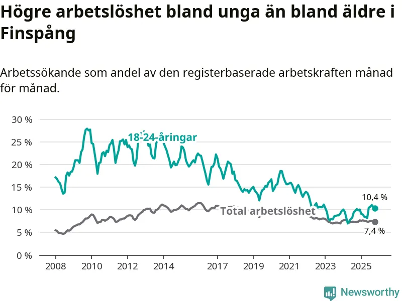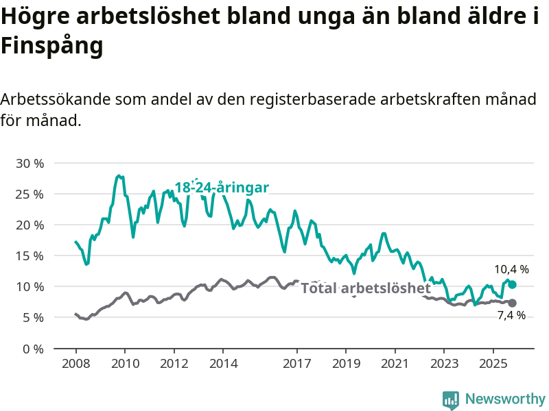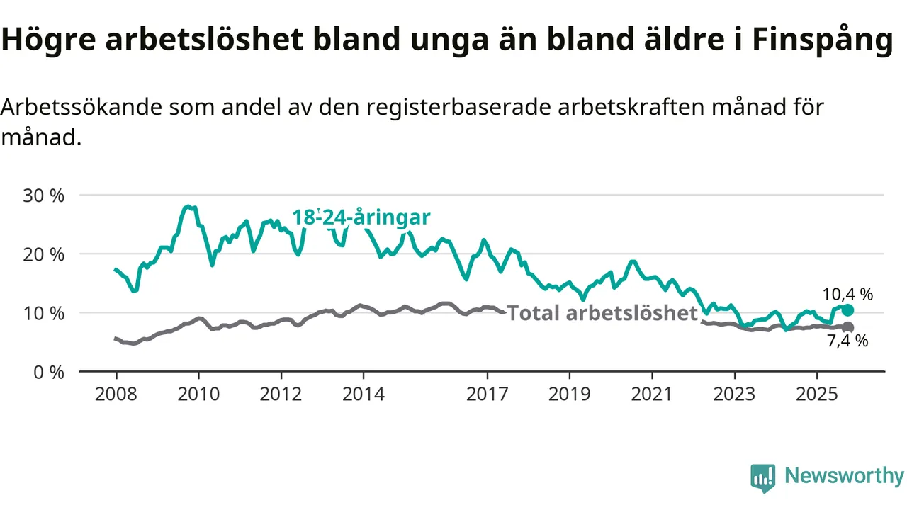 I och med den senaste månadens uppgång har de ungas arbetslöshet i Finspång stigit åtta månader i följd (upp från 9,0 procent i februari till 10,4 procent nu).