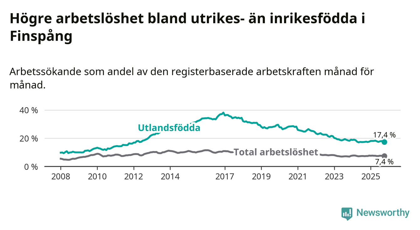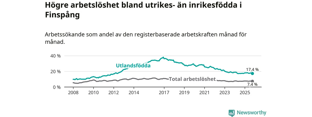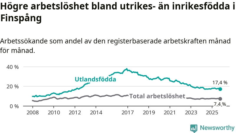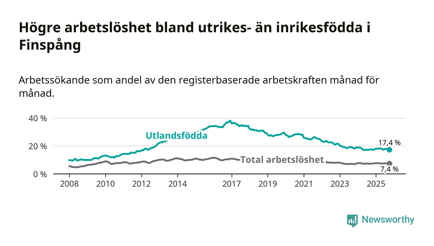 Arbetslösheten bland utlandsfödda var 17,4 procent i Finspång under oktober månad, motsvarande 343 av 1 971 personer. Det är 0,2 procentenheter färre än vid samma tidpunkt i fjol (−10 om man räknar personer). Den senaste månadens nedgång innebär ett trendbrott. Under de tre föregående månaderna hade arbetslösheten bland utlandsfödda varit högre än motsvarande tidpunkt året innan.