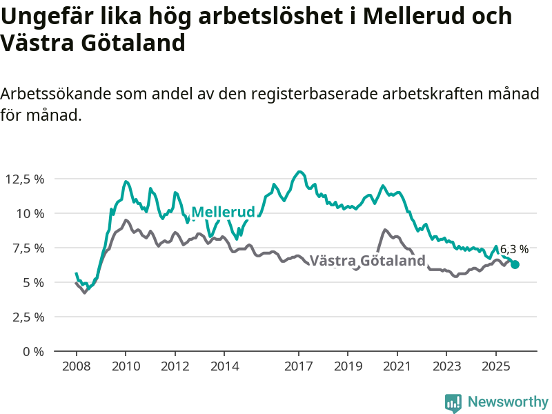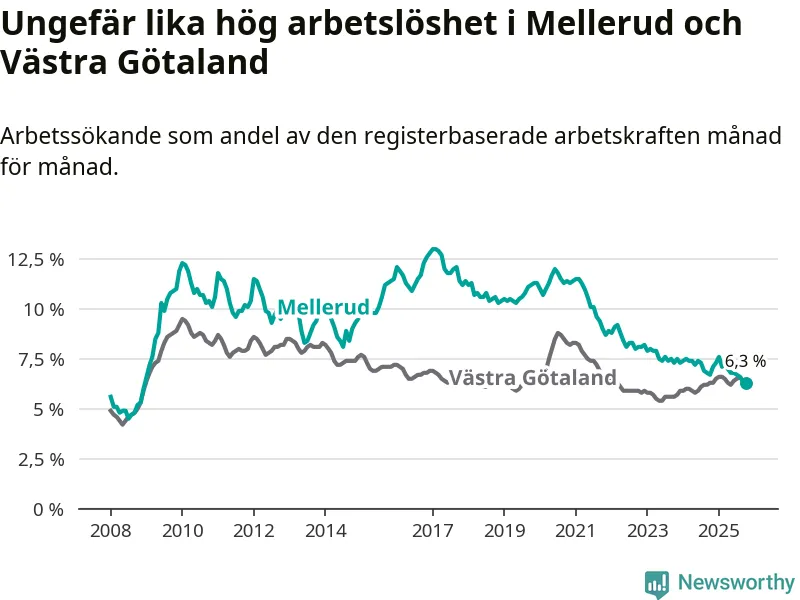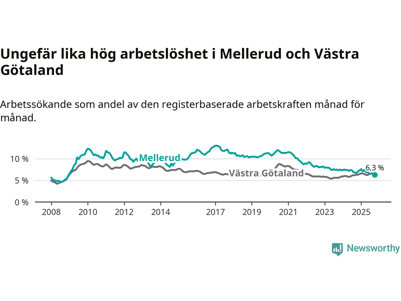 Under oktober månad rapporterade Melleruds kommun en total arbetslöshet på 6,3 procent. Det är en minskning jämfört med samma tidpunkt i fjol (−0,4 procentenheter). I Västra Götalands län däremot står arbetslösheten stilla.