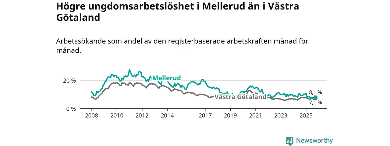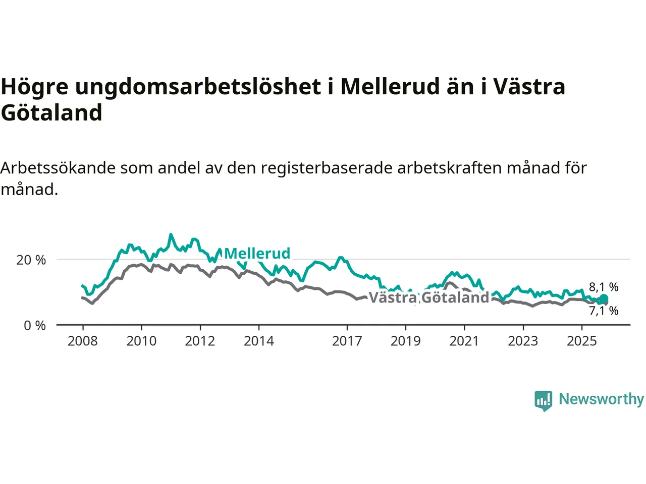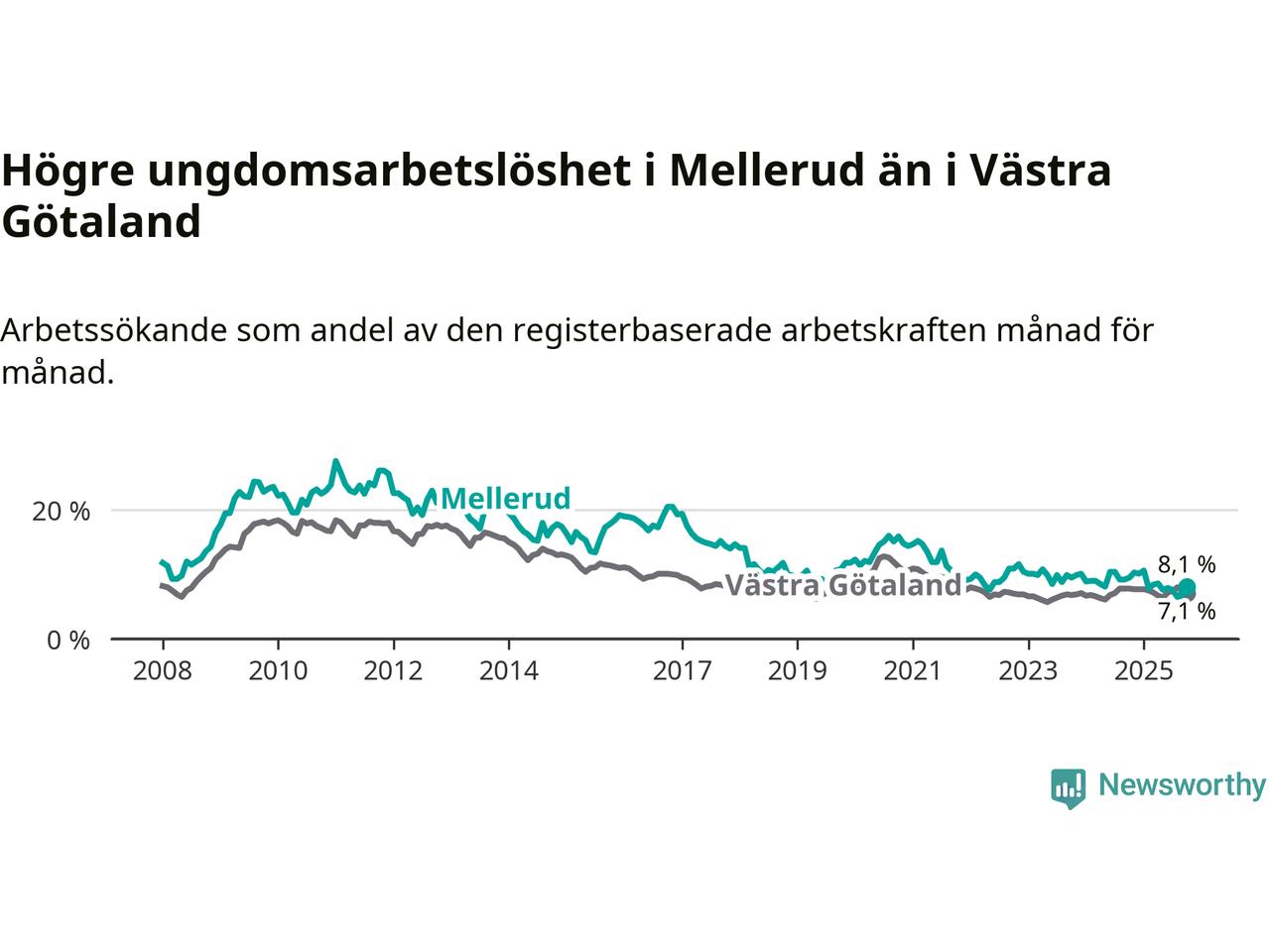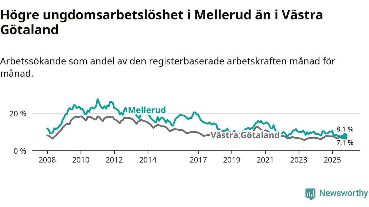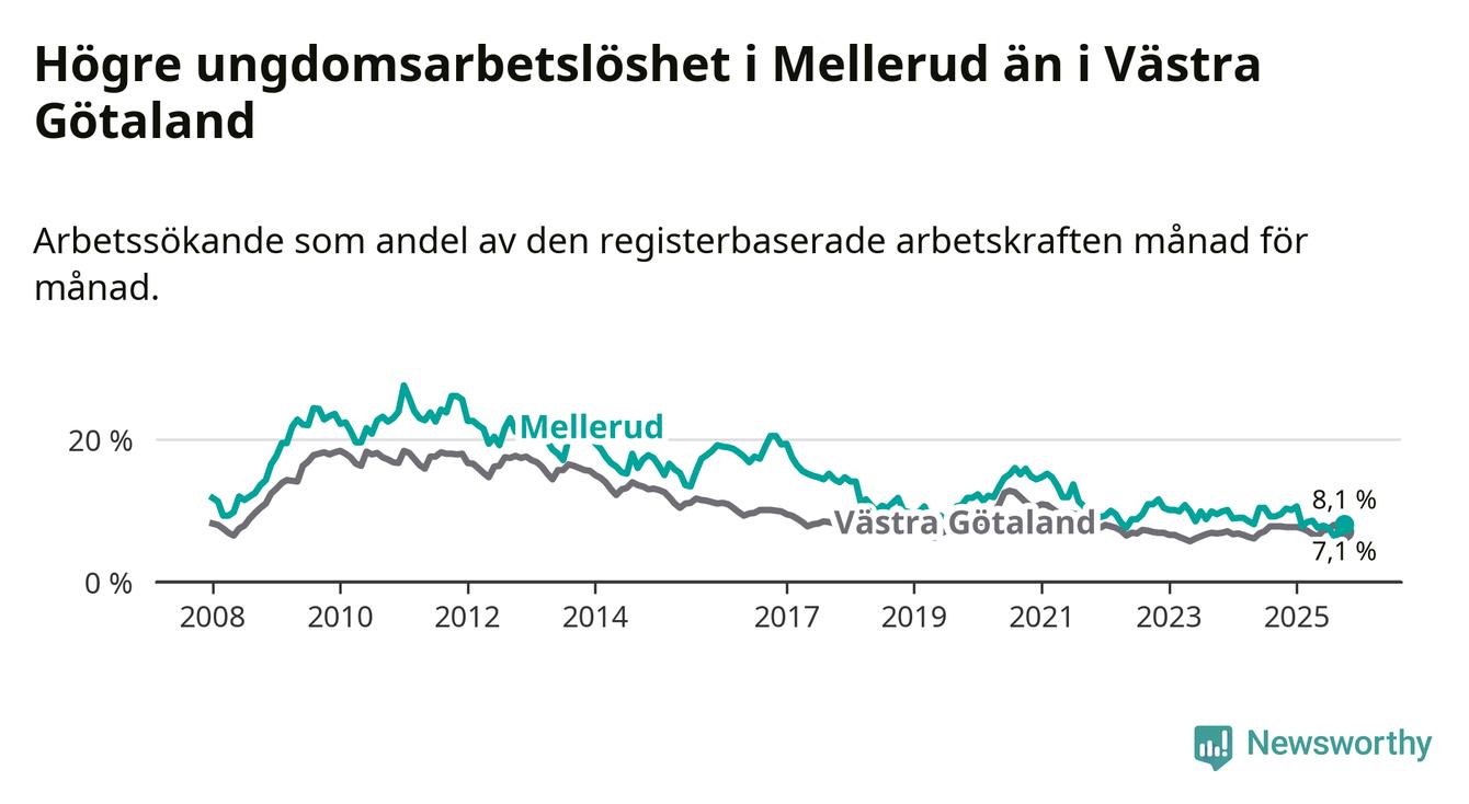 Medan Mellerud har ungefär samma total arbetslöshet som Västra Götaland, ligger ungdomsarbetslösheten 1,0 procentenheter högre i Mellerud.