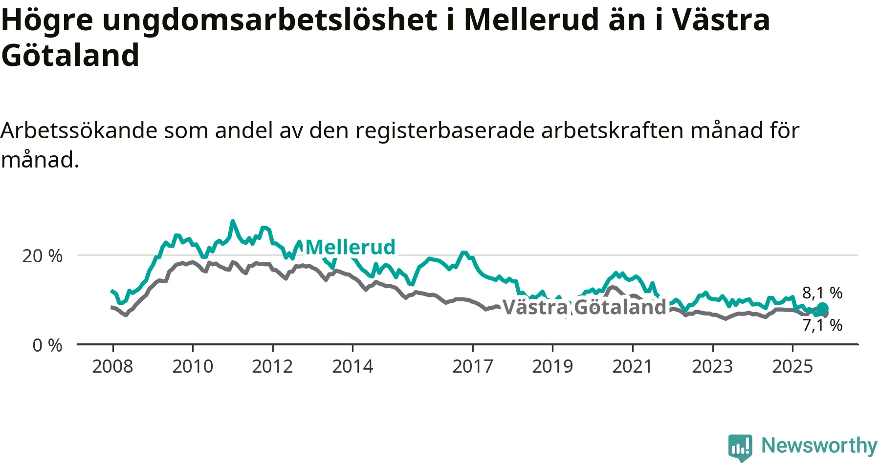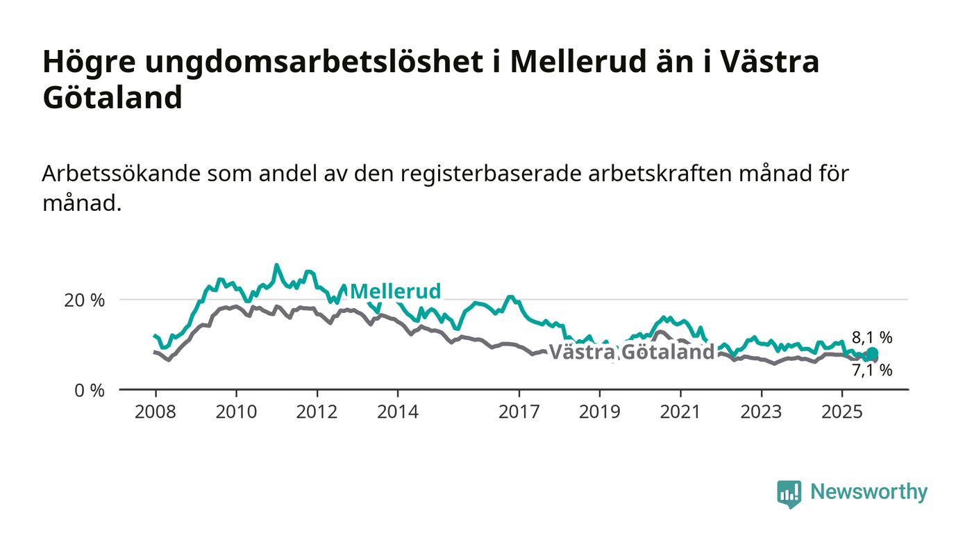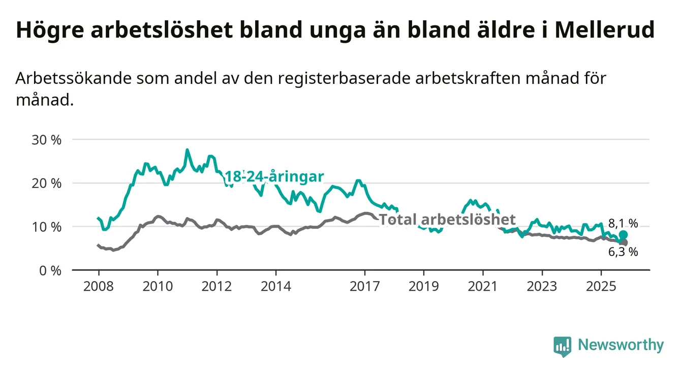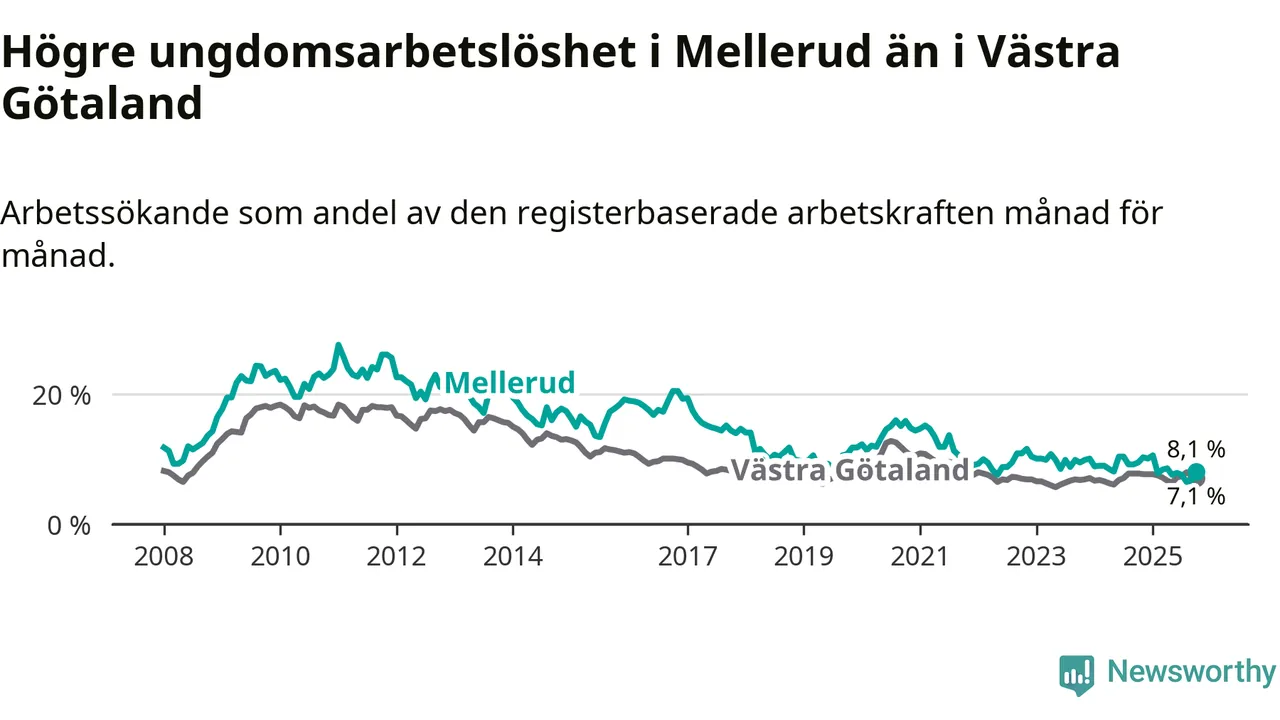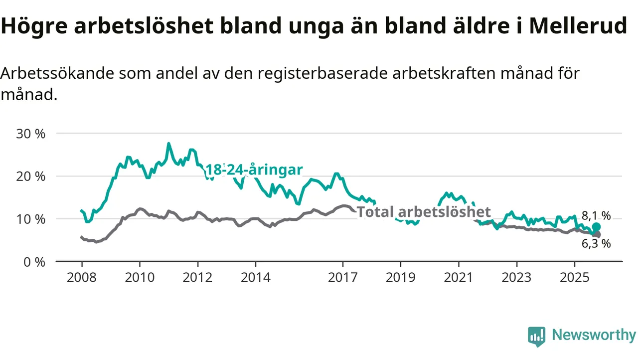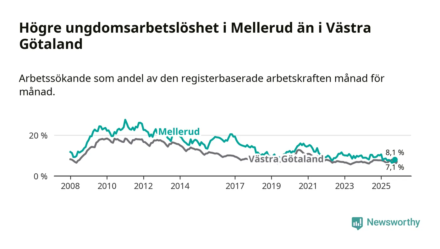 Medan Mellerud har ungefär samma total arbetslöshet som Västra Götaland, ligger ungdomsarbetslösheten 1,0 procentenheter högre i Mellerud.