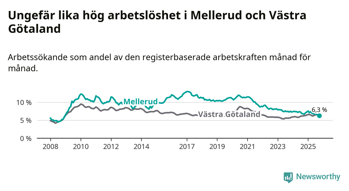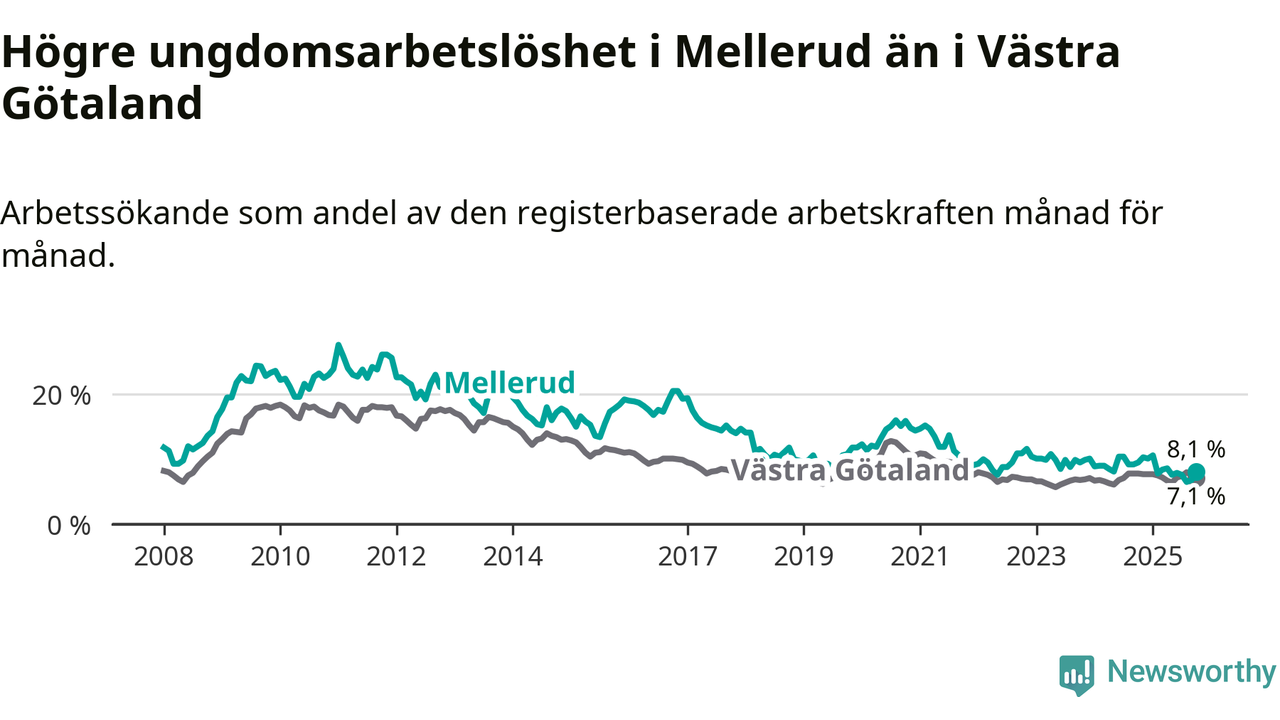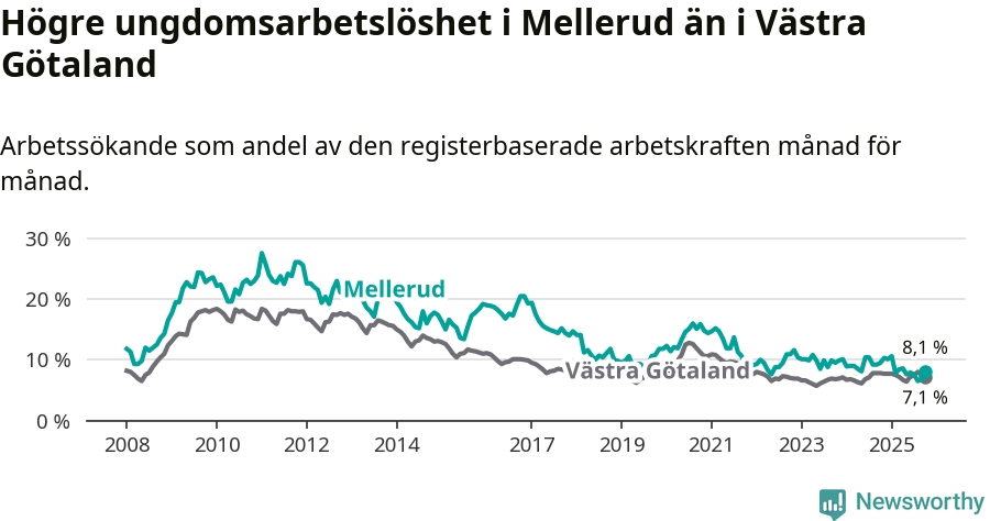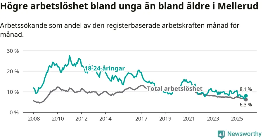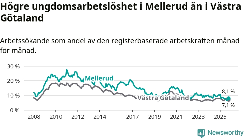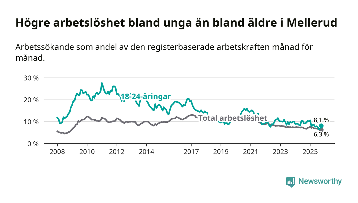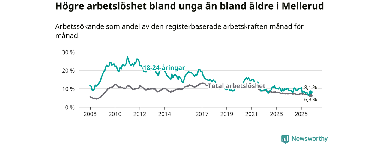 Medan Mellerud har ungefär samma total arbetslöshet som Västra Götaland, ligger ungdomsarbetslösheten 1,0 procentenheter högre i Mellerud.