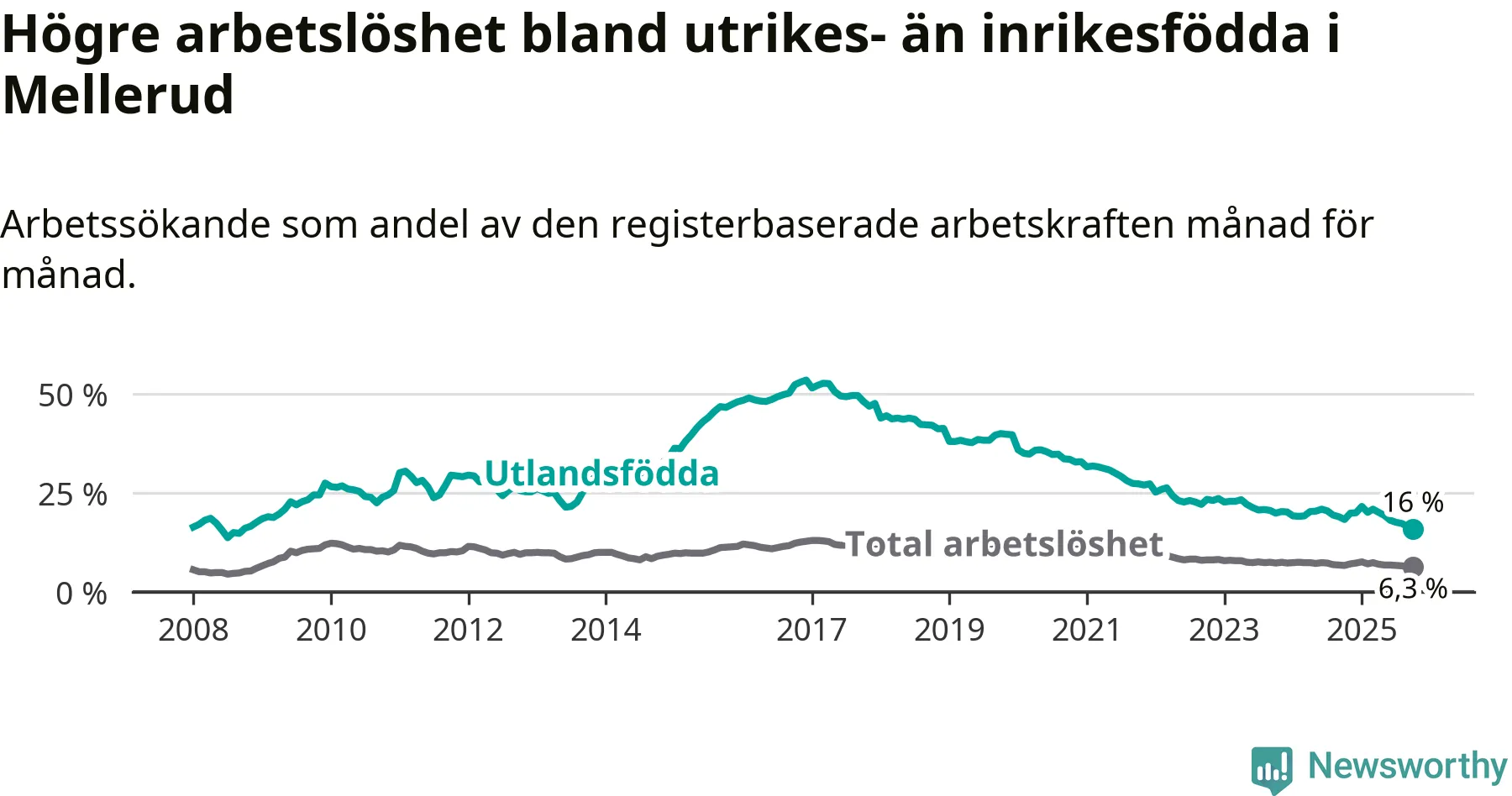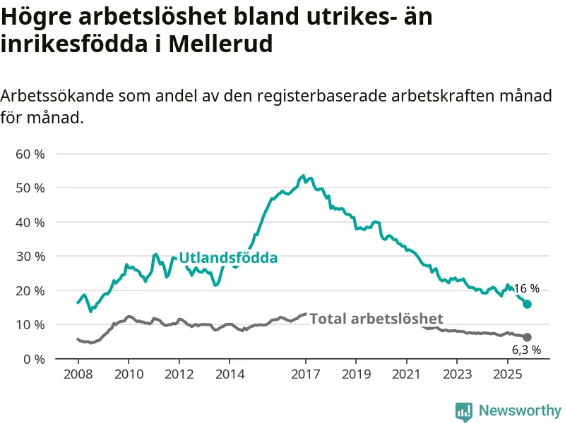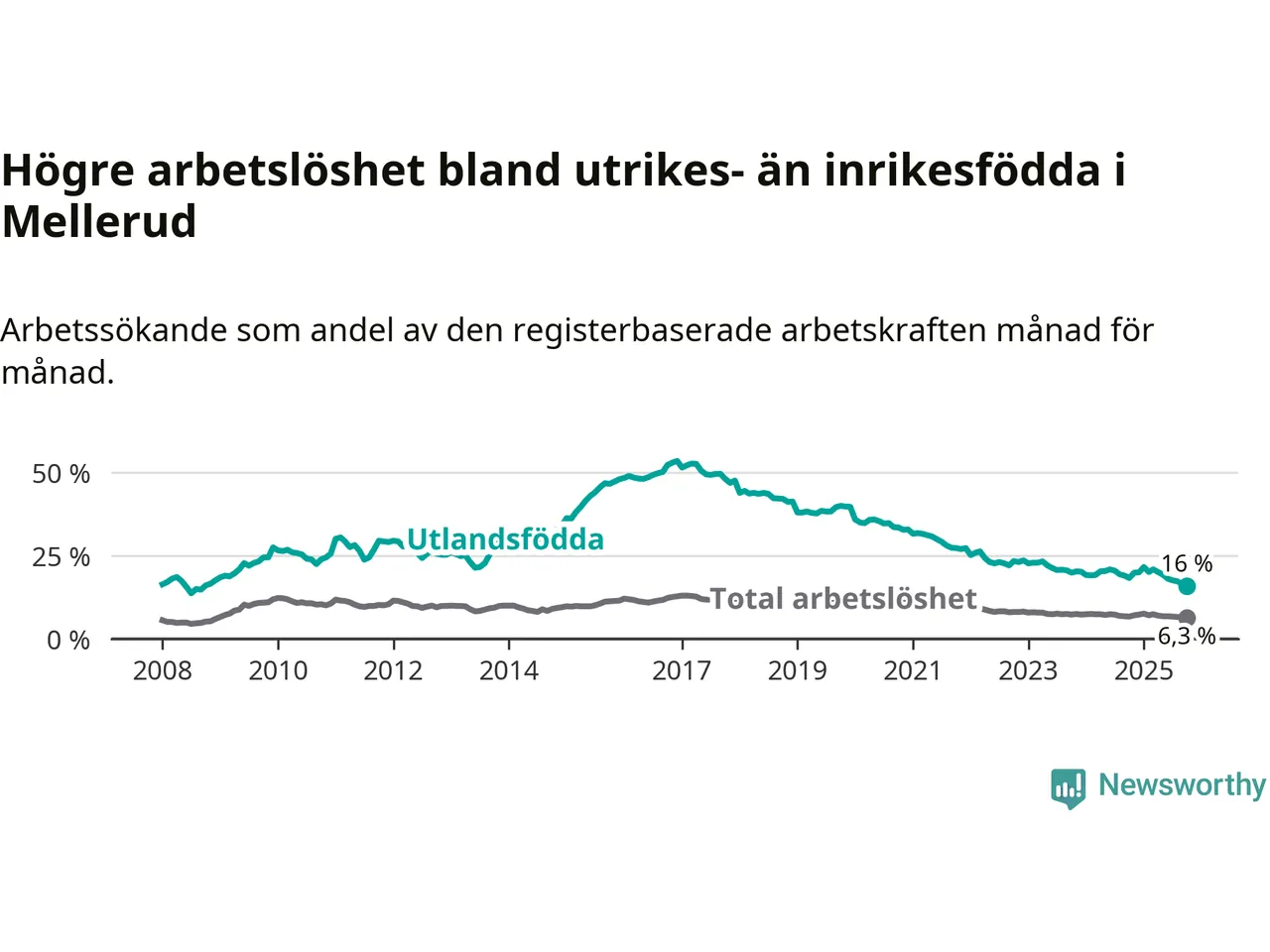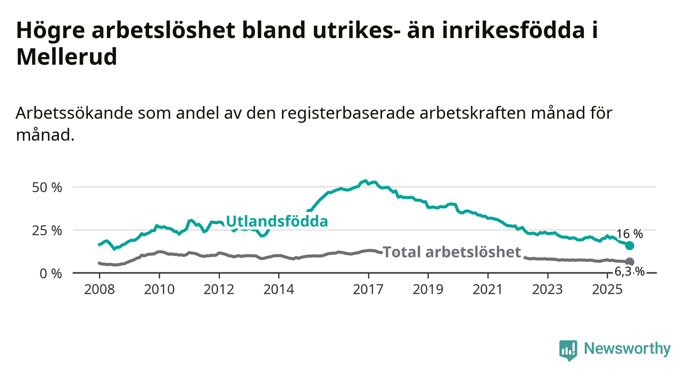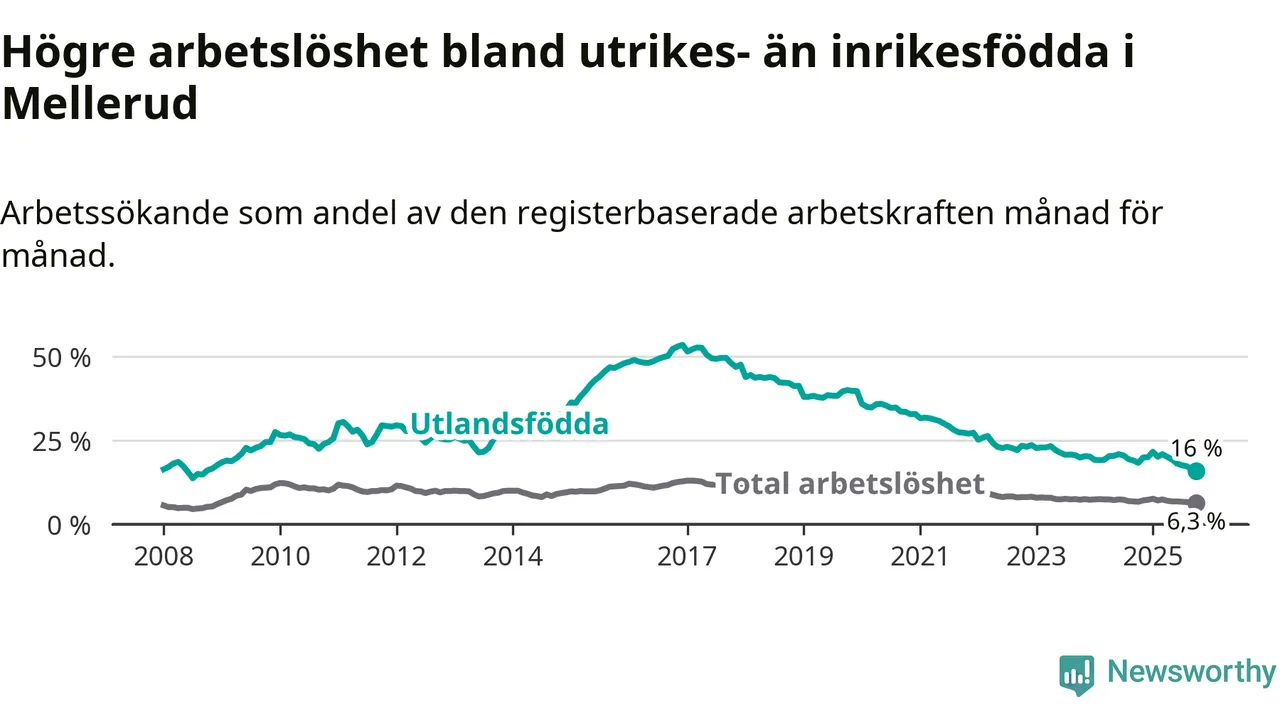 Skillnaden i arbetslöshet mellan utrikesfödda och hela befolkningen är 9,7 procentenheter i Mellerud. Det är en betydligt mindre skillnad än för ett år sedan (−1,9 procentenheter).