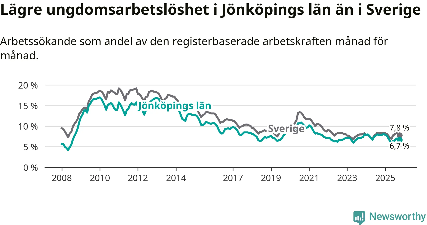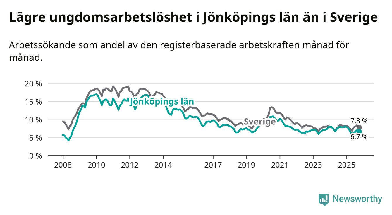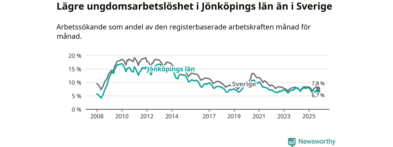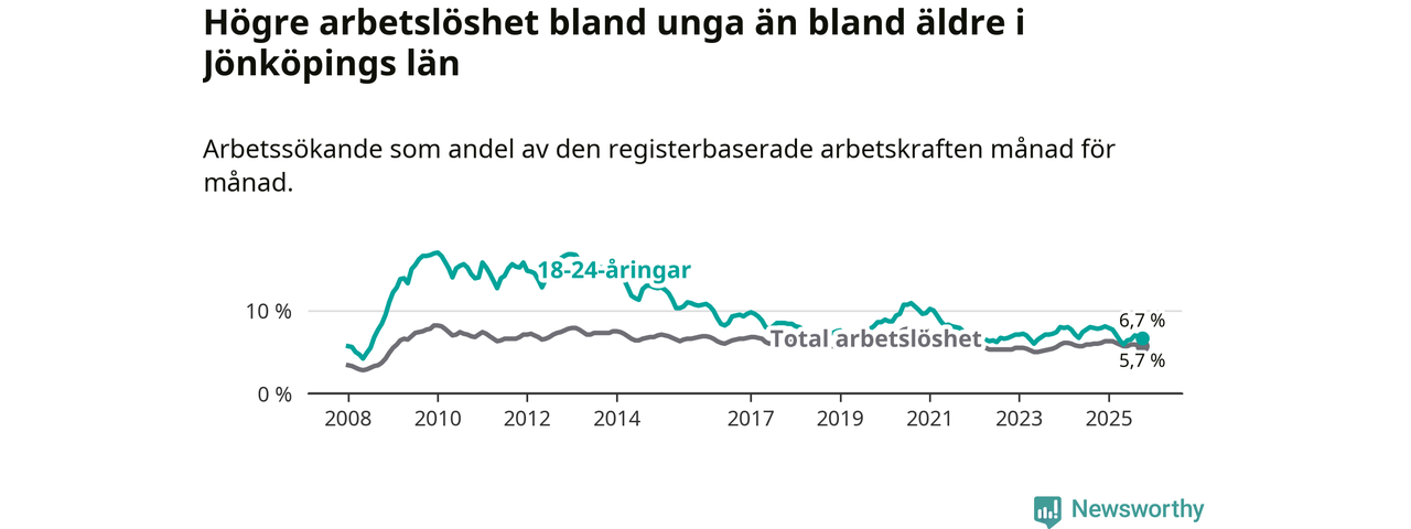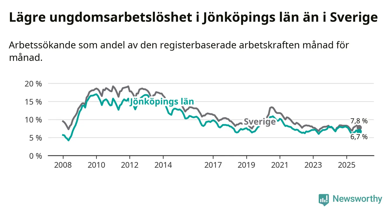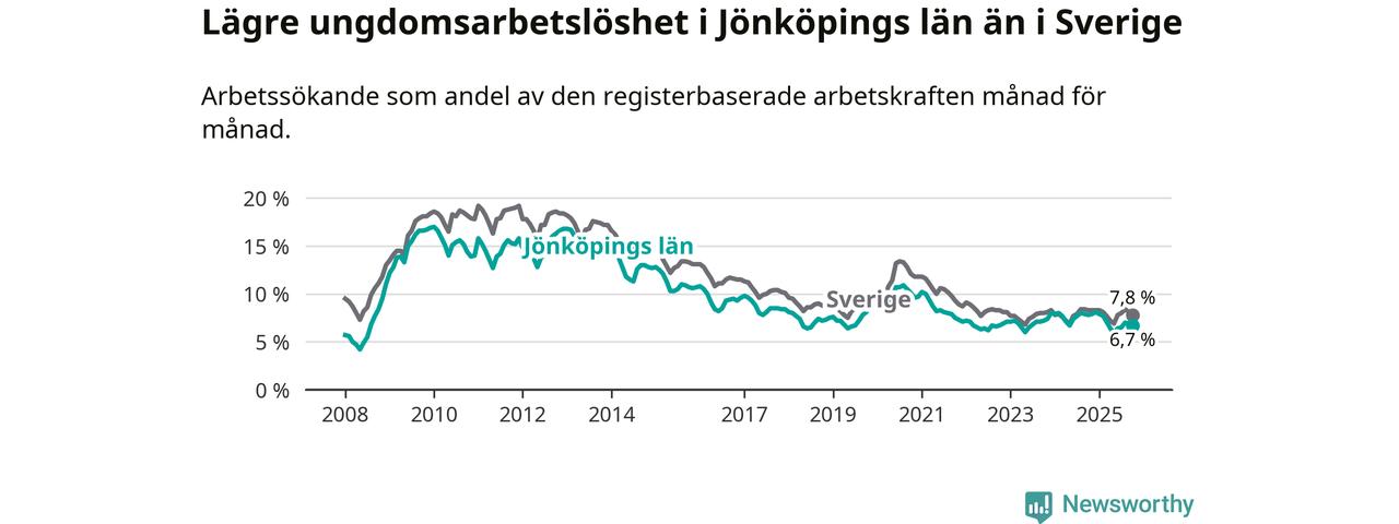 Graf: Arbetslöshet bland unga i Jönköpings län och Sverige
