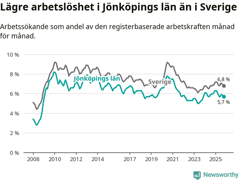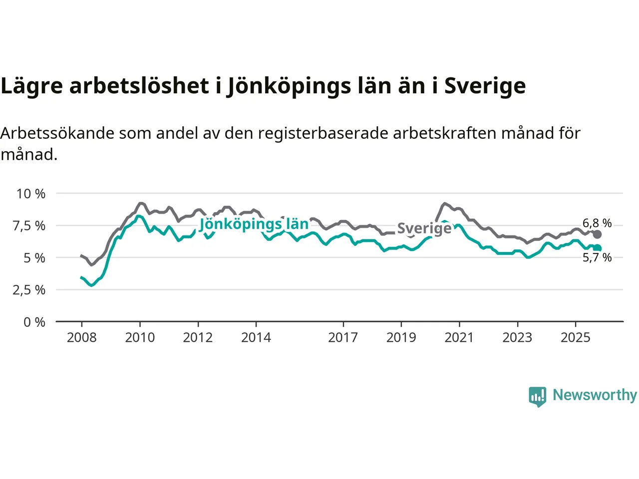 Under oktober månad rapporterade Jönköpings län en total arbetslöshet på 5,7 procent. Det är en minskning jämfört med samma tidpunkt i fjol (−0,3 procentenheter). Även i Sverige sjunker arbetslösheten något.