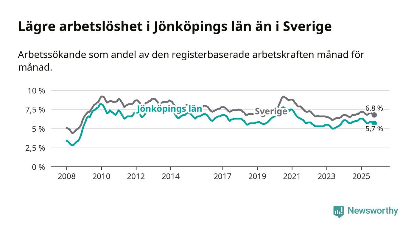 Jönköpings län hade redan tidigare lägre arbetslöshet än snittet i hela Sverige och nu växer klyftan (5,7 procent i länet, jämfört med 6,8 procent i hela riket). Norrbotten har den lägsta arbetslösheten i riket (3,9 procent), medan Skåne har den högsta (8,8 procent). För att Jönköpings län skulle komma ner i samma arbetslöshetsnivå som Norrbotten skulle 3 318 personer behöva sysselsättas.