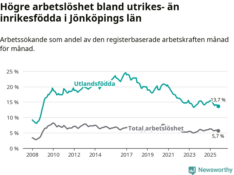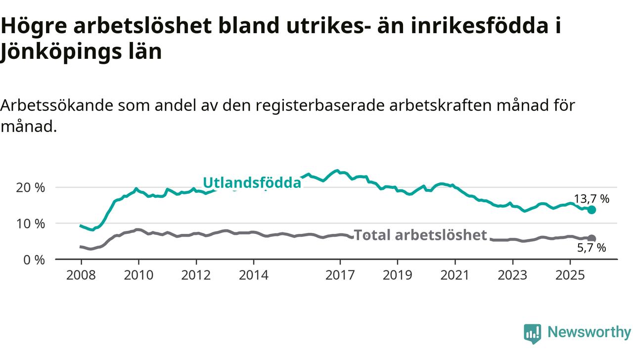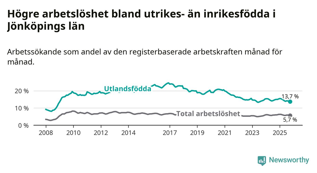 Arbetslösheten bland utlandsfödda var 13,7 procent i Jönköping under oktober månad, motsvarande 6 014 av 43 898 personer. Det är 1,3 procentenheter färre än vid samma tidpunkt i fjol (−506 om man räknar personer). Därmed är de utlandsföddas arbetslöshet lägre än vid samma tidpunkt i fjol för åttonde månaden i följd. Sedan februari har arbetslösheten bland utlandsfödda minskat från 15,4 till 13,7 procent.
