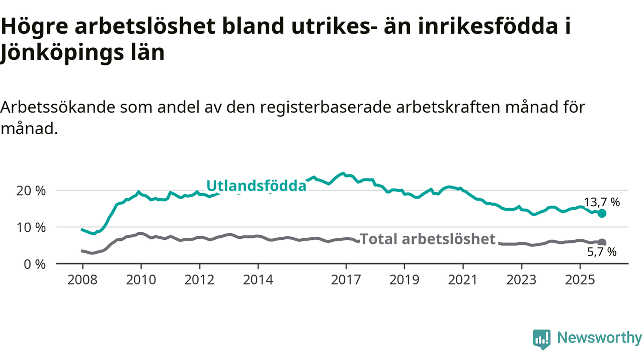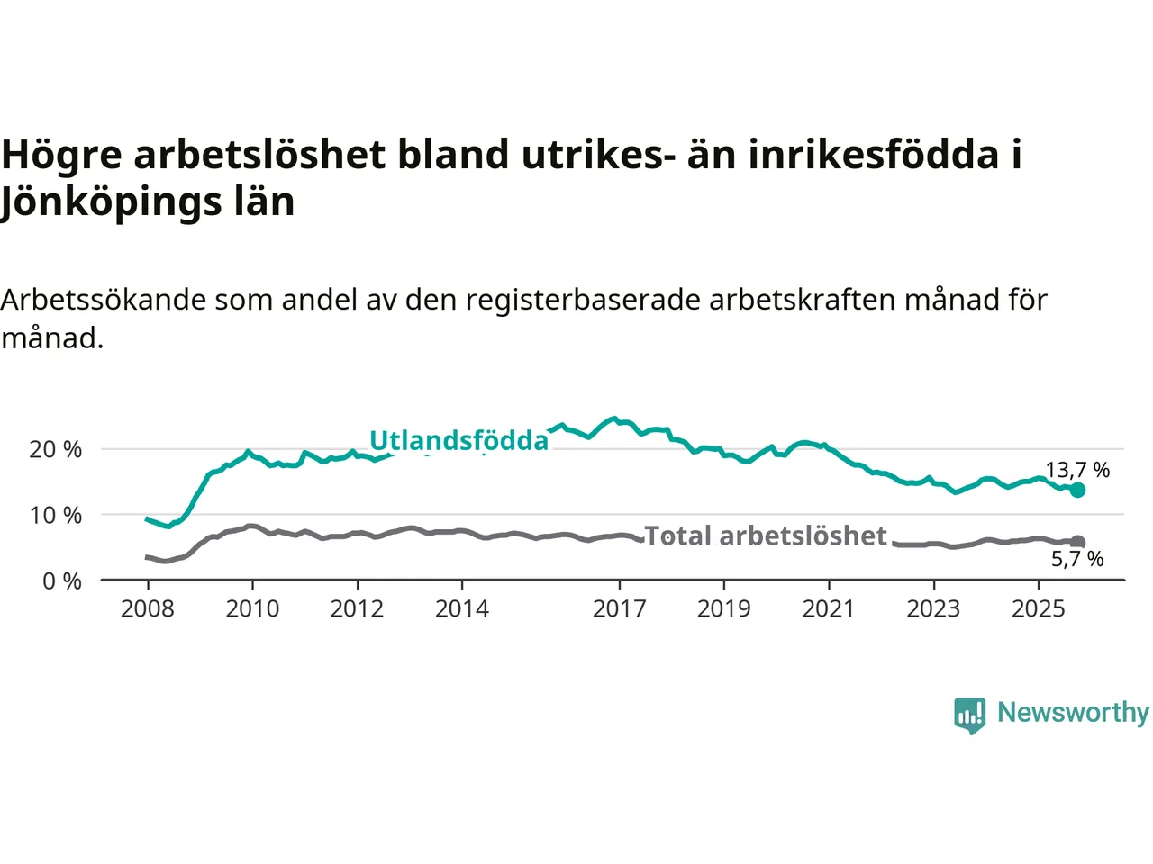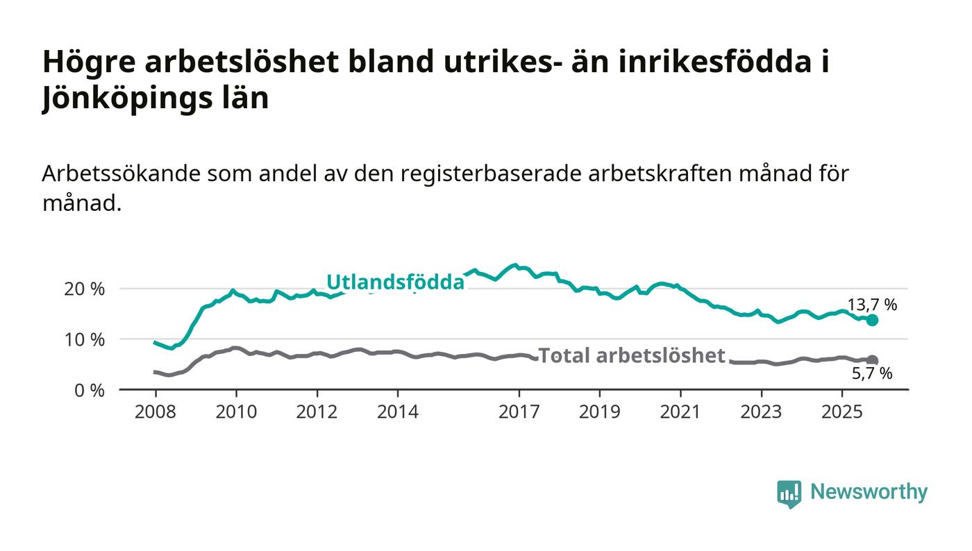 Skillnaden i arbetslöshet mellan utrikesfödda och hela befolkningen är 8,0 procentenheter i Jönköping. Det är en mindre skillnad än för ett år sedan (−1,0 procentenheter).