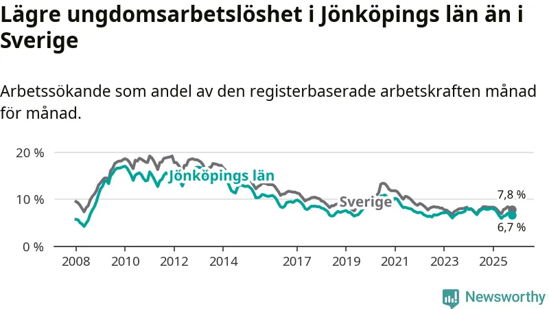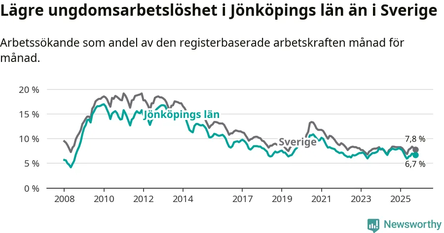 Precis som den totala arbetslösheten ligger ungdomsarbetslösheten i Jönköping lägre än i Sverige som helhet. Skillnaden mellan länet och riket är 1,1 procentenheter.