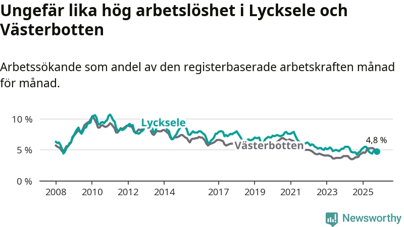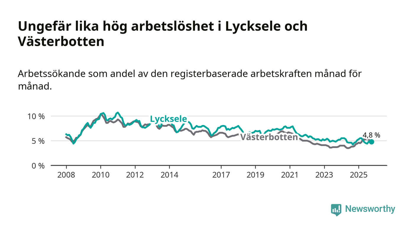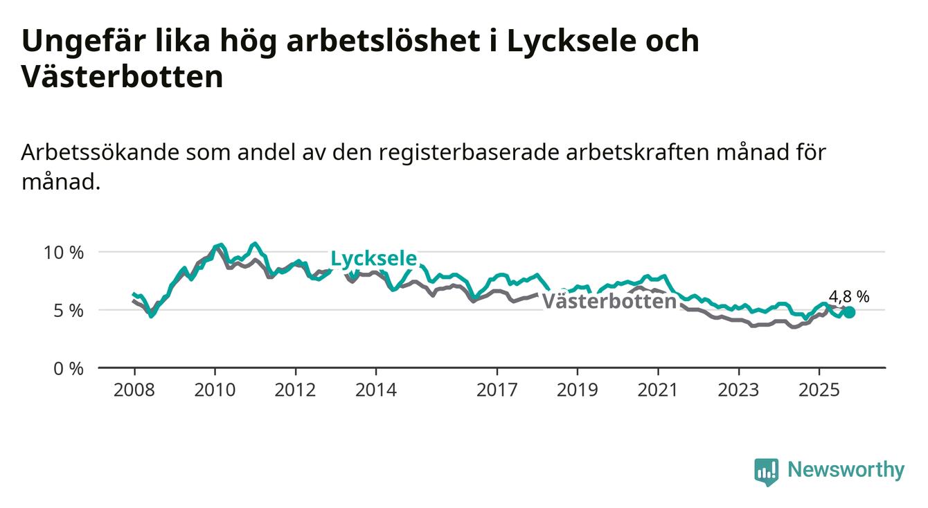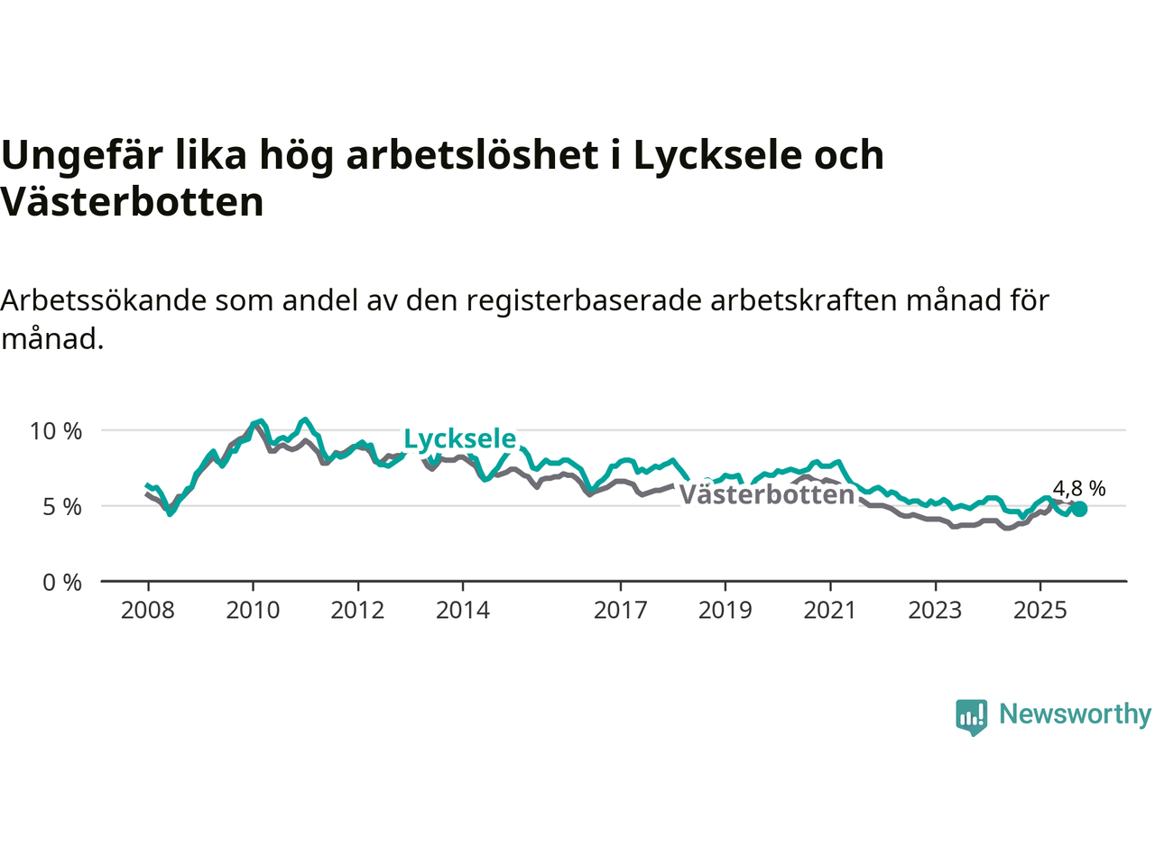 Under oktober månad rapporterade Lycksele kommun en total arbetslöshet på 4,8 procent. Det är en ökning jämfört med samma tidpunkt i fjol (+0,2 procentenheter). Även i Västerbottens län stiger arbetslösheten .