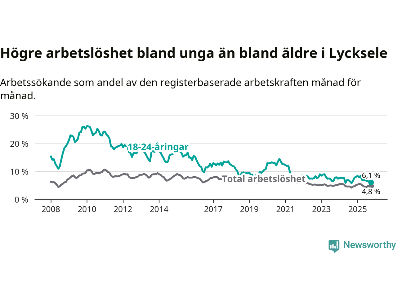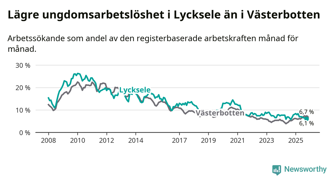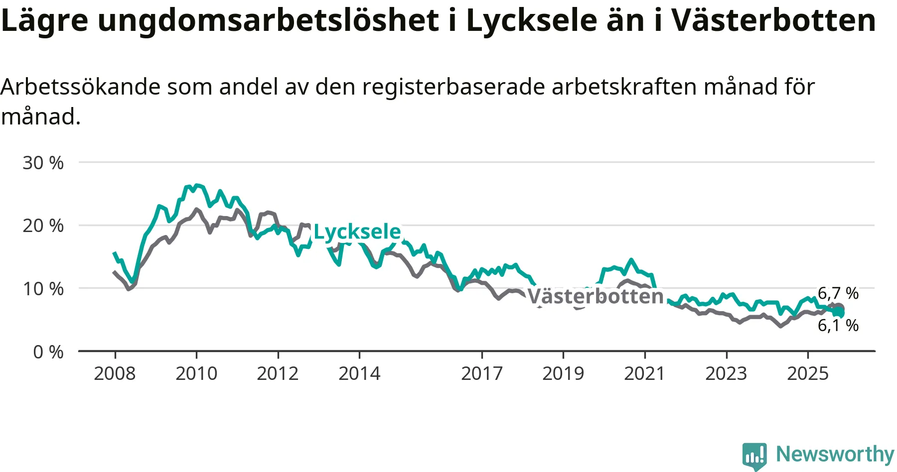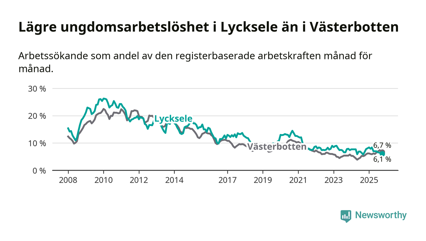 Medan Lycksele har ungefär samma total arbetslöshet som Västerbotten, ligger ungdomsarbetslösheten 0,6 procentenheter lägre i Lycksele.