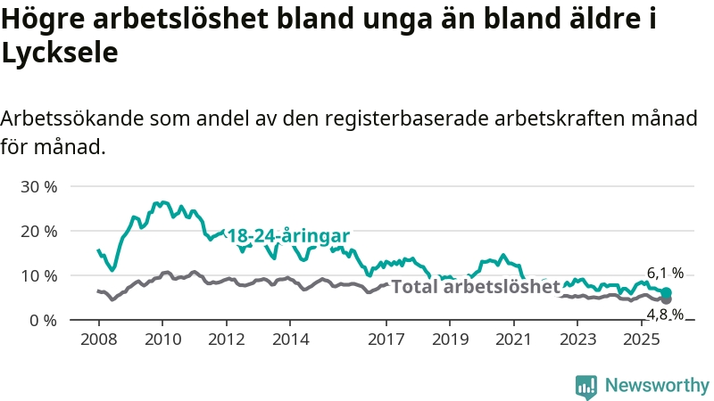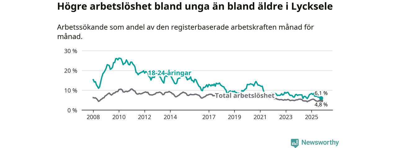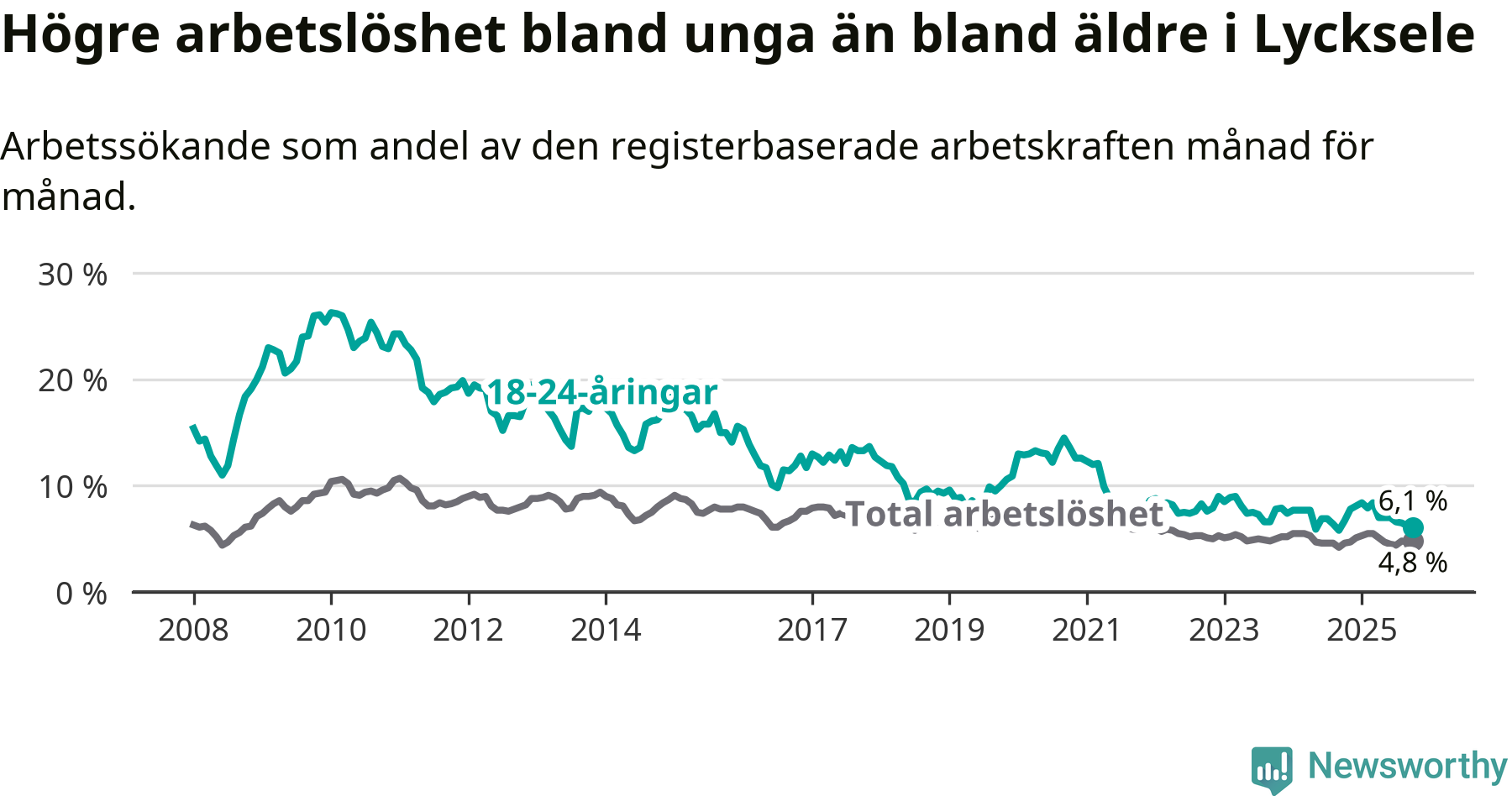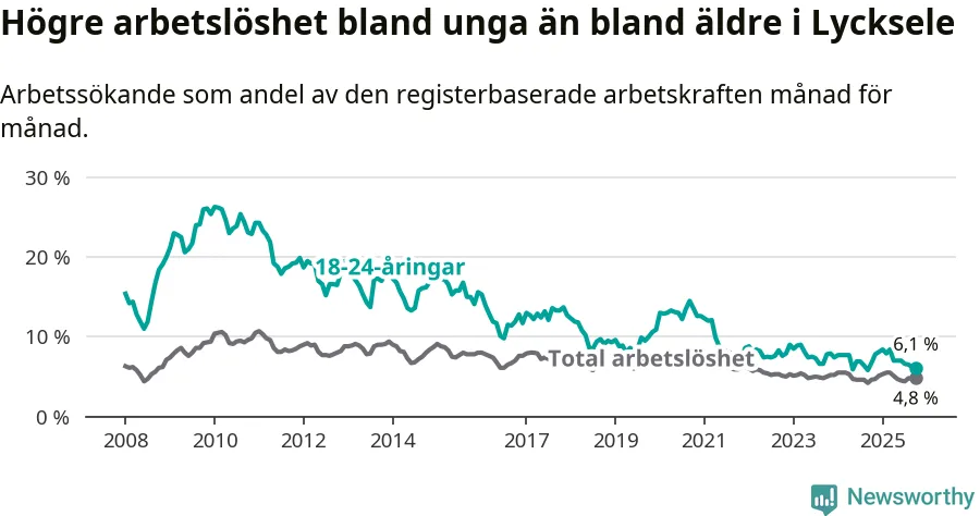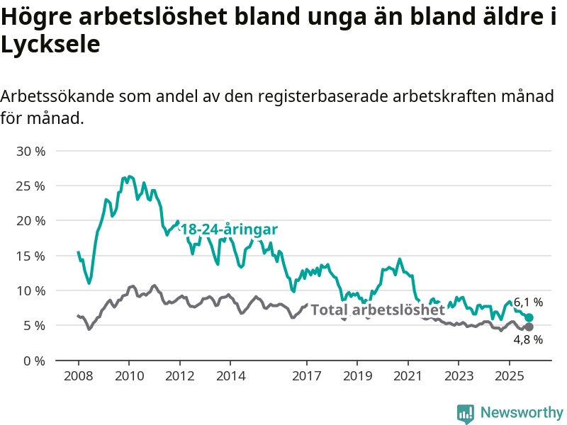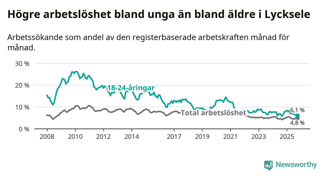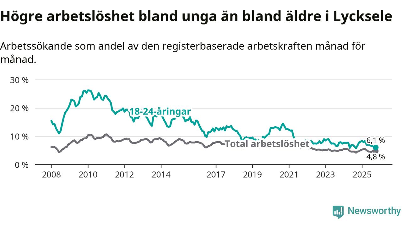 Medan Lycksele har ungefär samma total arbetslöshet som Västerbotten, ligger ungdomsarbetslösheten 0,6 procentenheter lägre i Lycksele.