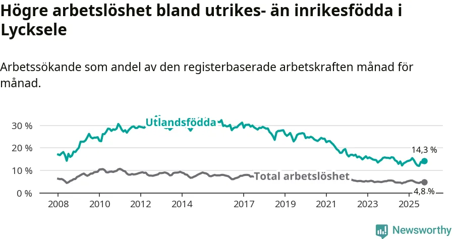 Arbetslösheten bland utlandsfödda var 14,3 procent i Lycksele under oktober månad, motsvarande 126 av 881 personer. Det är 1,1 procentenheter fler än vid samma tidpunkt i fjol (+13 om man räknar personer).