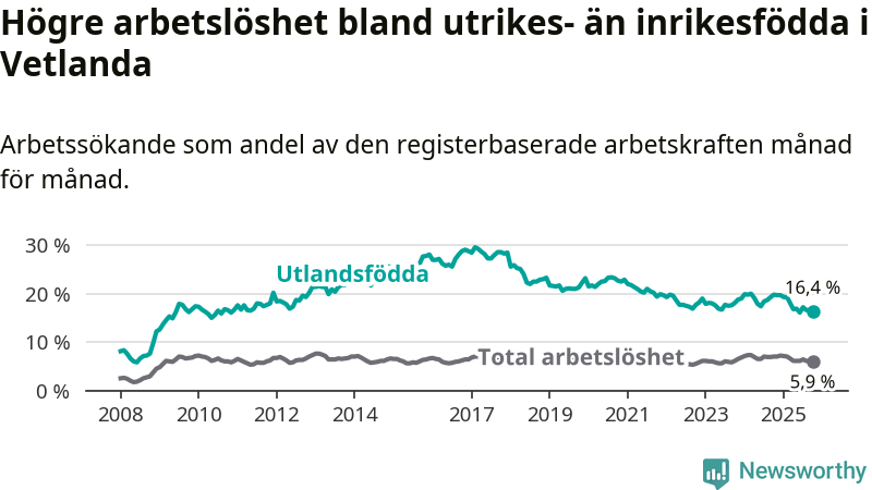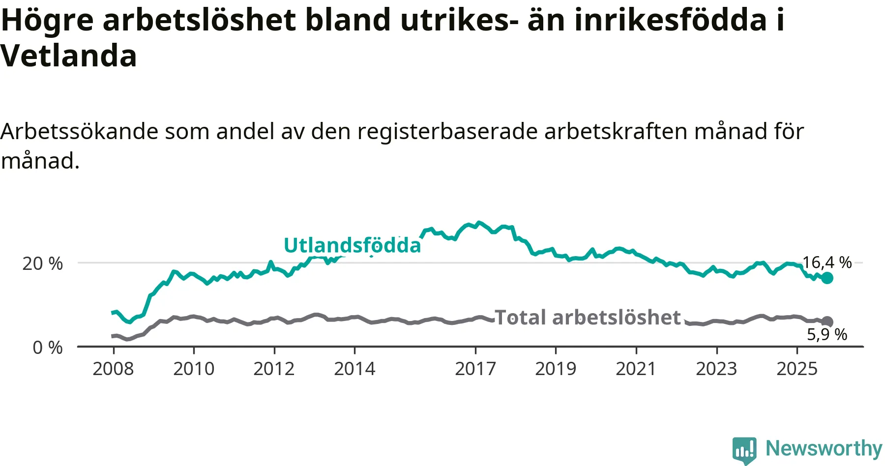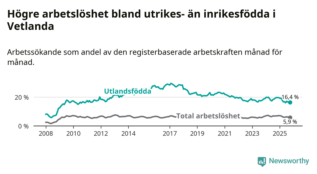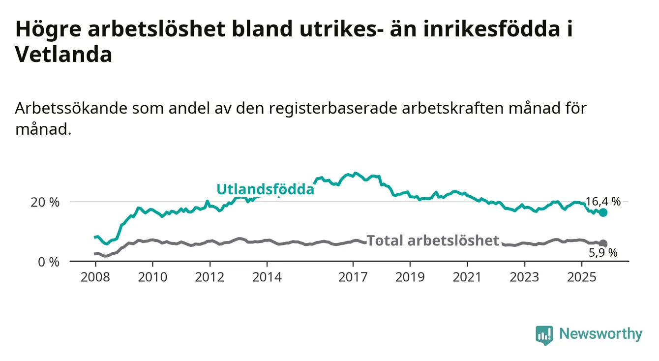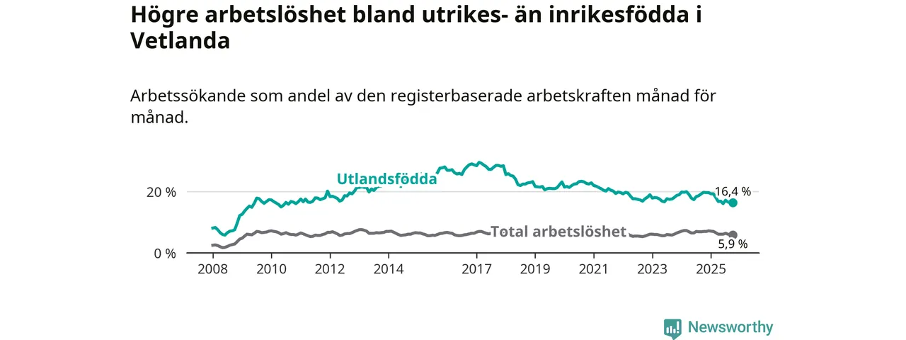 Arbetslösheten bland utlandsfödda var 16,4 procent i Vetlanda under oktober månad, motsvarande 443 av 2 701 personer. Det är 3,4 procentenheter färre än vid samma tidpunkt i fjol (−84 om man räknar personer). Därmed är de utlandsföddas arbetslöshet lägre än vid samma tidpunkt i fjol för tionde månaden i följd. Sedan december 2024 har arbetslösheten bland utlandsfödda minskat från 19,7 till 16,4 procent.