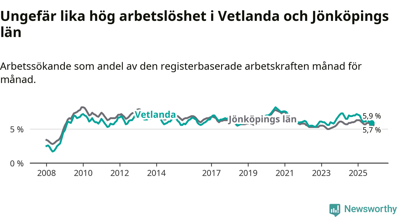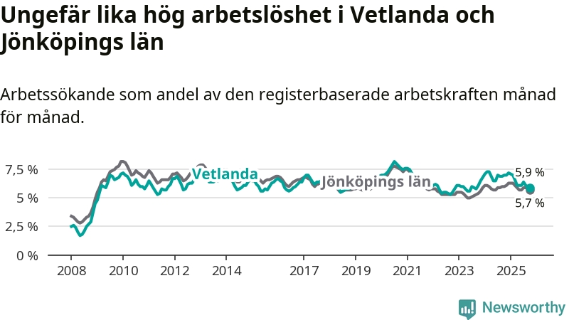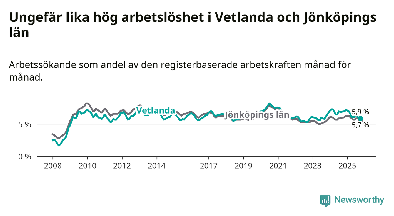 Graf: Arbetslöshet i Vetlanda kommun och Jönköpings län