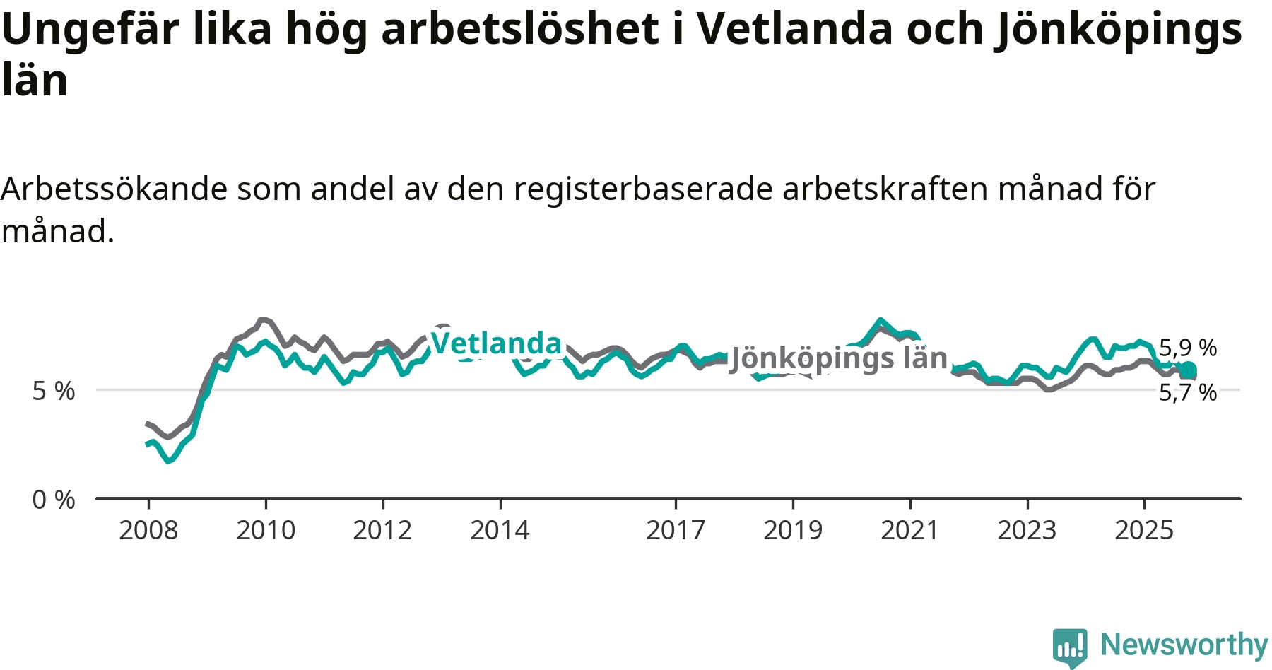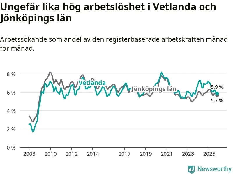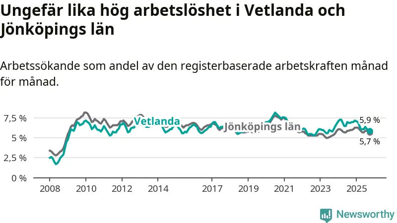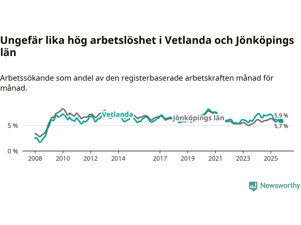 Under oktober månad rapporterade Vetlanda kommun en total arbetslöshet på 5,9 procent. Det är en minskning jämfört med samma tidpunkt i fjol (−1,1 procentenheter). Även i Jönköpings län sjunker arbetslösheten .