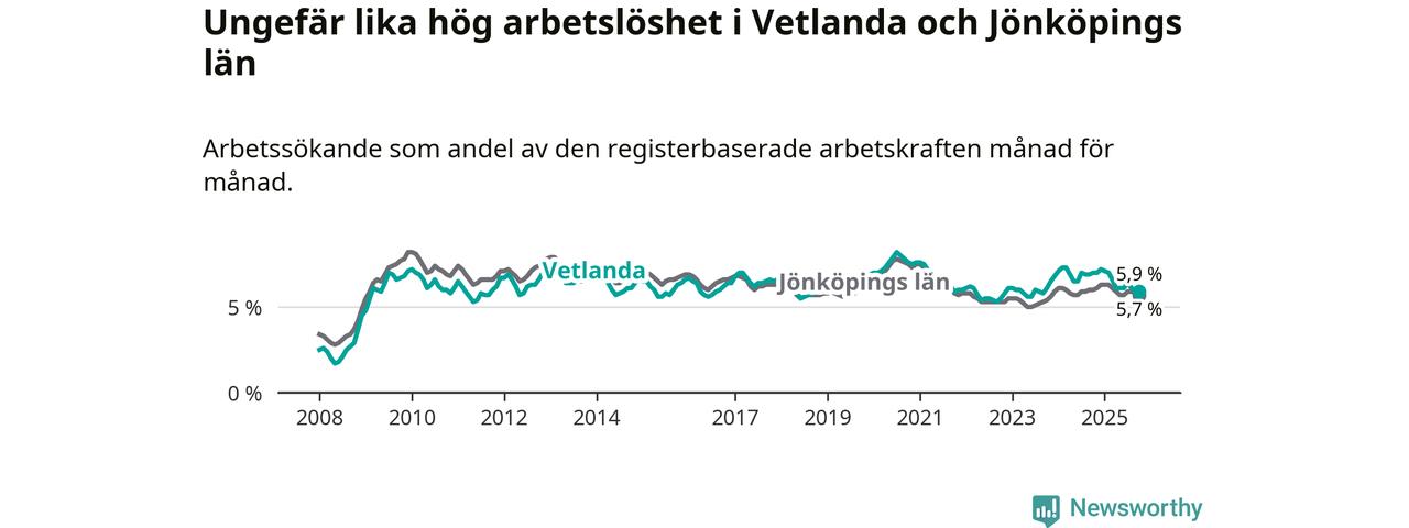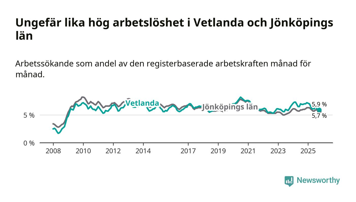 Det är nionde månaden i följd som arbetslösheten i Vetlanda är lägre än den var under samma tidpunkt året innan. Sedan januari har arbetslösheten gått ner från 7,1 till 5,9 procent. Den nuvarande arbetslöshetsnivån är därmed den lägsta sedan september 2023.