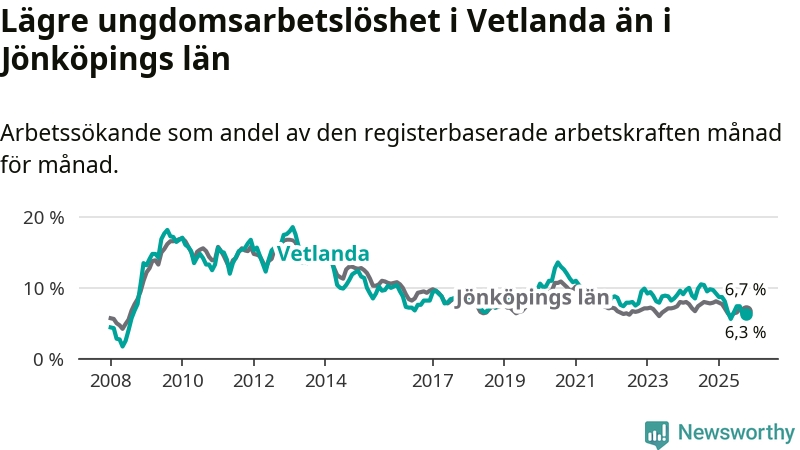 I och med den senaste månadens nedgång har de ungas arbetslöshet i Vetlanda sjunkit elva månader i följd (ner från 9,7 procent i november 2024 till 6,3 procent nu).