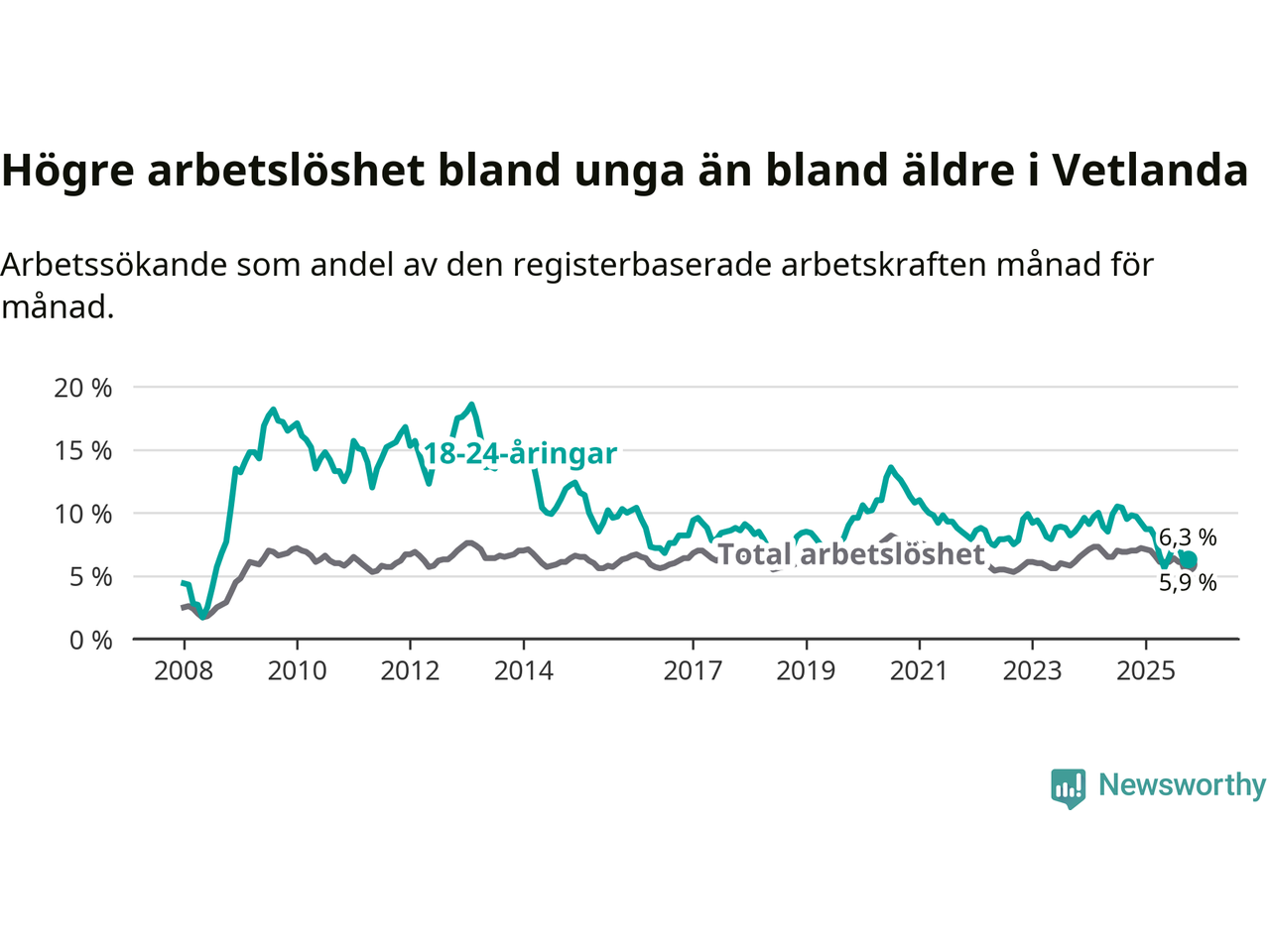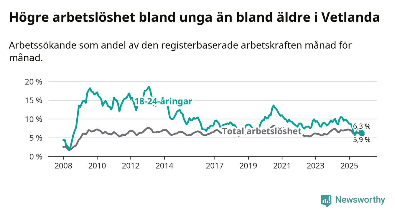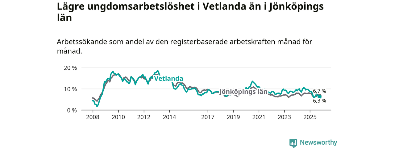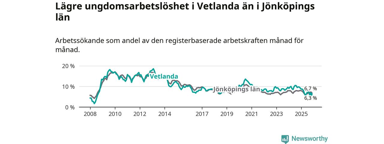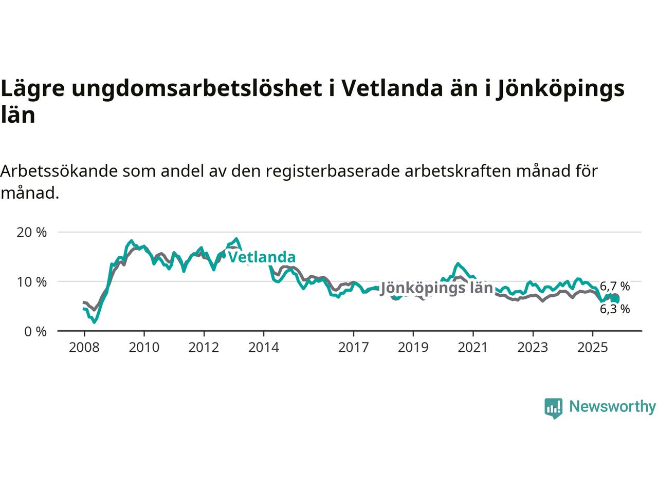 Medan Vetlanda har ungefär samma total arbetslöshet som Jönköpings län, ligger ungdomsarbetslösheten 0,4 procentenheter lägre i Vetlanda.