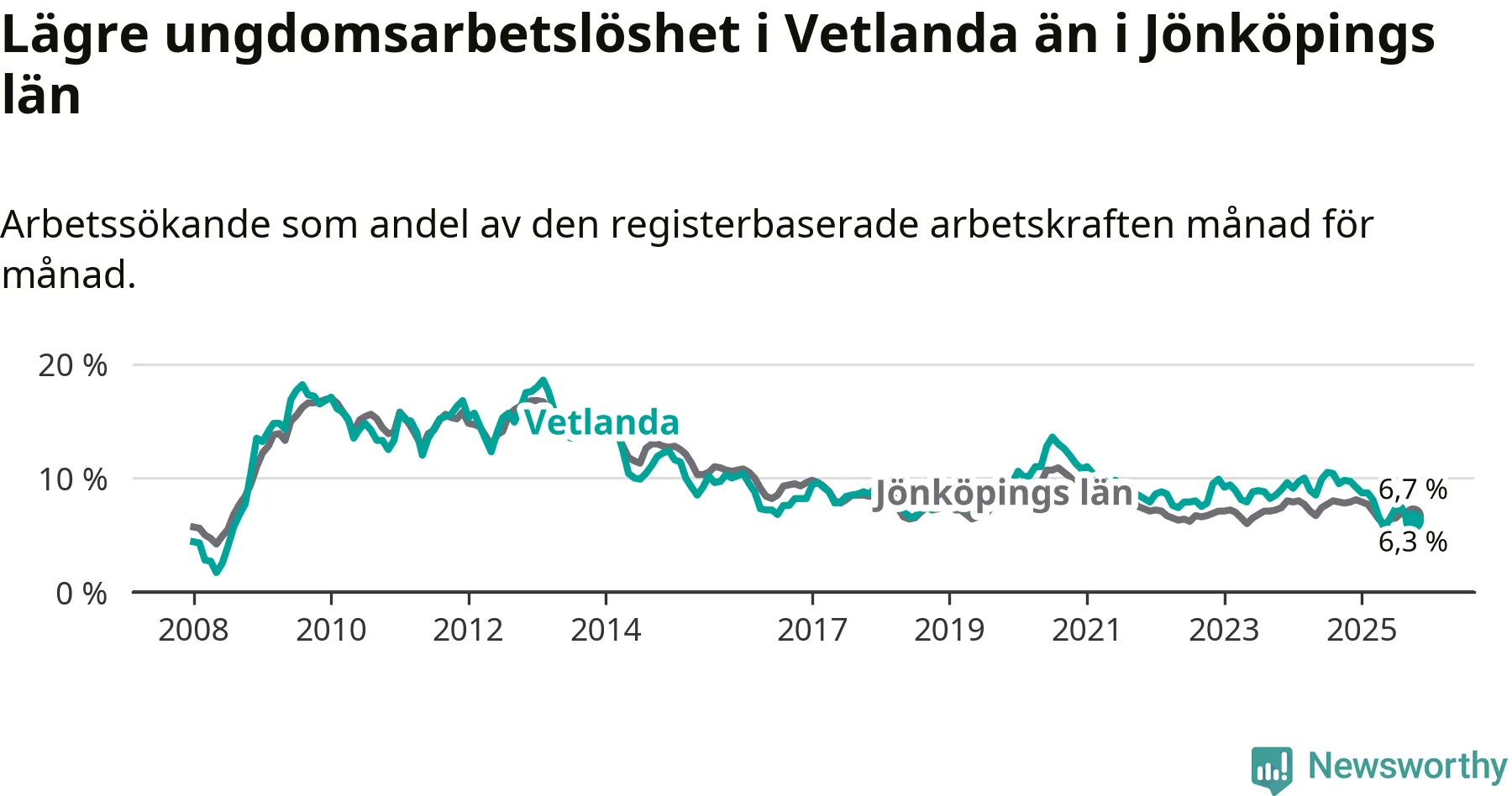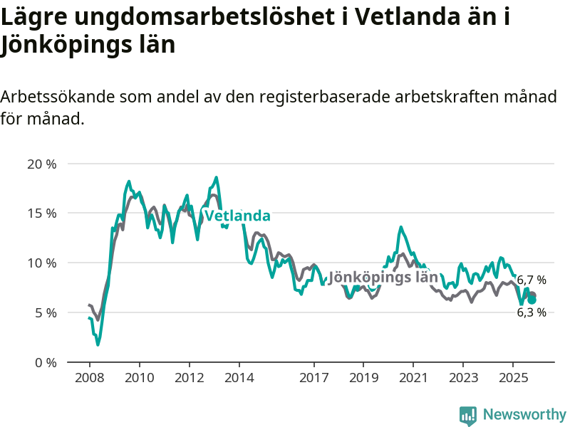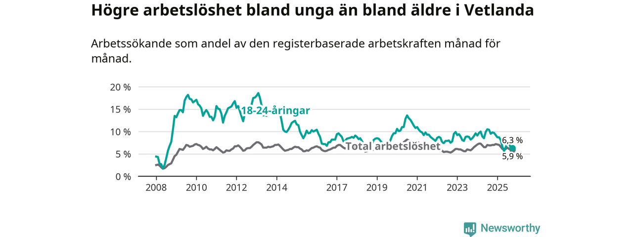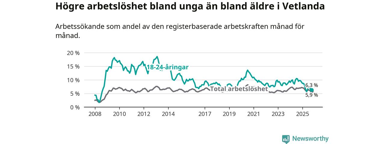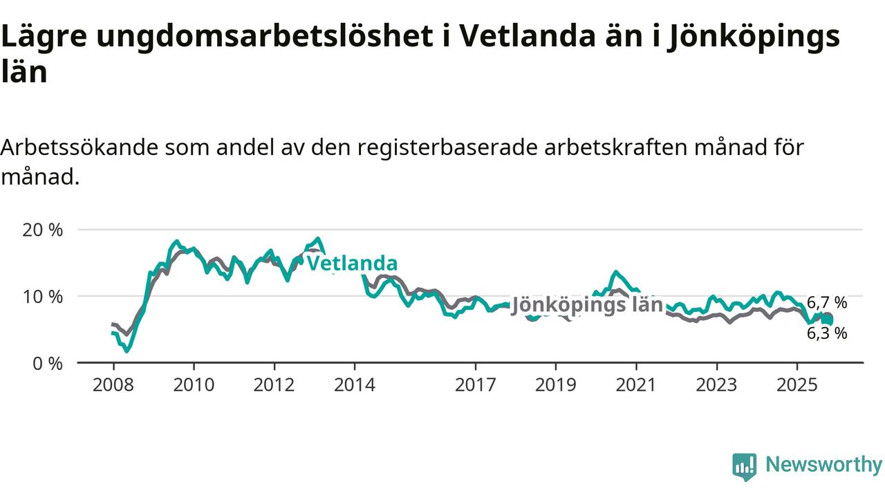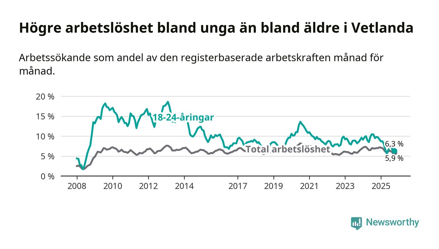 Medan Vetlanda har ungefär samma total arbetslöshet som Jönköpings län, ligger ungdomsarbetslösheten 0,4 procentenheter lägre i Vetlanda.