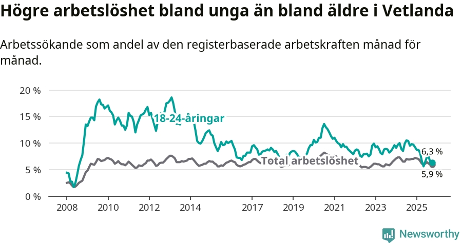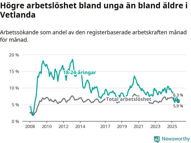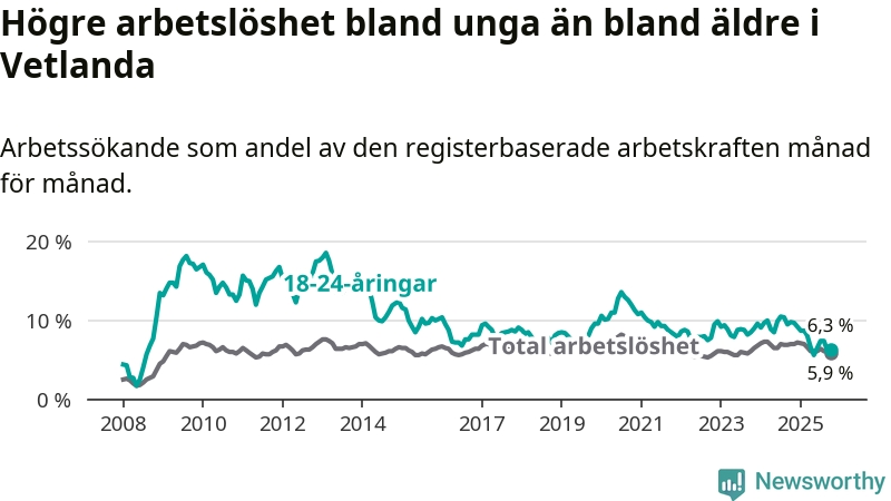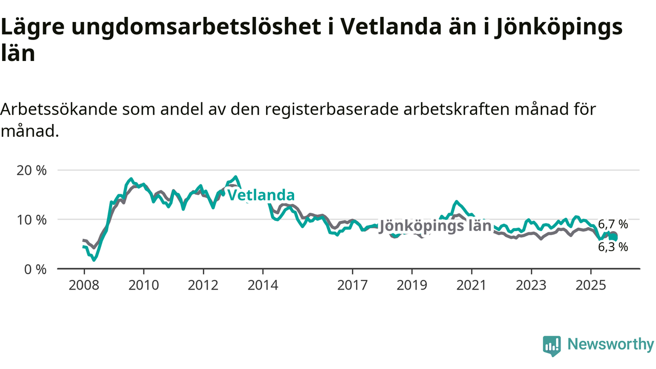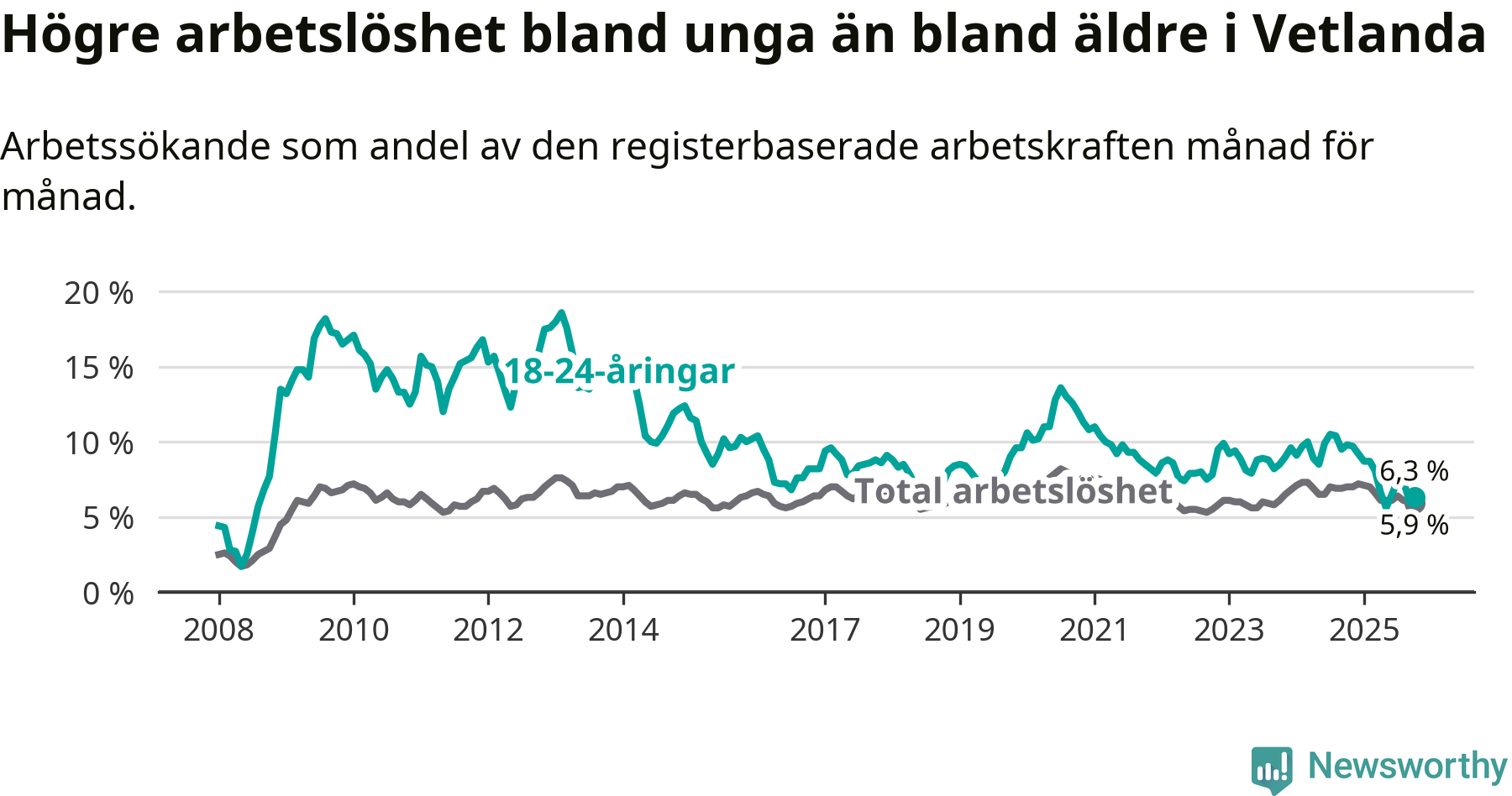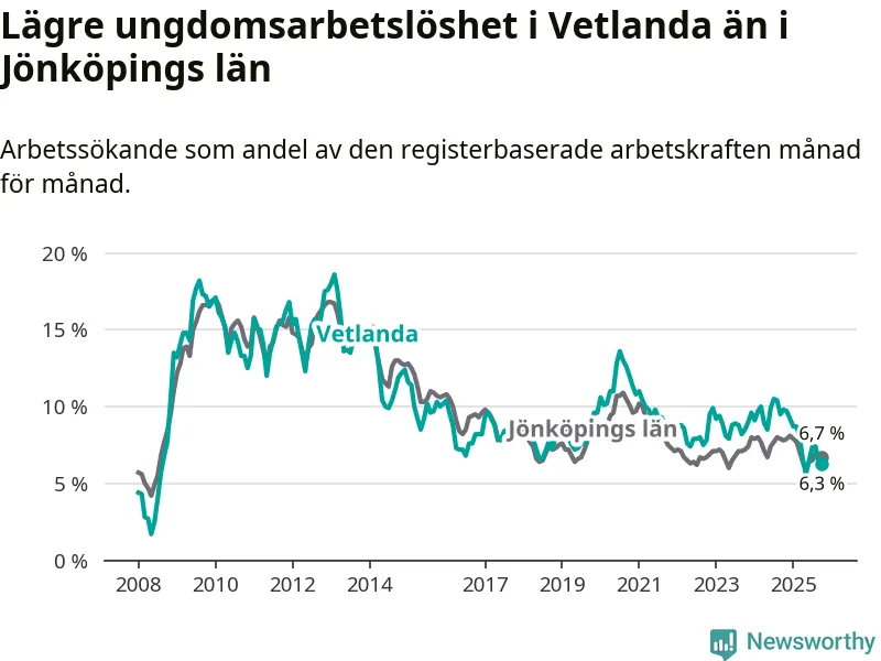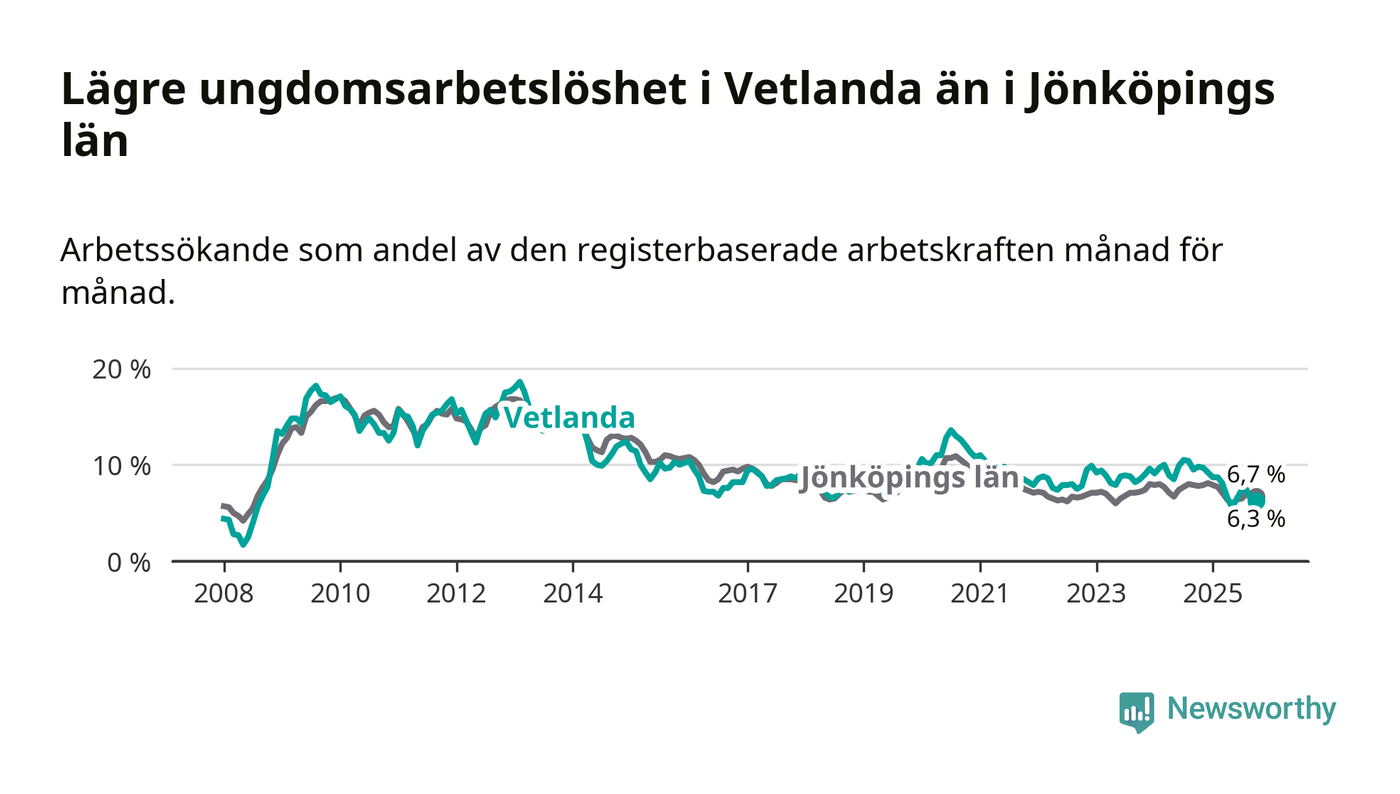Medan Vetlanda har ungefär samma total arbetslöshet som Jönköpings län, ligger ungdomsarbetslösheten 0,4 procentenheter lägre i Vetlanda.