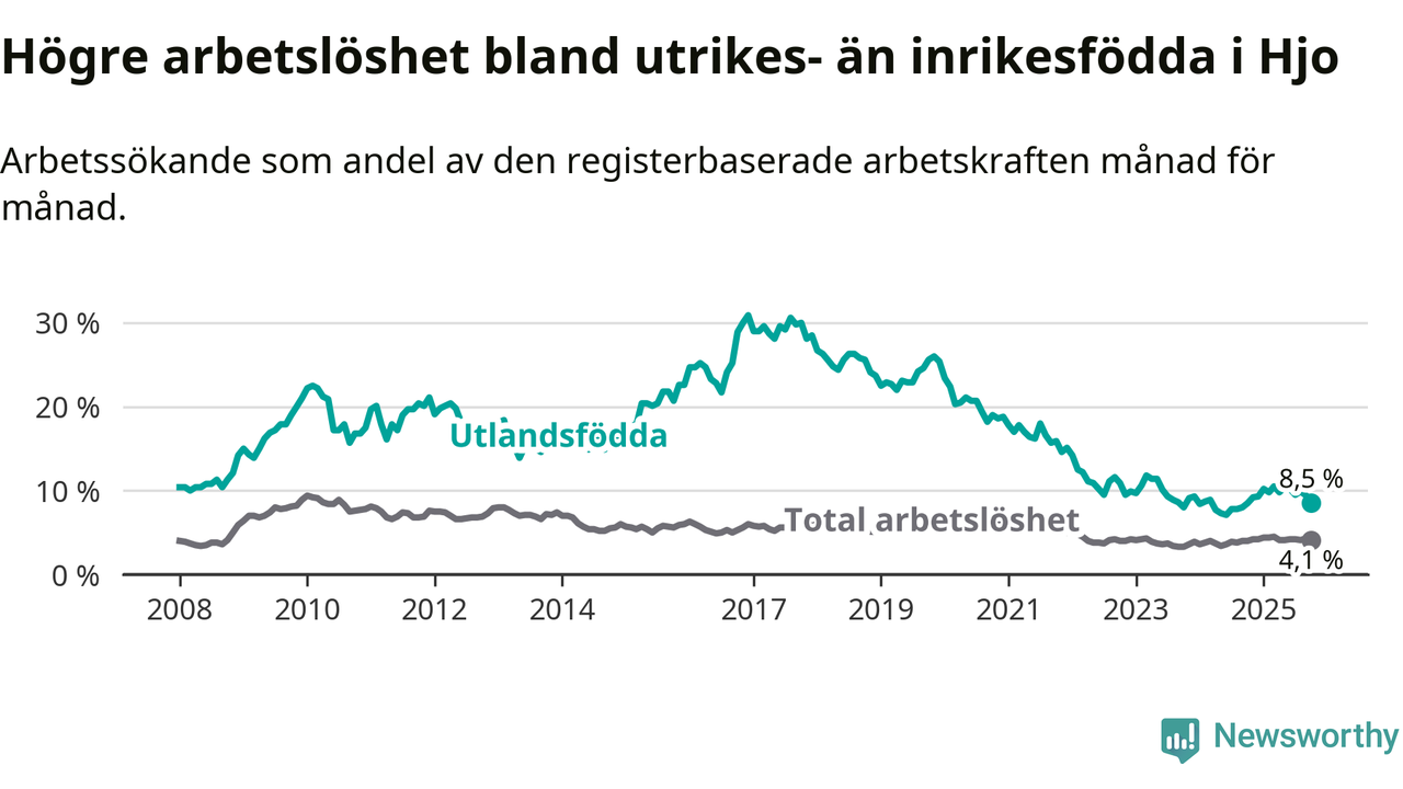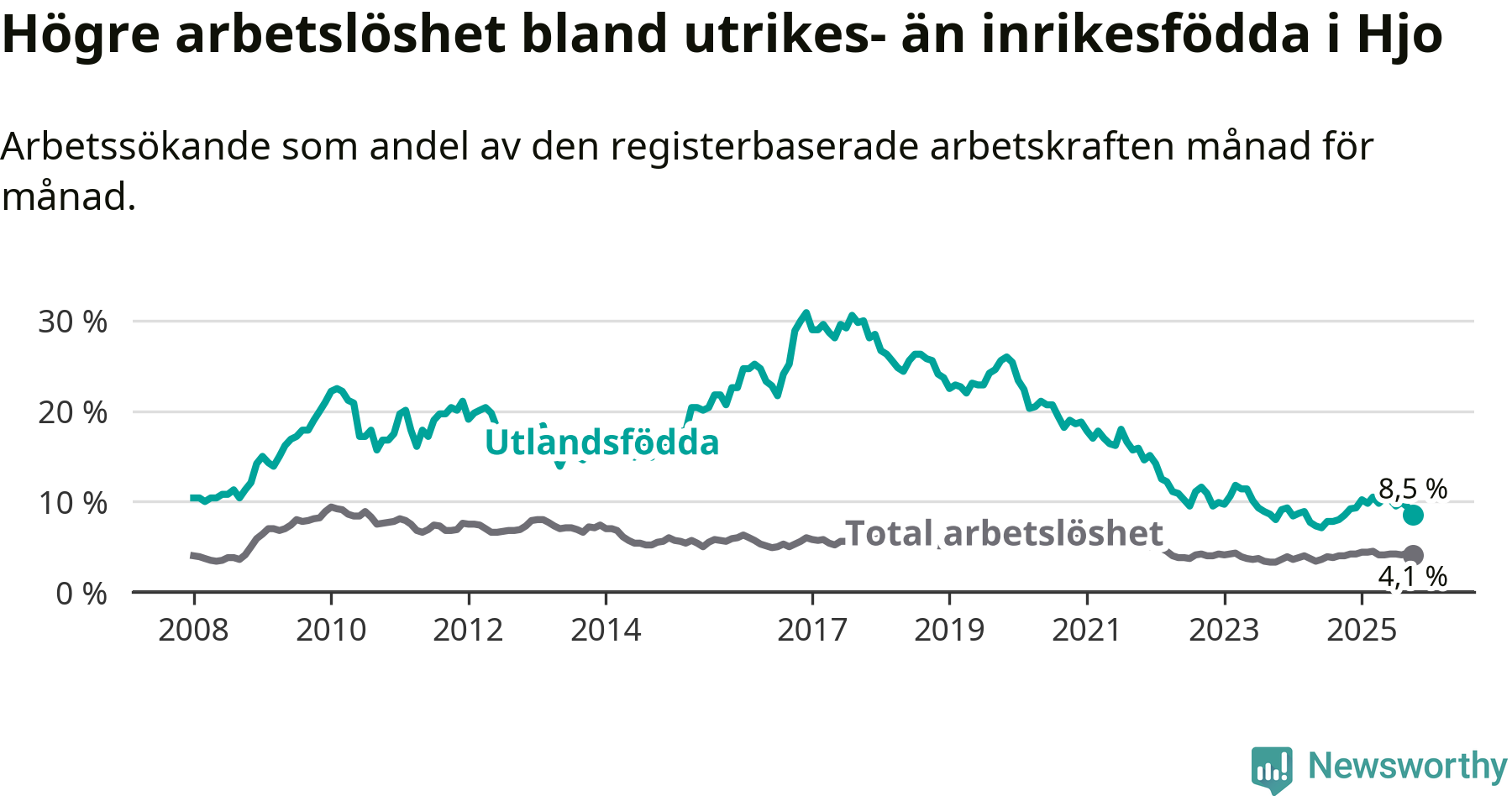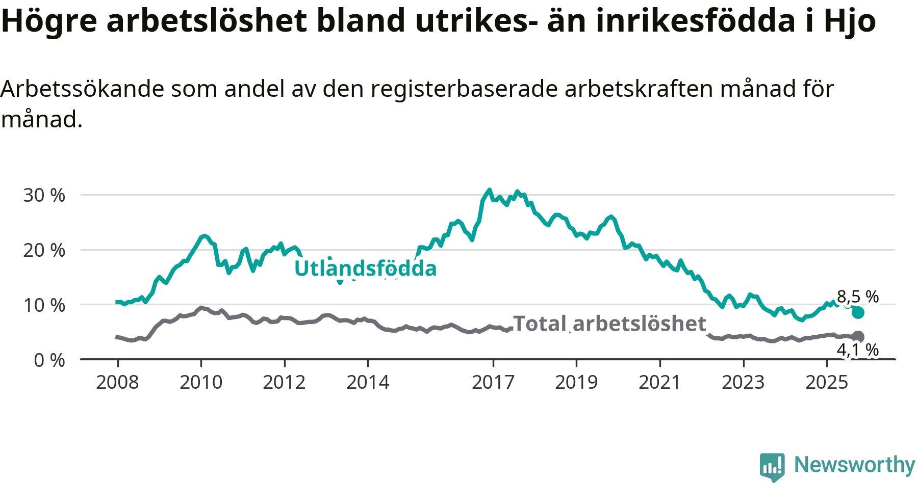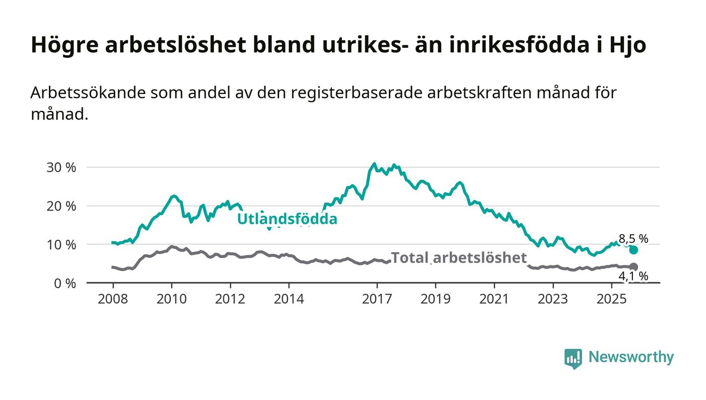 Arbetslösheten bland utlandsfödda var 8,5 procent i Hjo under oktober månad, motsvarande 37 av 435 personer. Det är i stort sett lika stor andel som i fjol.