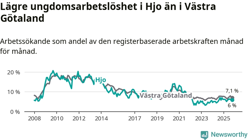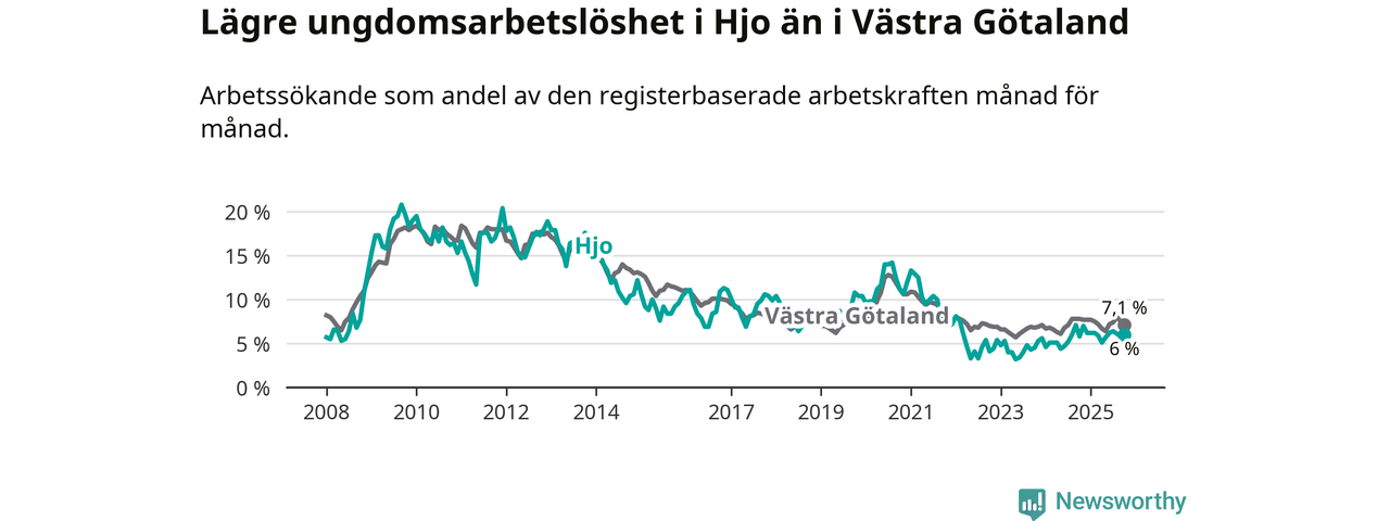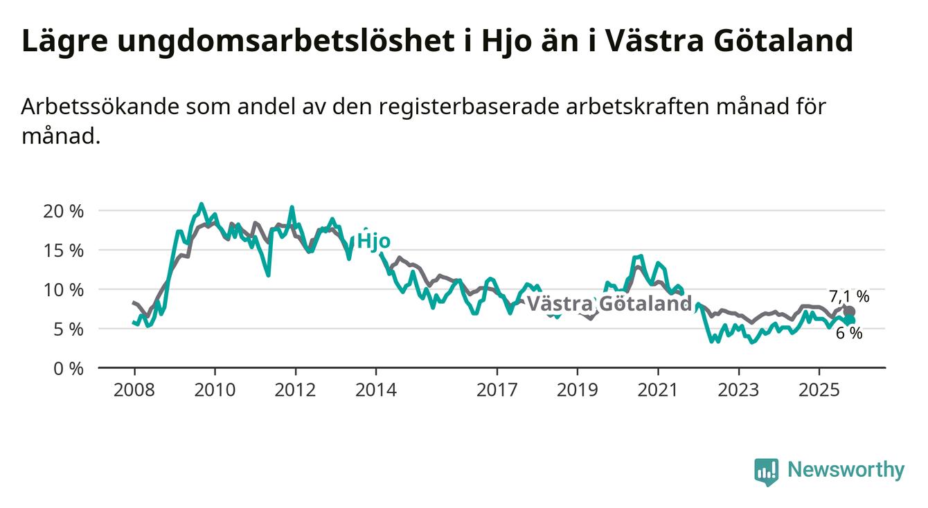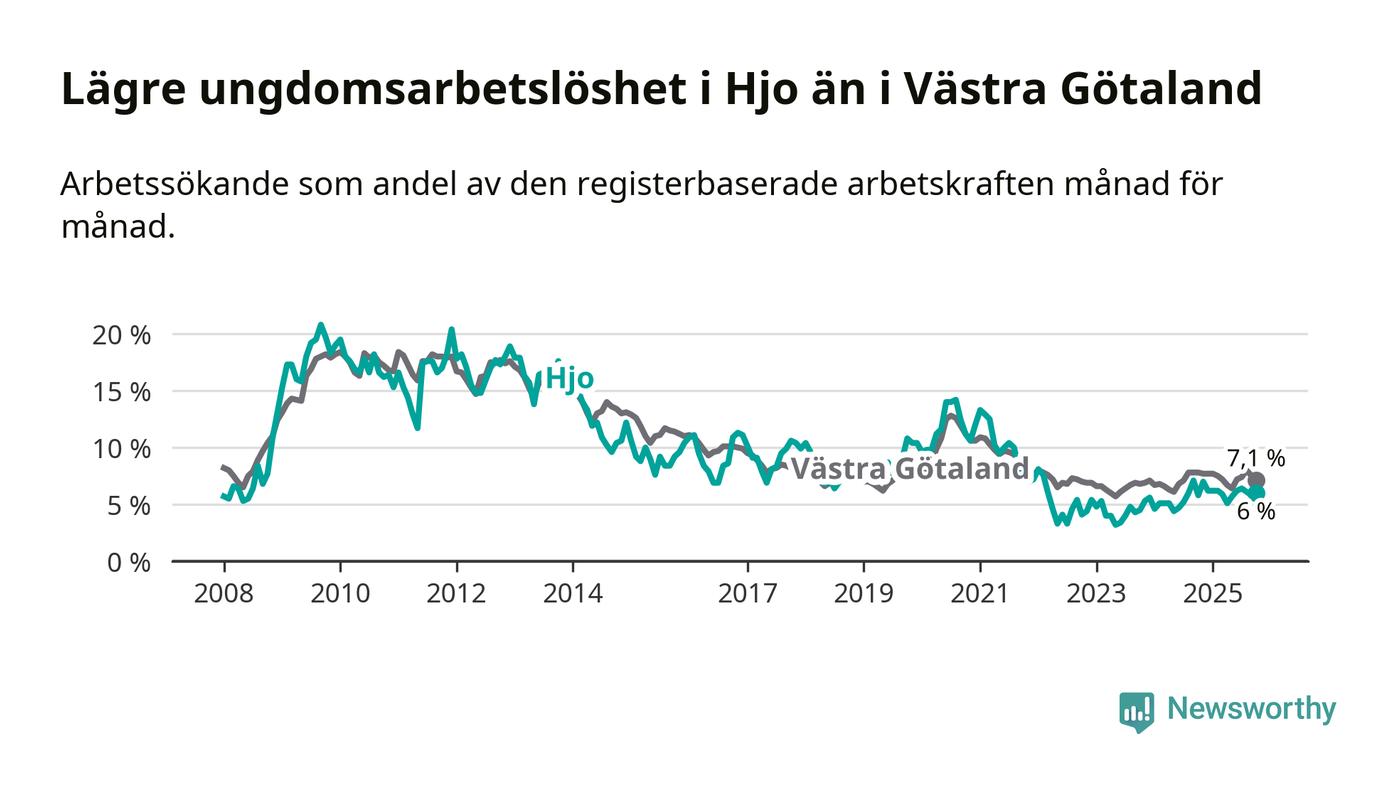 Precis som den totala arbetslösheten ligger ungdomsarbetslösheten i Hjo lägre än i Västra Götaland som helhet. Skillnaden mellan kommunen och länet är 1,1 procentenheter.