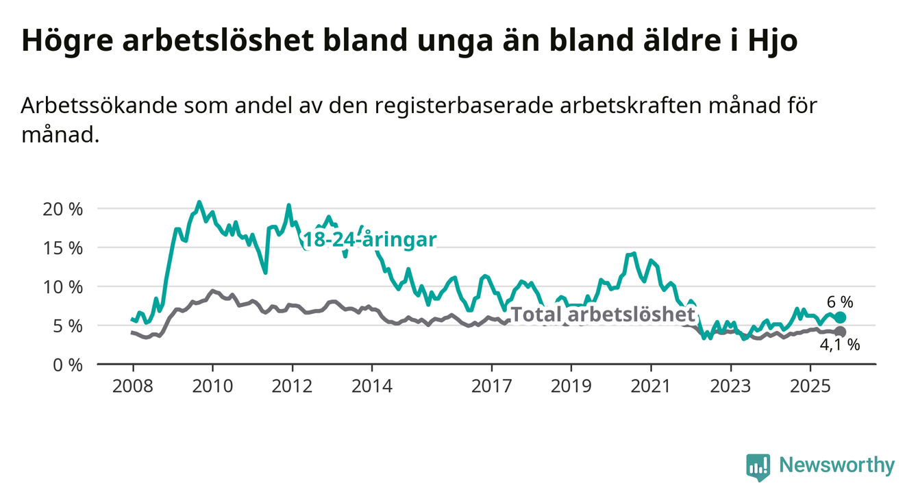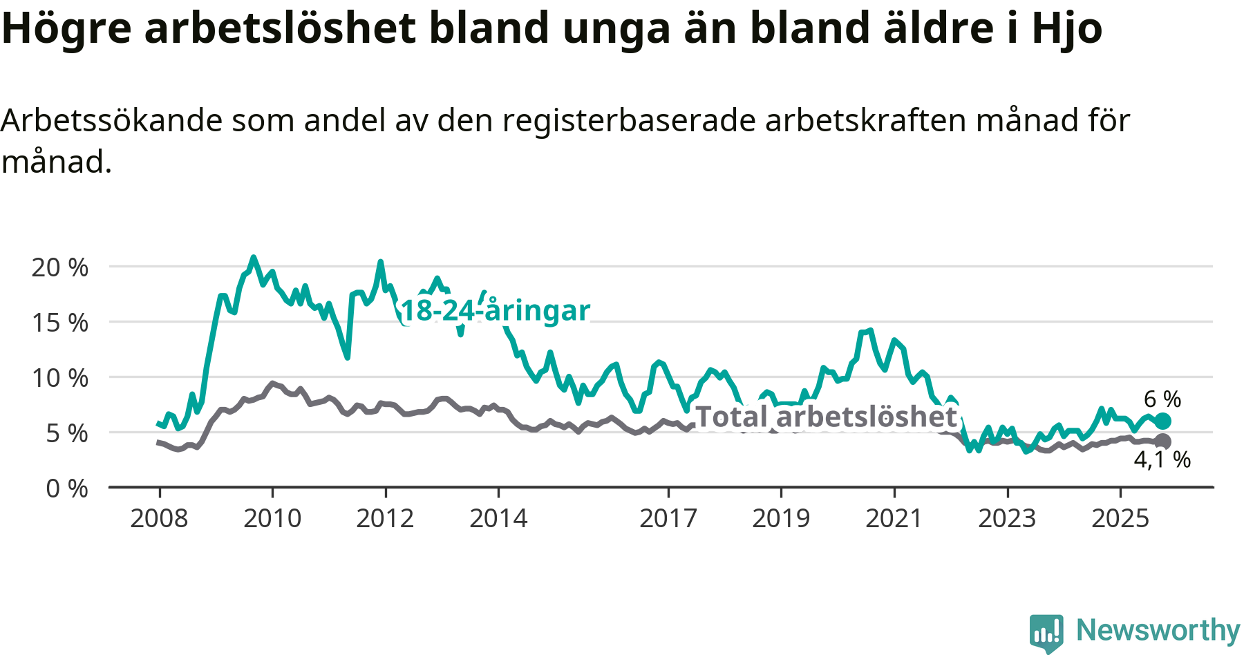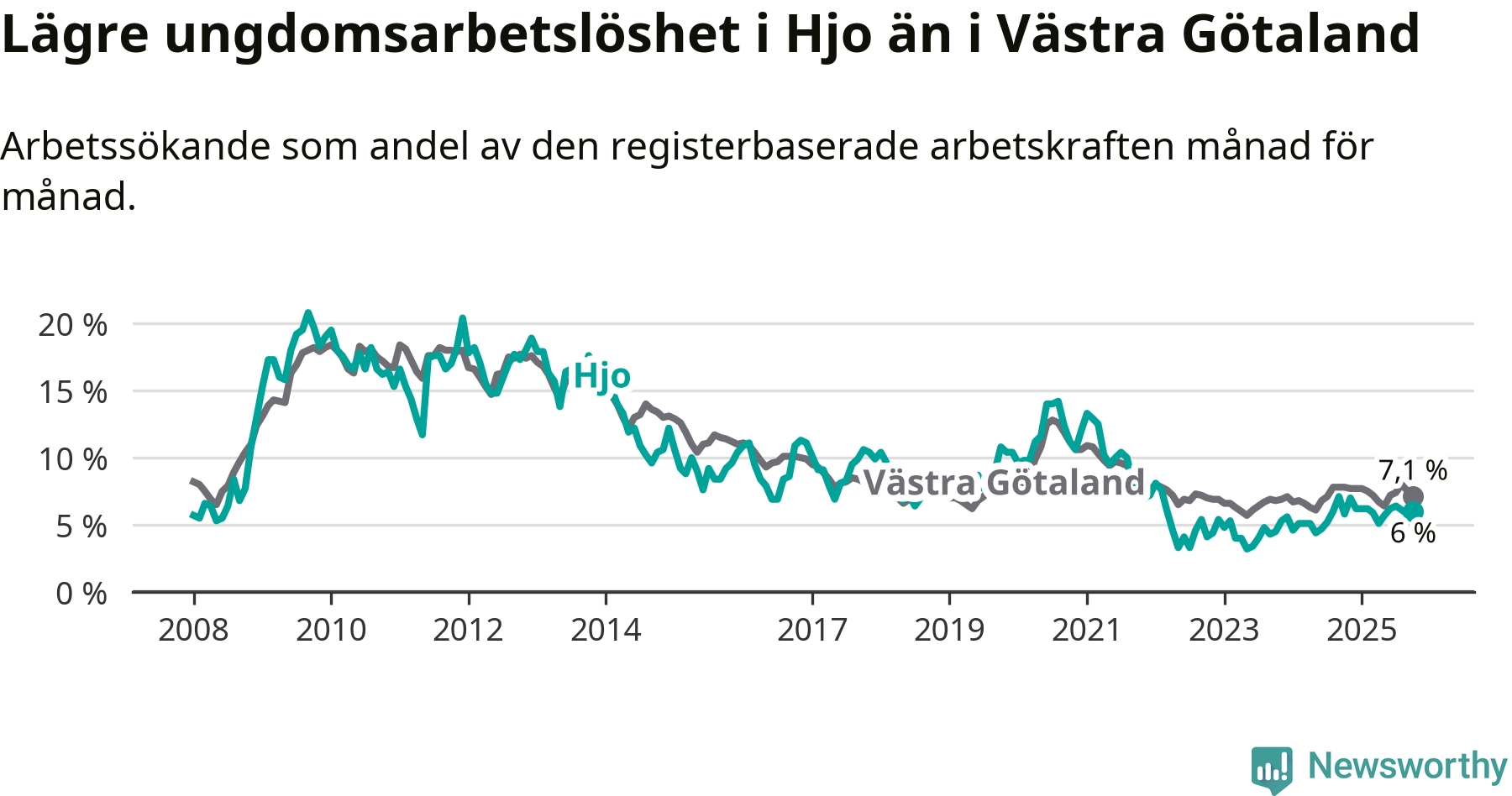 Precis som den totala arbetslösheten ligger ungdomsarbetslösheten i Hjo lägre än i Västra Götaland som helhet. Skillnaden mellan kommunen och länet är 1,1 procentenheter.