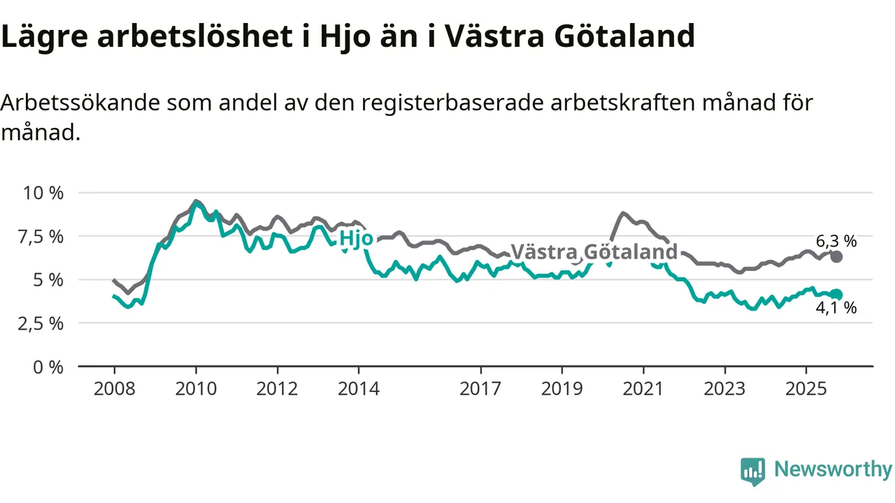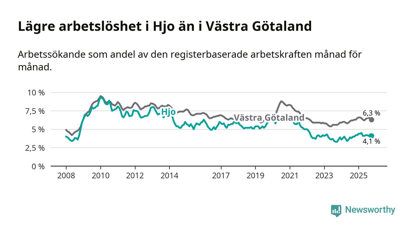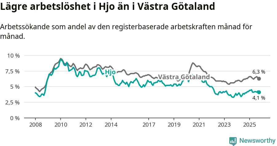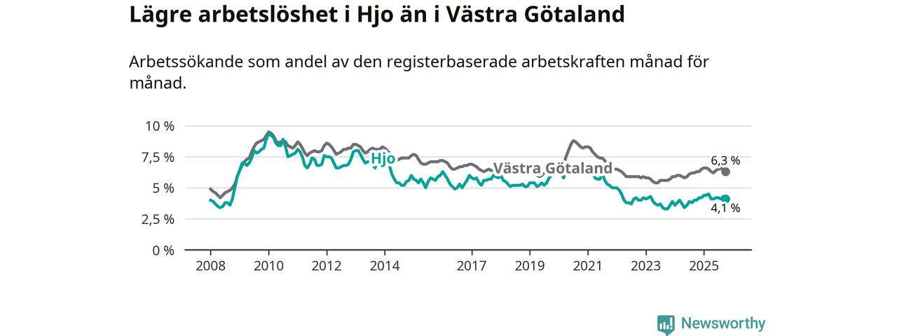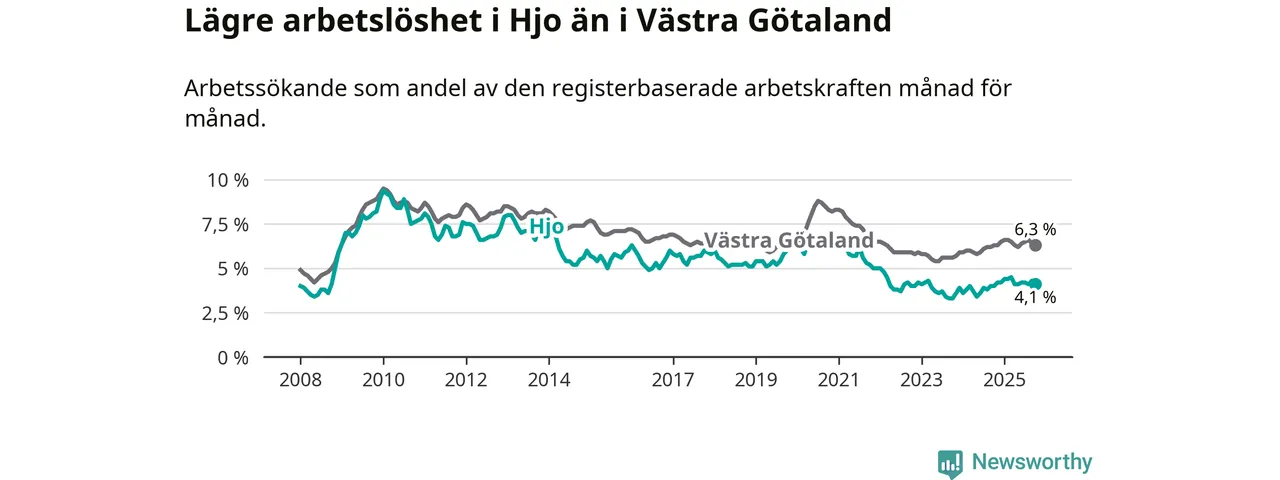Under oktober månad rapporterade Hjo kommun en total arbetslöshet på 4,1 procent. Det är en ökning jämfört med samma tidpunkt i fjol (+0,1 procentenheter). I Västra Götalands län däremot står arbetslösheten stilla.