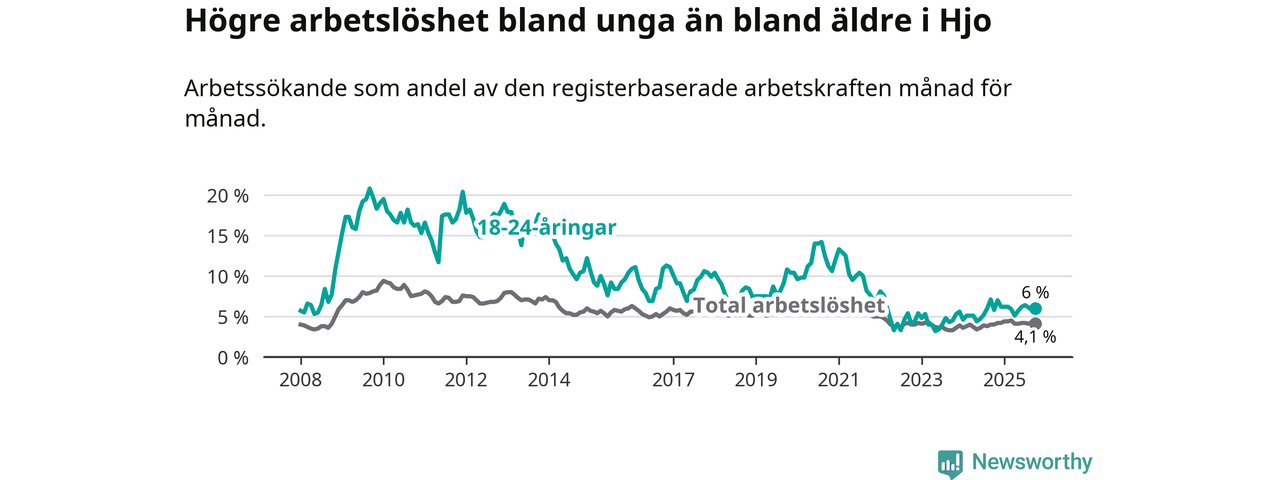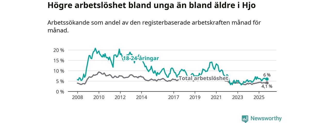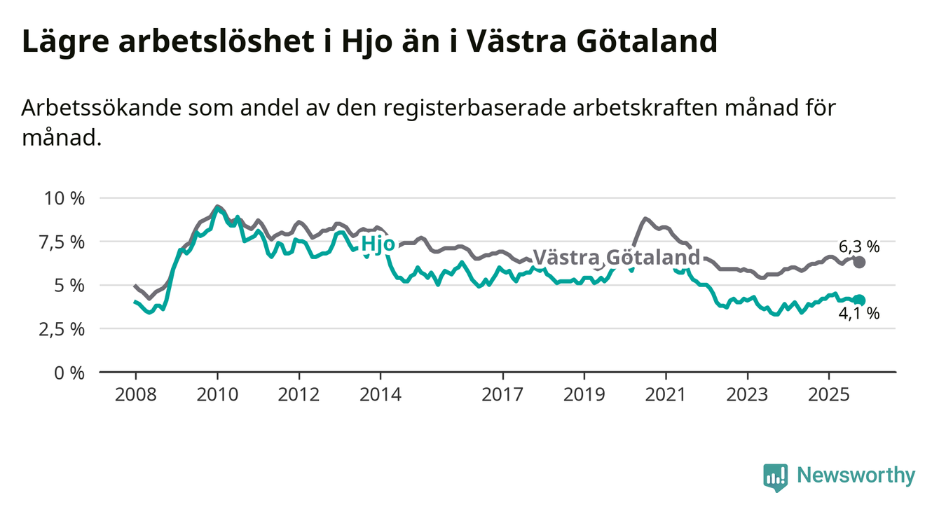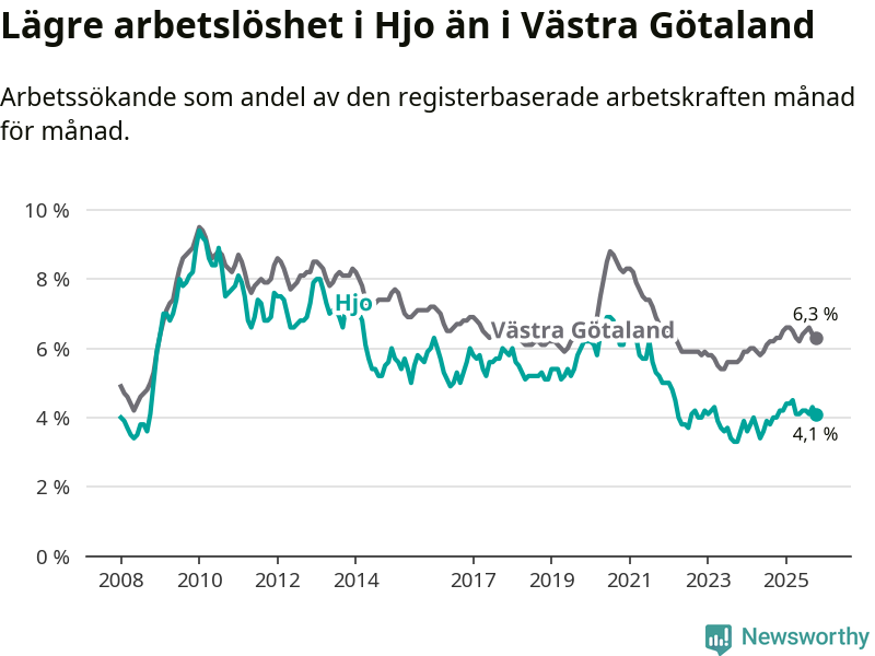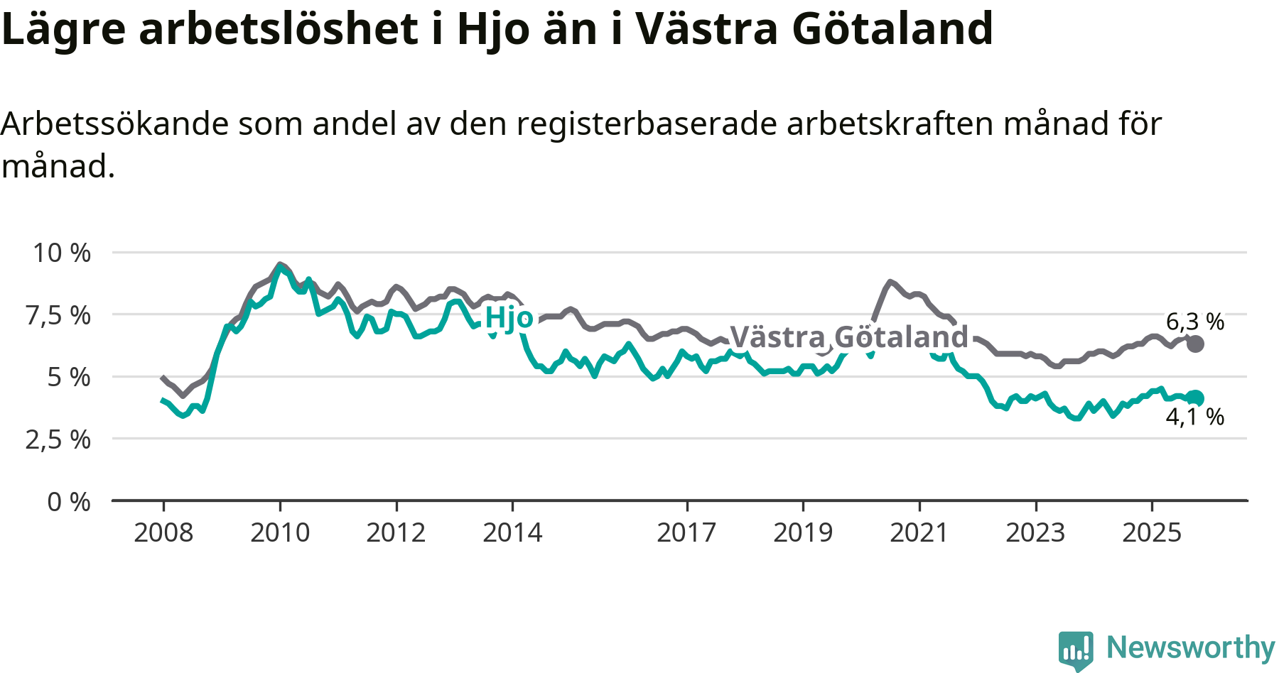 Under oktober månad rapporterade Hjo kommun en total arbetslöshet på 4,1 procent. Det är en ökning jämfört med samma tidpunkt i fjol (+0,1 procentenheter). I Västra Götalands län däremot står arbetslösheten stilla.