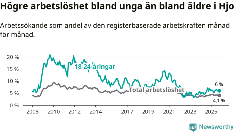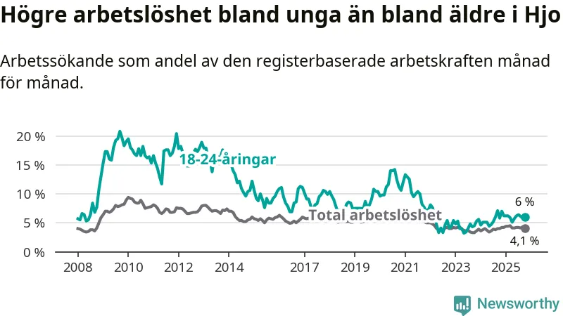 Precis som den totala arbetslösheten stiger arbetslösheten bland unga (+0,2 procentenheter). I oktober var 6,0 procent av 18–24-åringarna inskrivna som arbetssökande (motsvarande 24 personer). Mäter vi antalet inskrivna ser vi en ökning med två personer på ett års sikt.