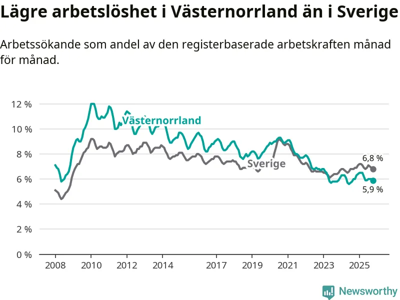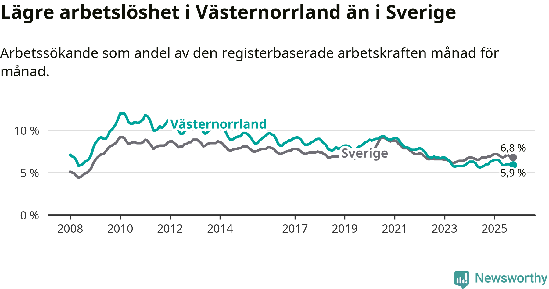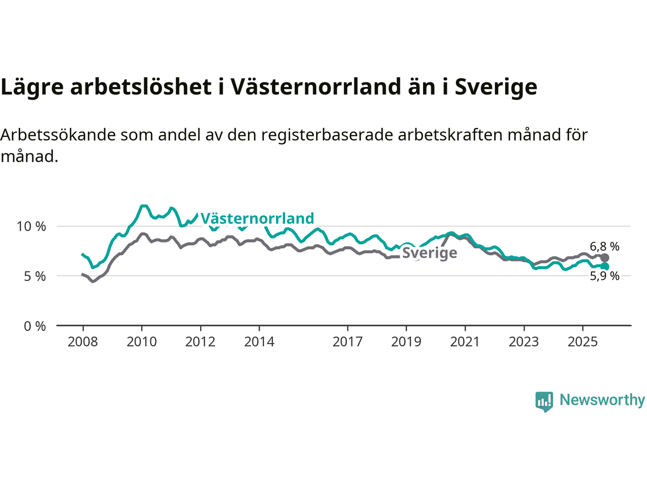 Västernorrland hade redan tidigare lägre arbetslöshet än snittet i hela Sverige och nu växer klyftan (5,9 procent i länet, jämfört med 6,8 procent i hela riket). Norrbotten har den lägsta arbetslösheten i riket (3,9 procent), medan Skåne har den högsta (8,8 procent). För att Västernorrland skulle komma ner i samma arbetslöshetsnivå som Norrbotten skulle 2 306 personer behöva sysselsättas.