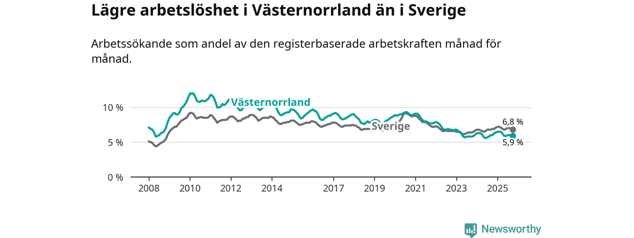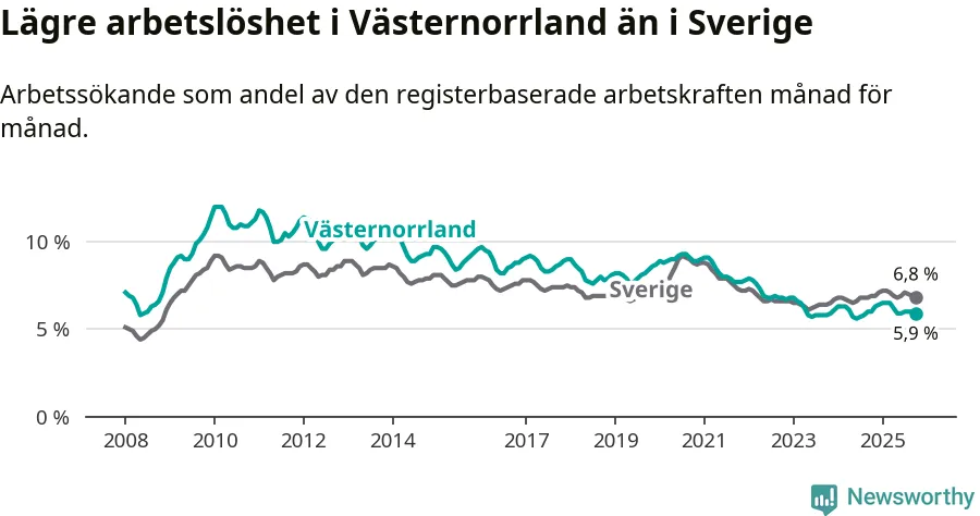 Under oktober månad rapporterade Västernorrlands län en total arbetslöshet på 5,9 procent. Det är en minskning jämfört med samma tidpunkt i fjol (−0,1 procentenheter). Även i Sverige sjunker arbetslösheten något.