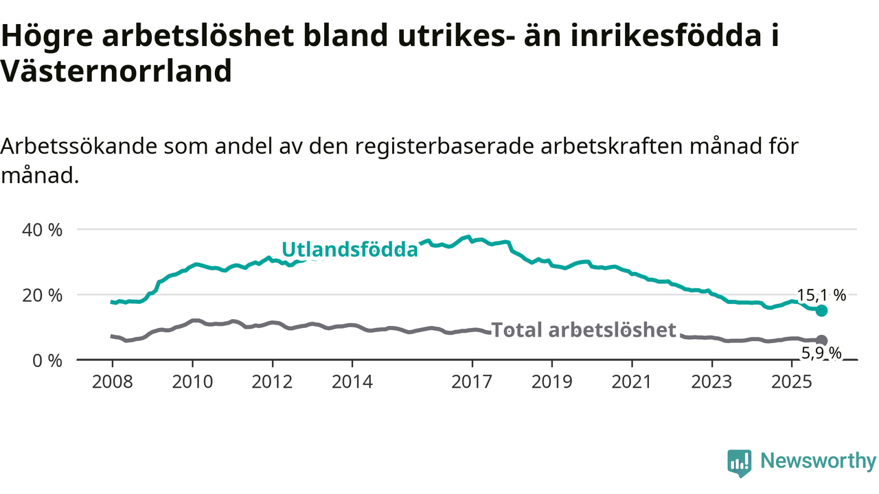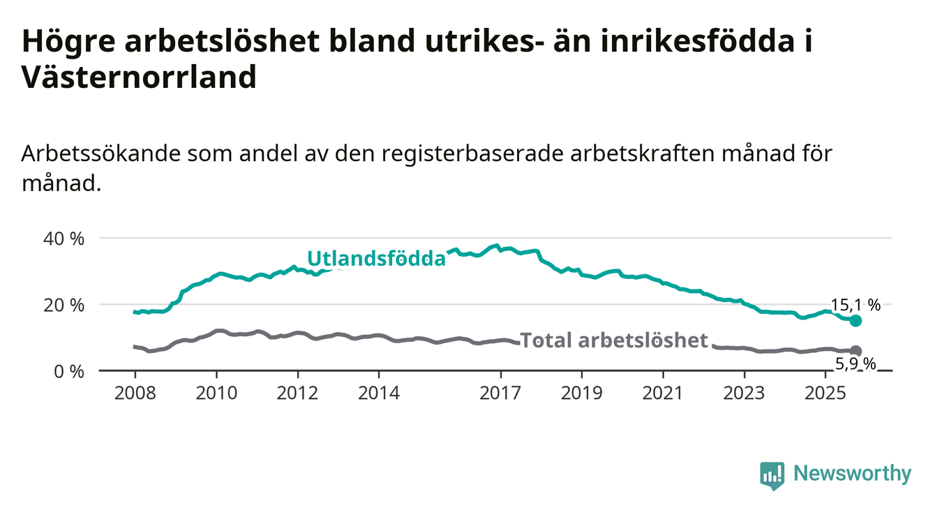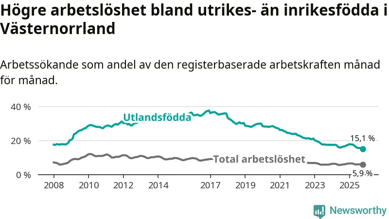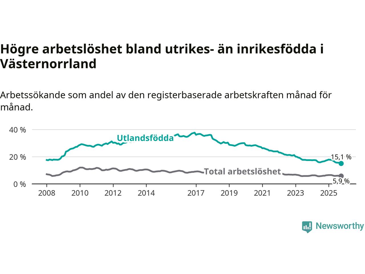 Skillnaden i arbetslöshet mellan utrikesfödda och hela befolkningen är 9,2 procentenheter i Västernorrland. Det är en betydligt mindre skillnad än för ett år sedan (−1,5 procentenheter).