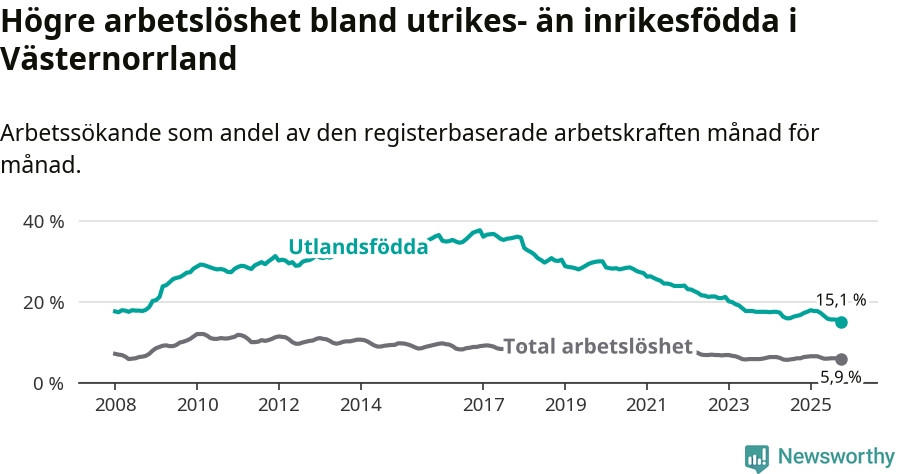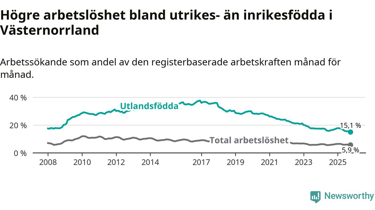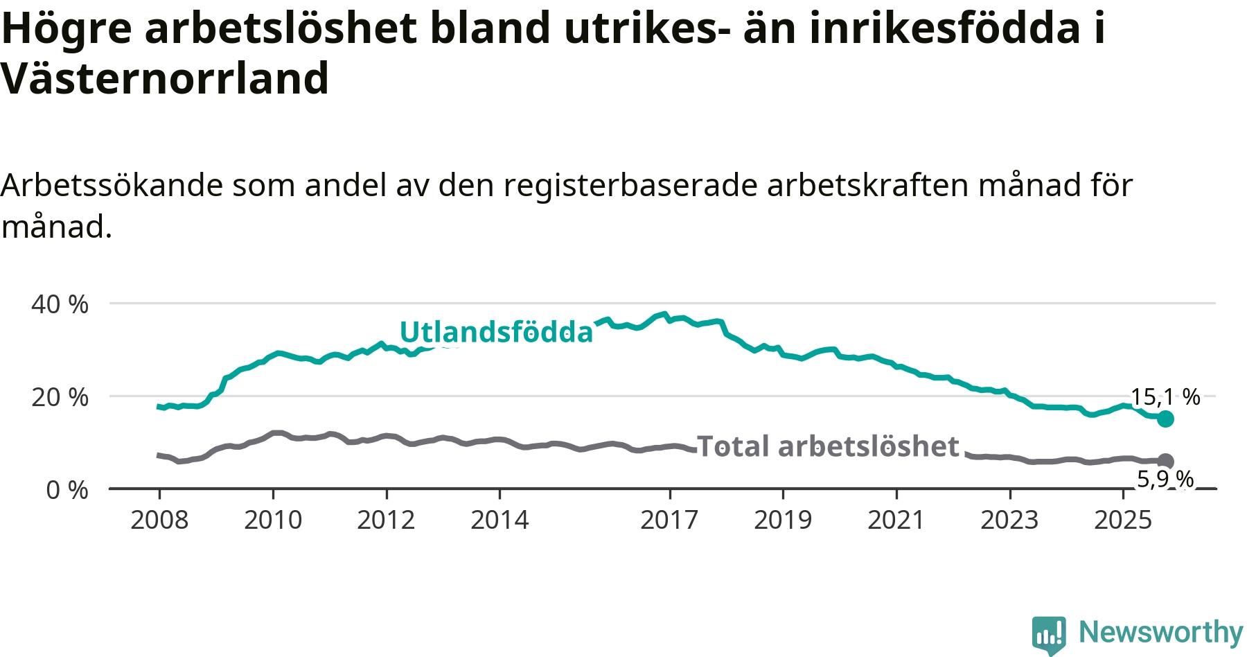 Arbetslösheten bland utlandsfödda var 15,1 procent i Västernorrland under oktober månad, motsvarande 2 515 av 16 656 personer. Det är 1,6 procentenheter färre än vid samma tidpunkt i fjol (−232 om man räknar personer). Den nuvarande arbetslöshetsnivån är den lägsta sedan januari 2008.