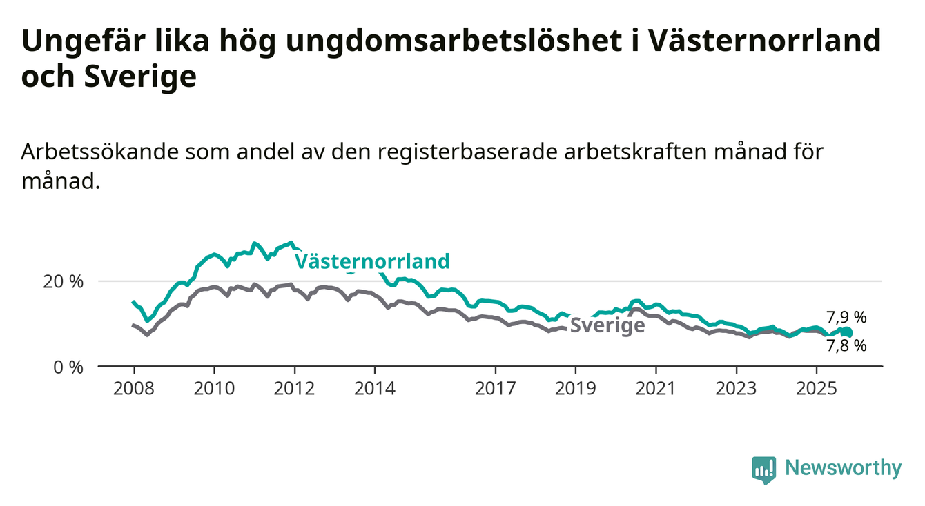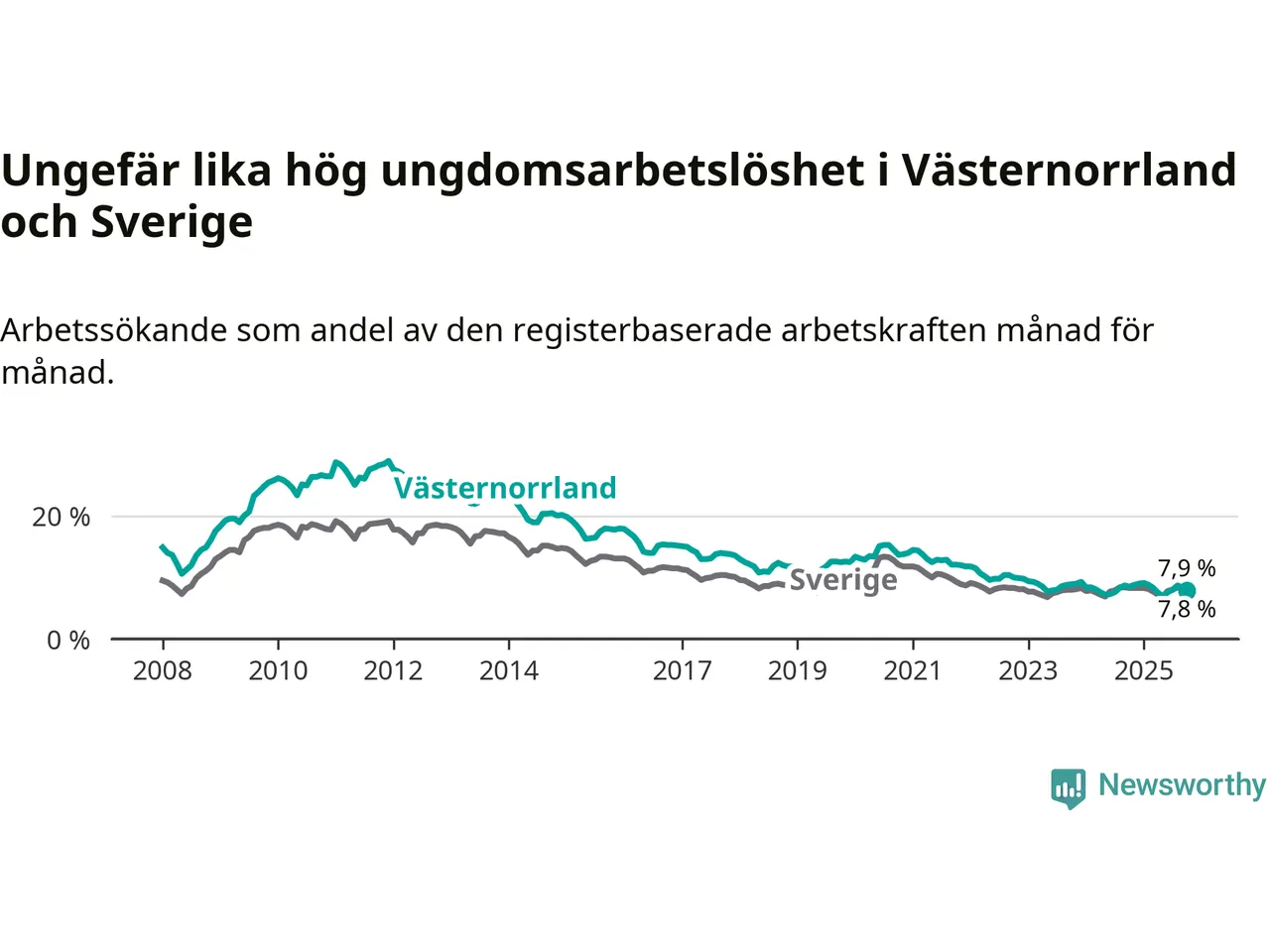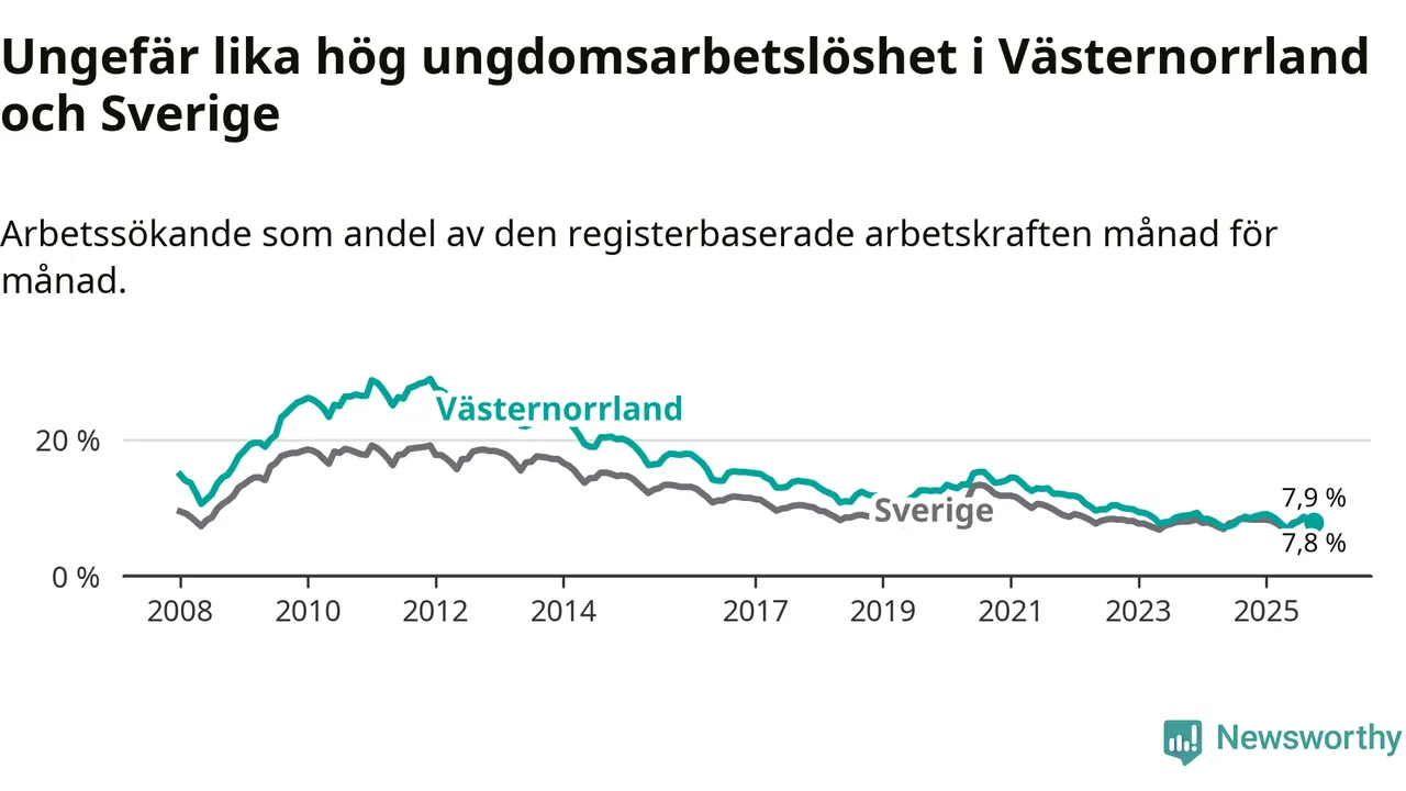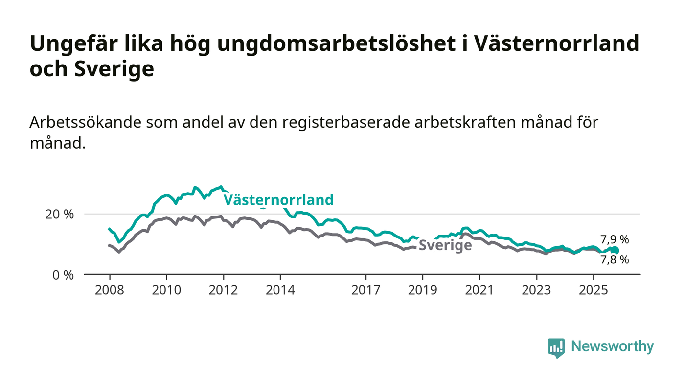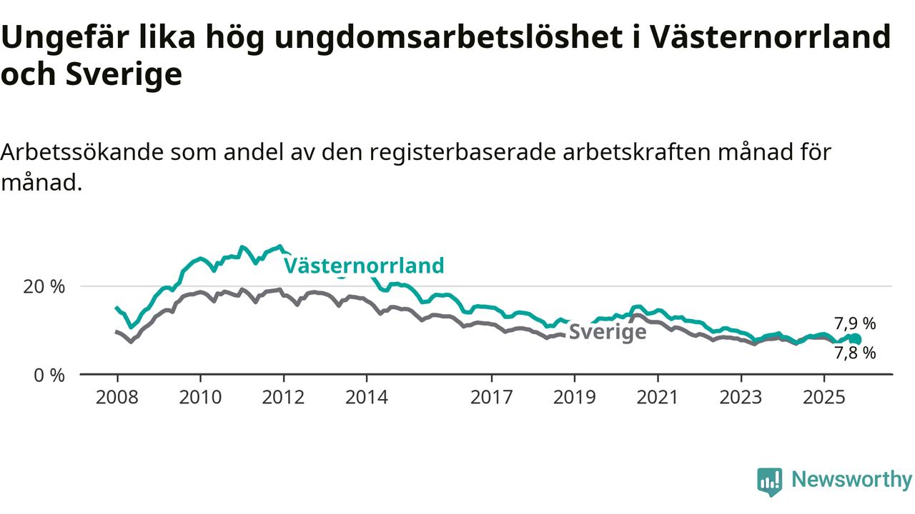 Medan Västernorrland har lägre total arbetslöshet än Sverige, ligger ungdomsarbetslösheten på i stort sett samma nivå.
